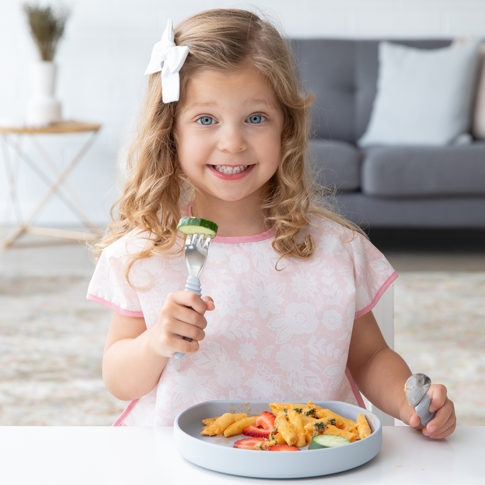 Your child won’t realize they’re wearing a bib as they slip on this short-sleeved toddler bib that features a large catch-all pocket to help contain spills, crumbs, and more. The back hook-and-loop closure allows for a quick, adjustable, and tug-proof fit. Wipeable and machine washable for easy cleaning so you can use it over and over again!