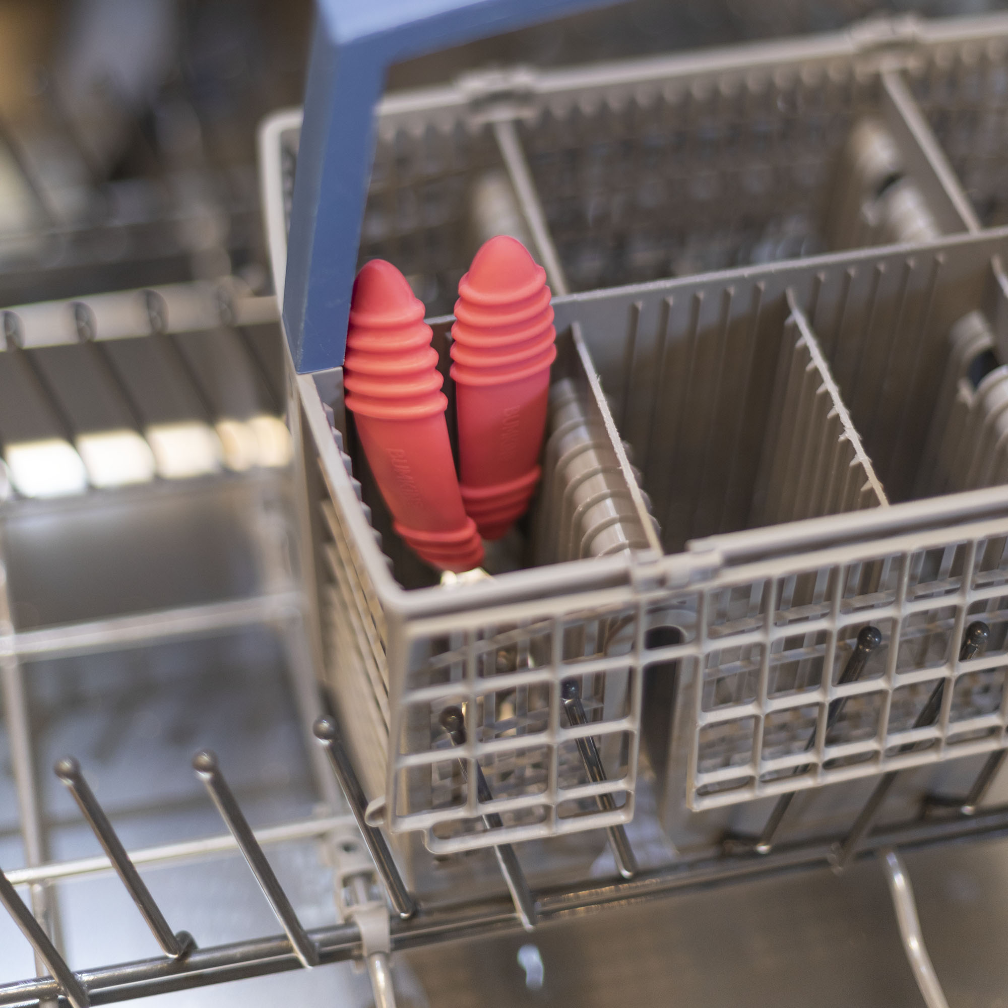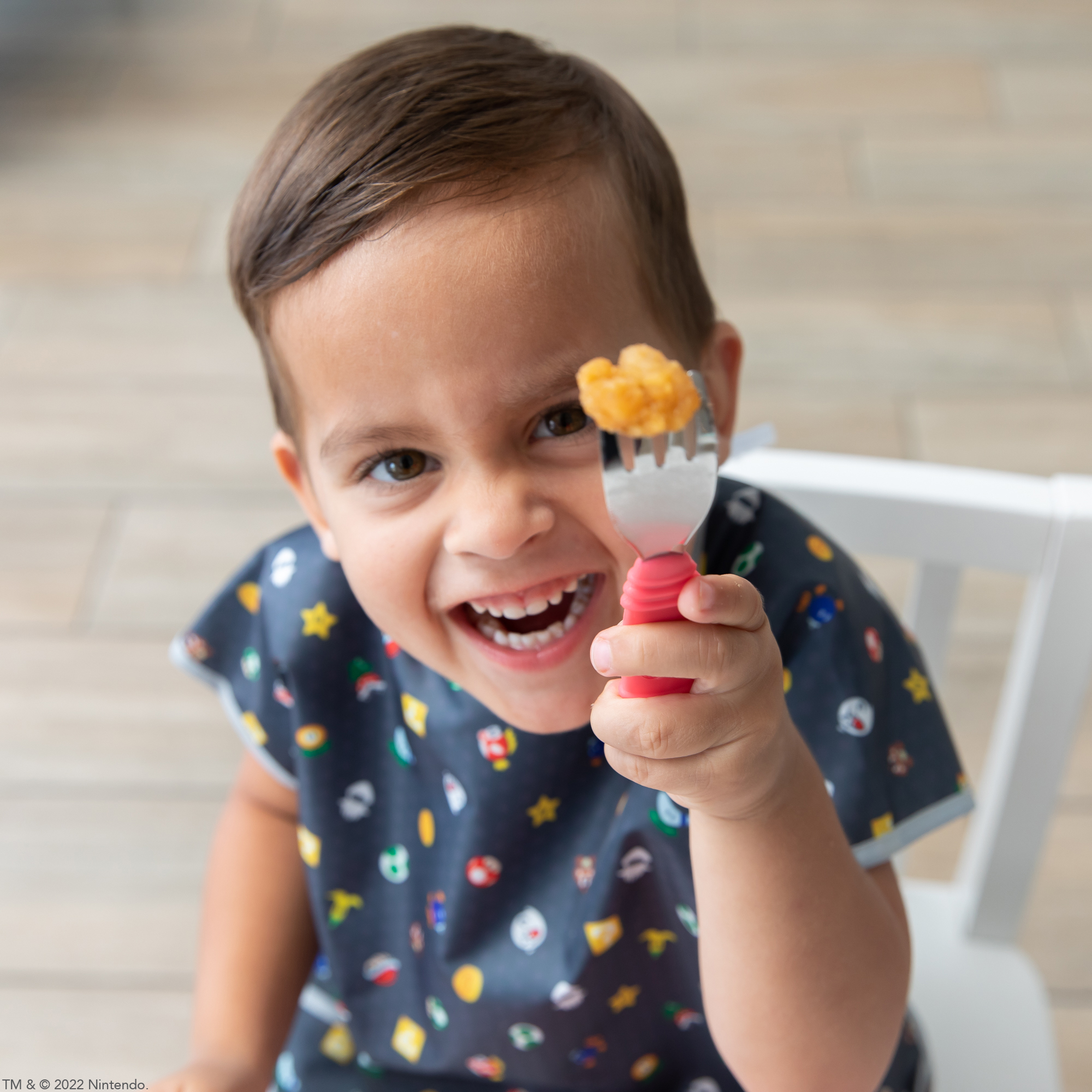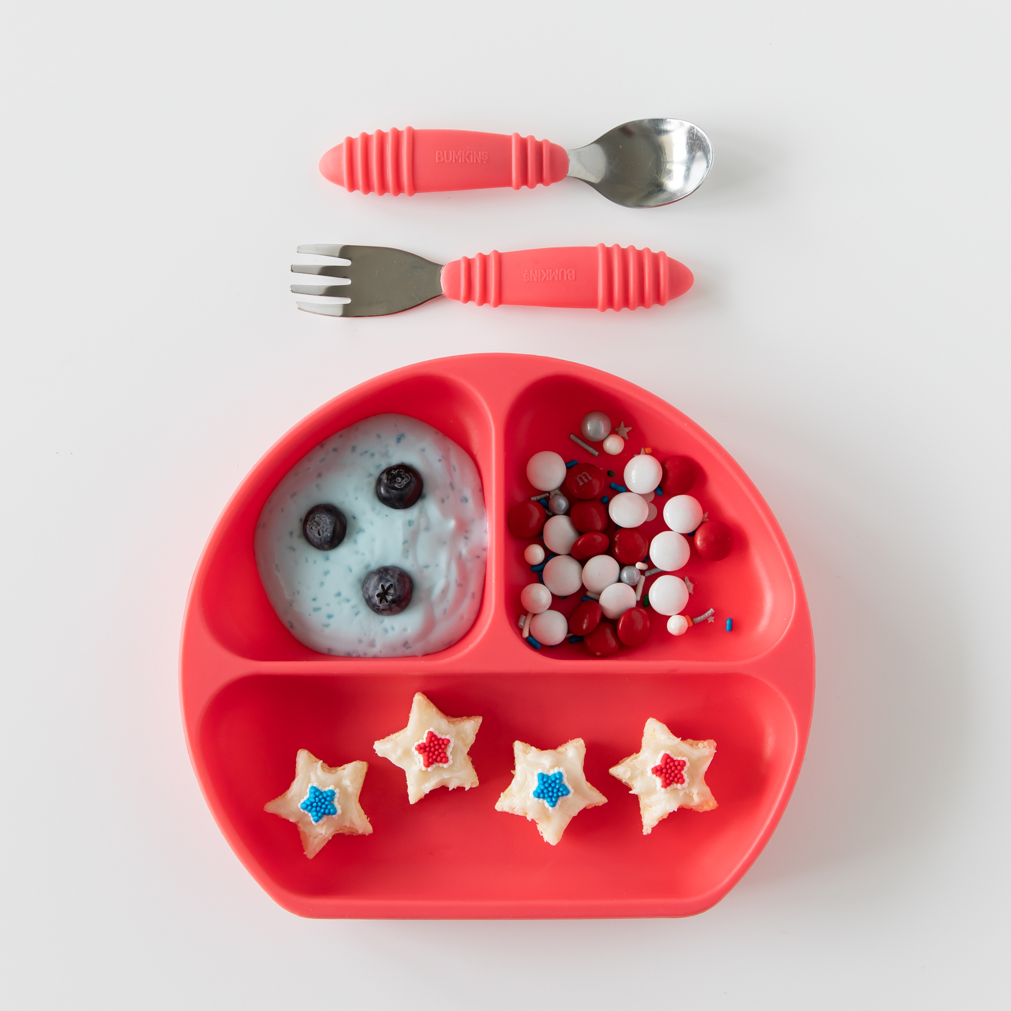 Little ones can dig into mealtime with our Spoon + Fork Set. Stainless steel fork and spoon heads are sized and shaped for toddlers. The concave heads help keep food on the fork or spoon, helping promote self-feeding with solid foods. The outer fork tines are bent to help spear foods and keep food on the fork. Handles are textured silicone so they’re easy-to-grip. Safe to use – made from 100% food-safe silicone.