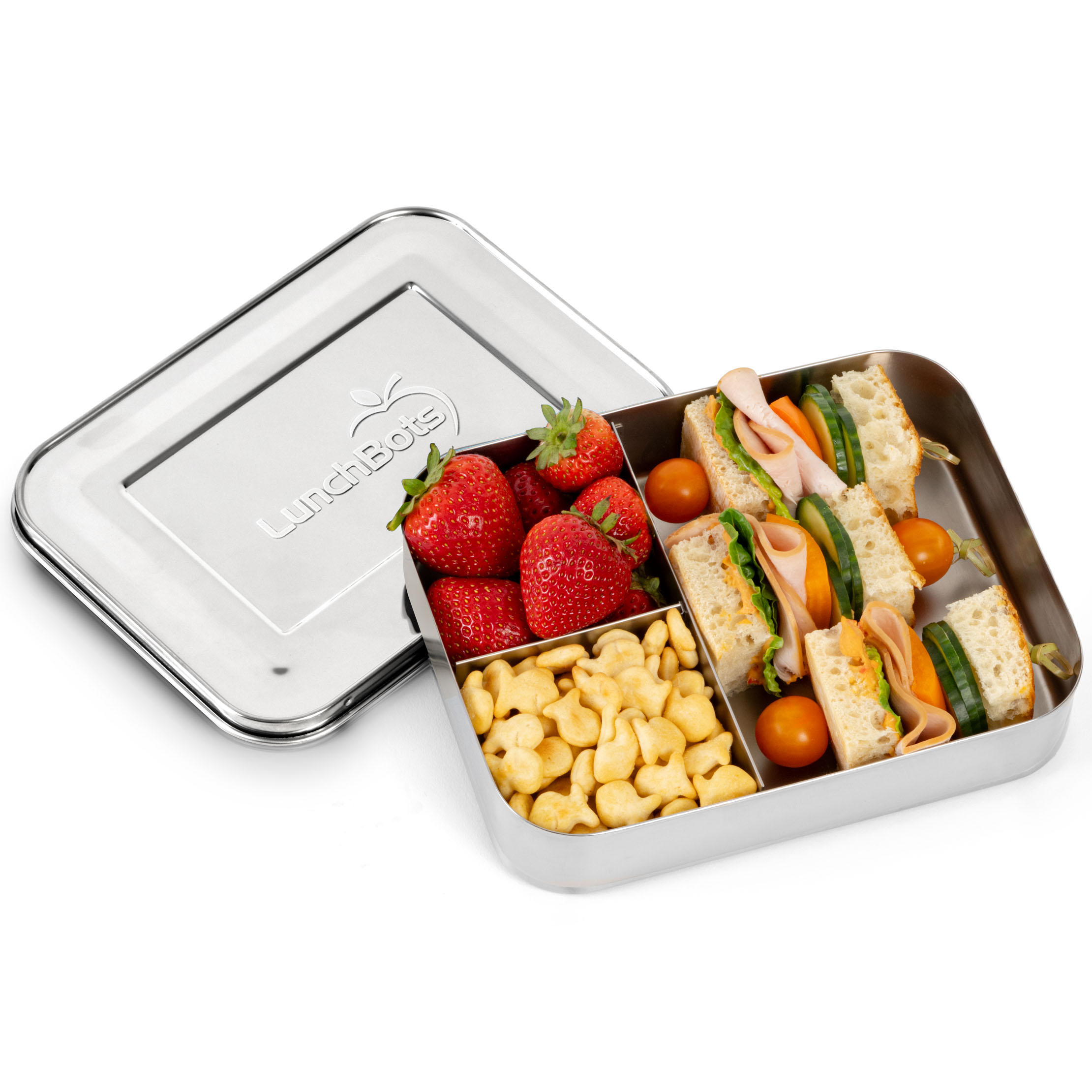 Diese geräumige Bento-Box aus Edelstahl mit 3 Fächern bietet Platz für ein komplettes Sandwich und zwei Beilagen. Sandwich-Fans jeden Alters lieben die Large Trio, denn in diesem einzigen Behälter ist genug Platz für ein ganzes Mittagessen.