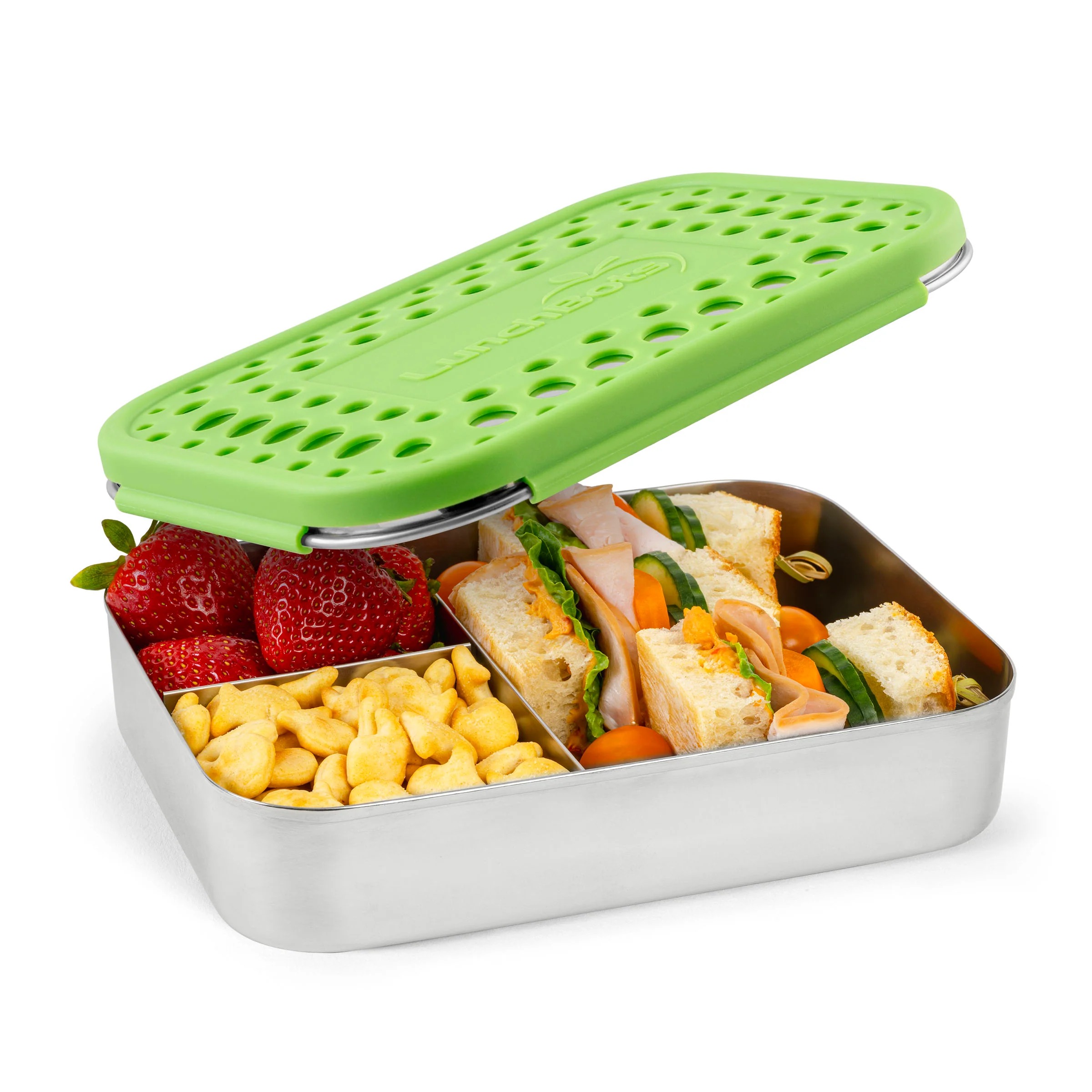 Diese geräumige Bento-Box aus Edelstahl mit 3 Fächern bietet Platz für ein komplettes Sandwich und zwei Beilagen. Sandwich-Fans jeden Alters lieben die Large Trio, denn in diesem einzigen Behälter ist genug Platz für ein ganzes Mittagessen.