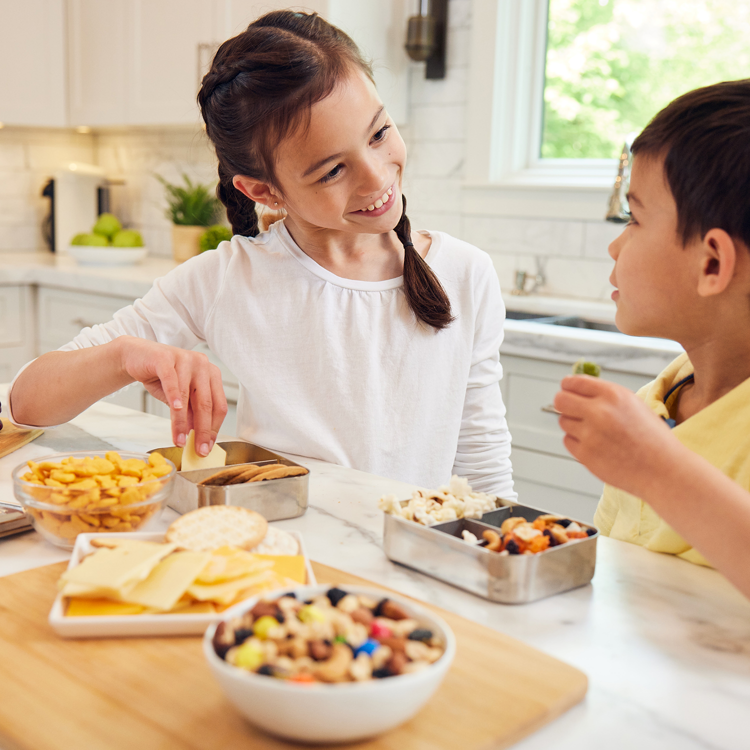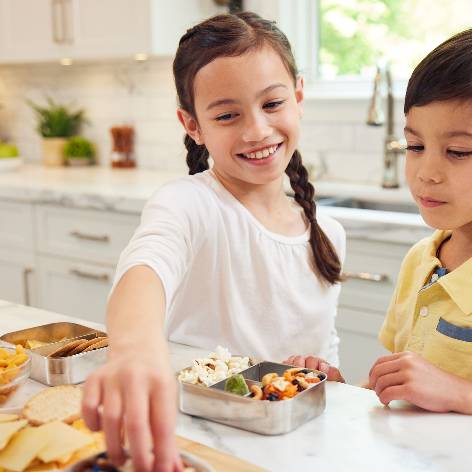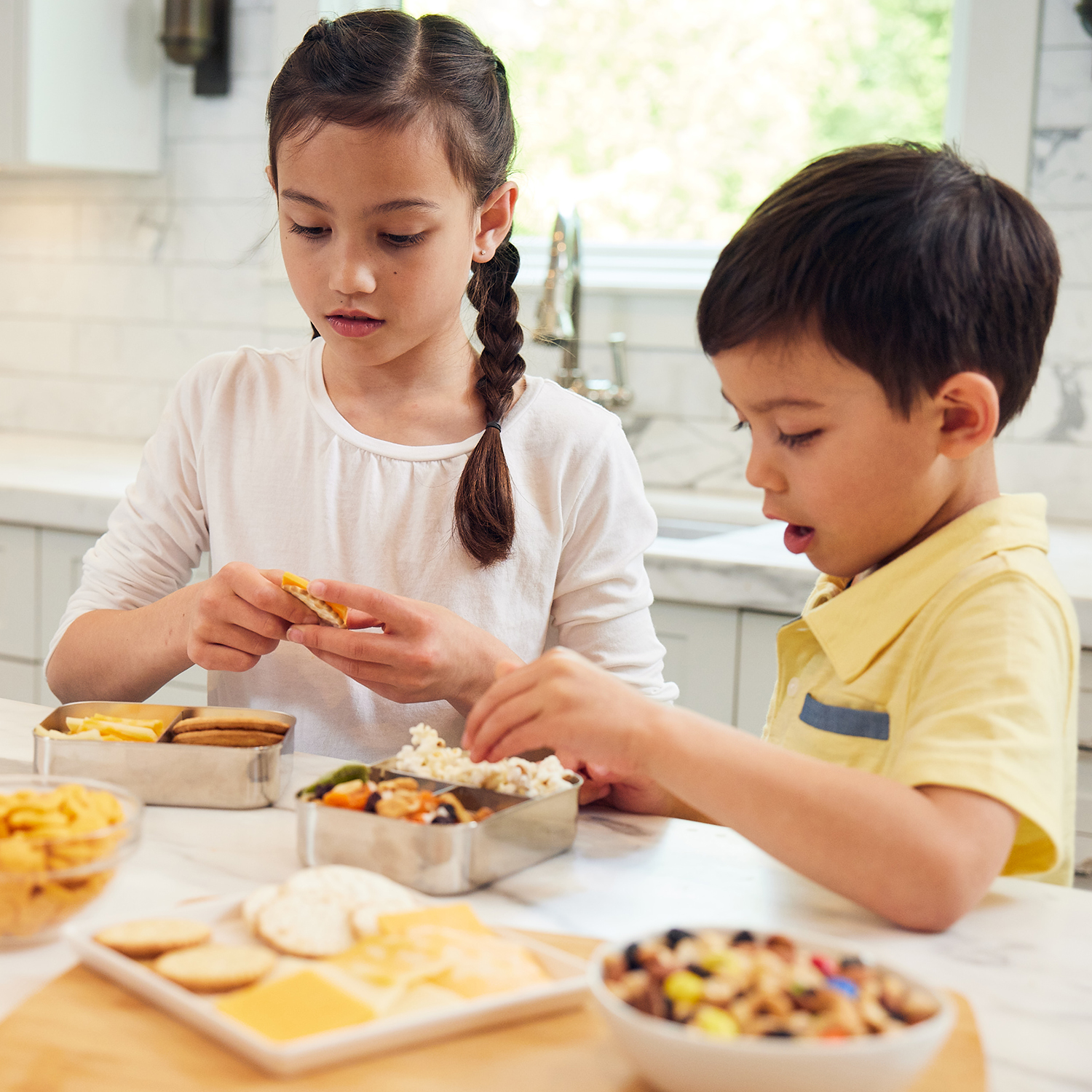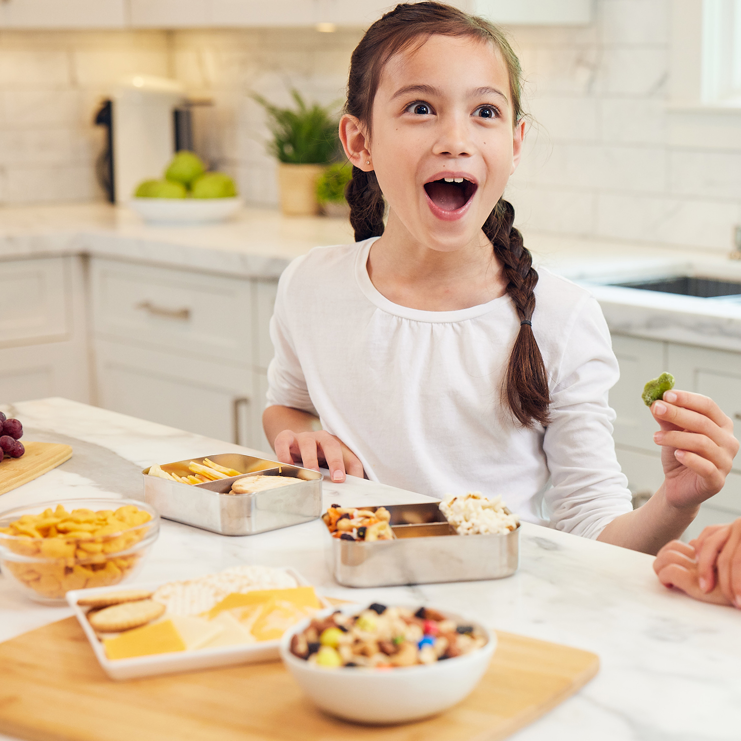 Diese Bento-Box aus Edelstahl mit zwei Fächern eignet sich perfekt, um kleine Snack-Kombinationen für unterwegs mitzunehmen. Genießen Sie Cracker und Käse, Rosinen und Nüsse, frische Weintrauben und Apfelspalten... die Möglichkeiten für Snack-Duos sind endlos.