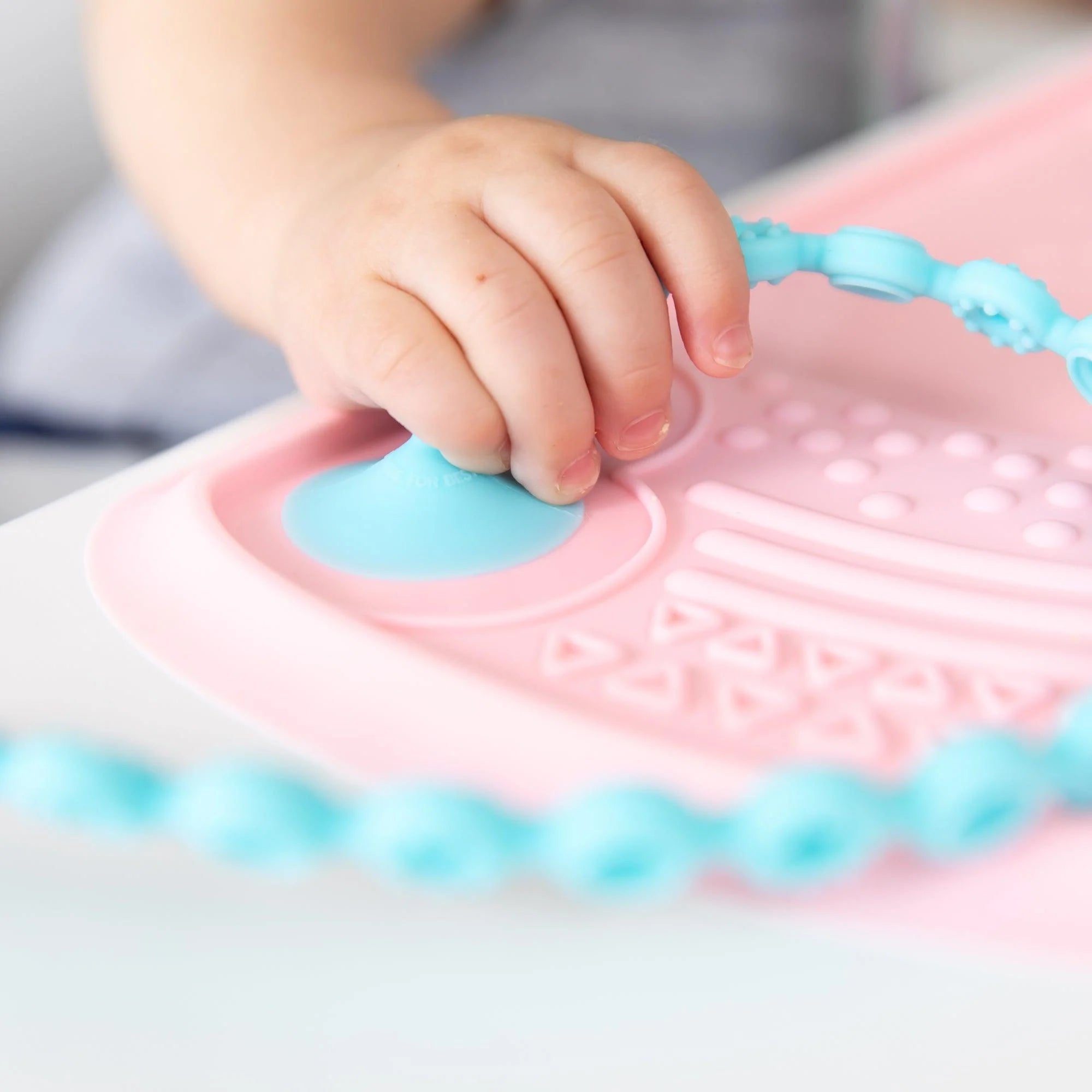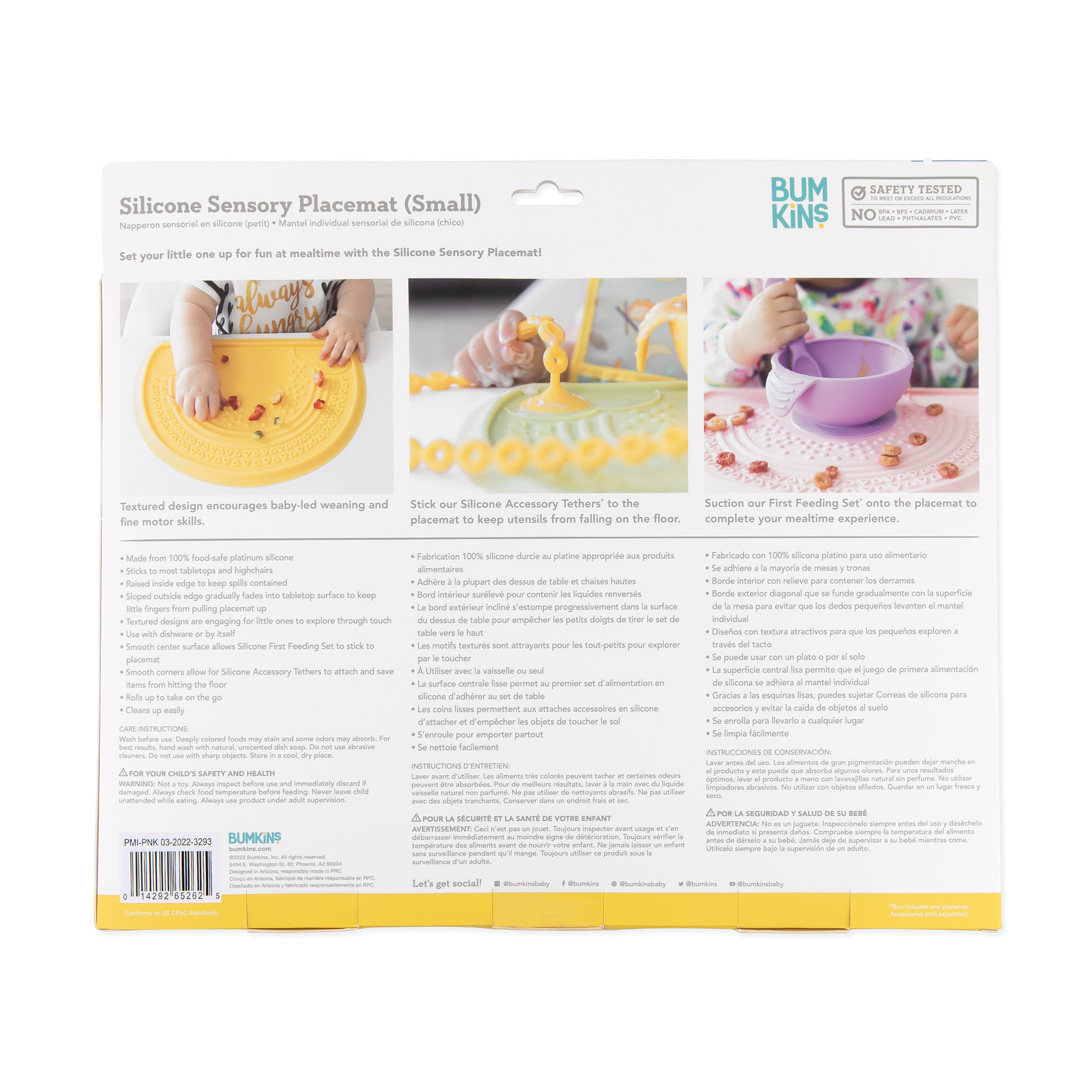 Das Bumkins Sensorische Tischset aus Silikon wurde entwickelt, um Oberflächen sauber zu halten und die Kleinen während der Essenszeit zu Hause oder unterwegs zu beschäftigen. Als umweltfreundliche Alternative zu Papptellern lässt sich unser leichtes Tischset an den meisten Tischen befestigen und aufrollen, um es beim Essen unterwegs einfach zu verstauen. Die erhöhte Innenkante fängt Essen und verschüttete Flüssigkeiten auf, während die Außenkante abgeschrägt ist, um sich an die Tischkante anzupassen, so dass es für die Kleinen schwieriger ist, sie hochzuziehen. Außerdem regen die lustigen, strukturierten Muster auf der Oberfläche den Tastsinn der Kleinen während der Mahlzeit an oder bieten lustige Formen für sensorische Spiele!