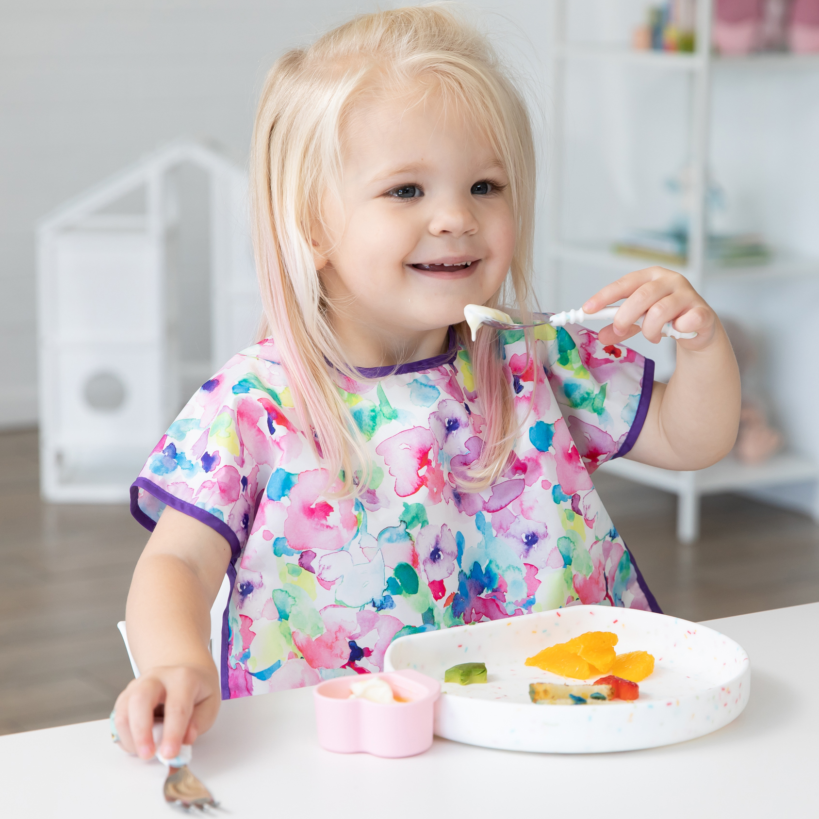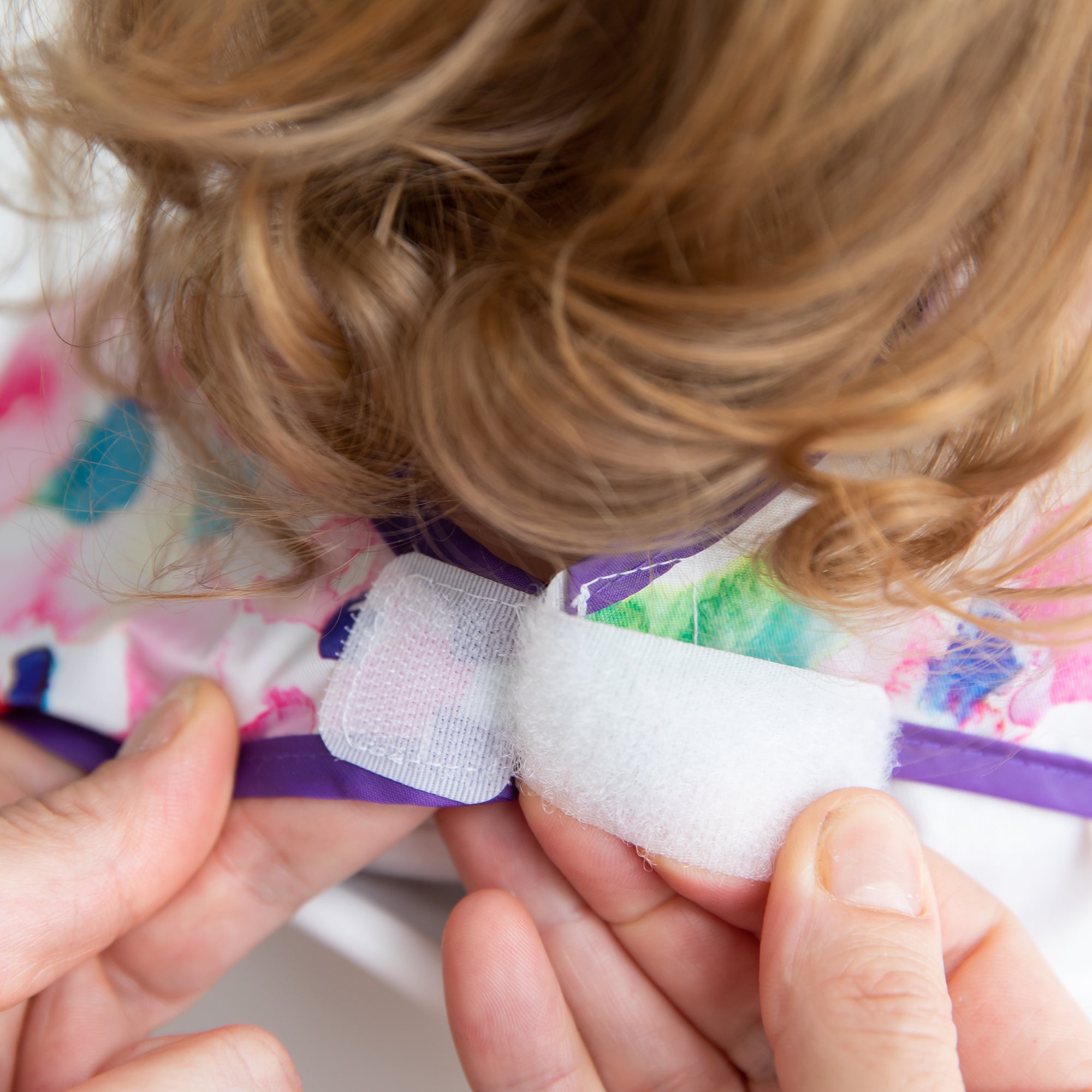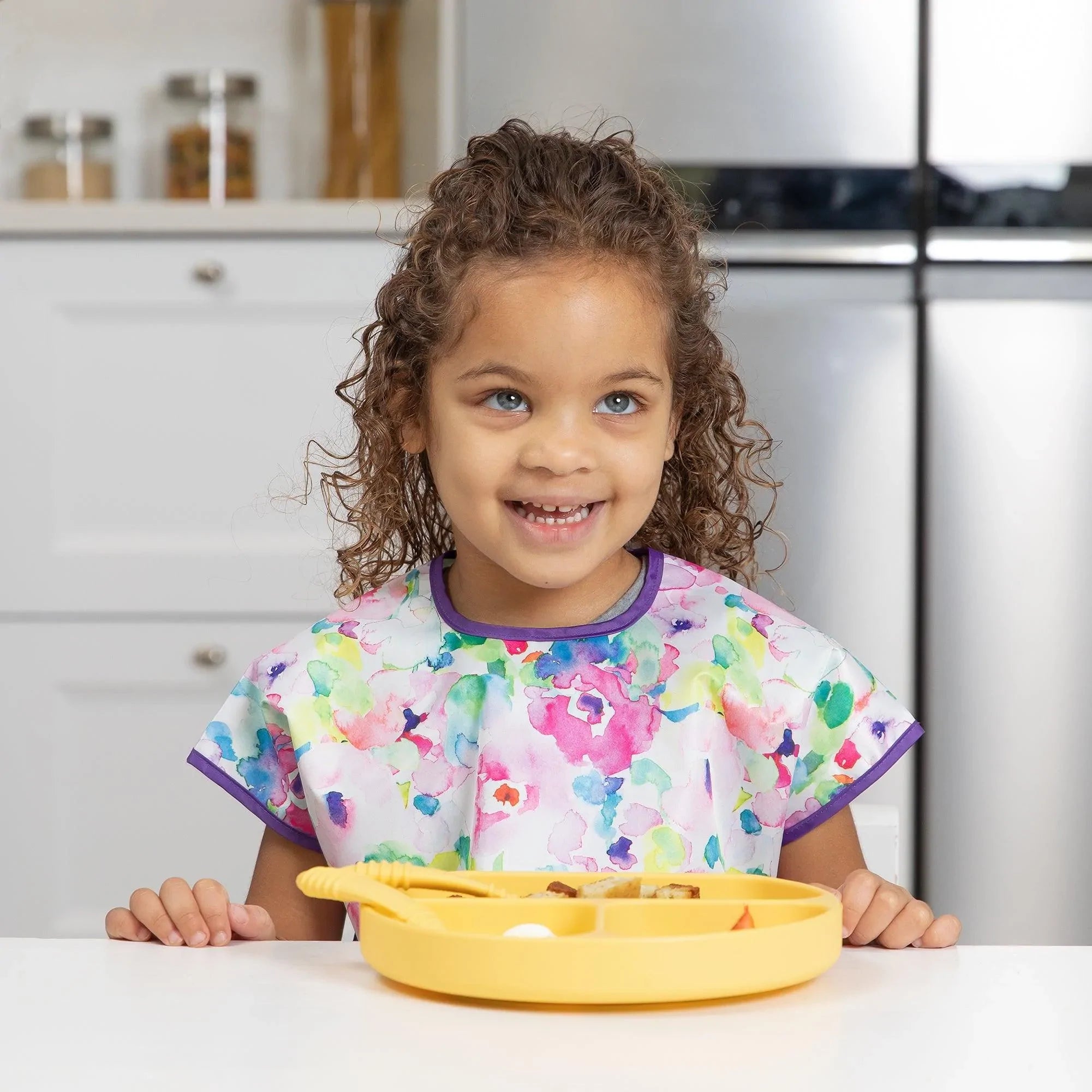 Your child won’t realize they’re wearing a bib as they slip on this short-sleeved toddler bib that features a large catch-all pocket to help contain spills, crumbs, and more. The back hook-and-loop closure allows for a quick, adjustable, and tug-proof fit. Wipeable and machine washable for easy cleaning so you can use it over and over again!