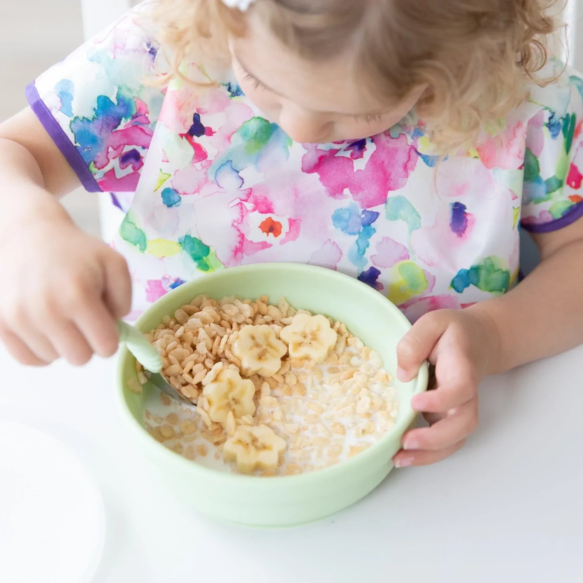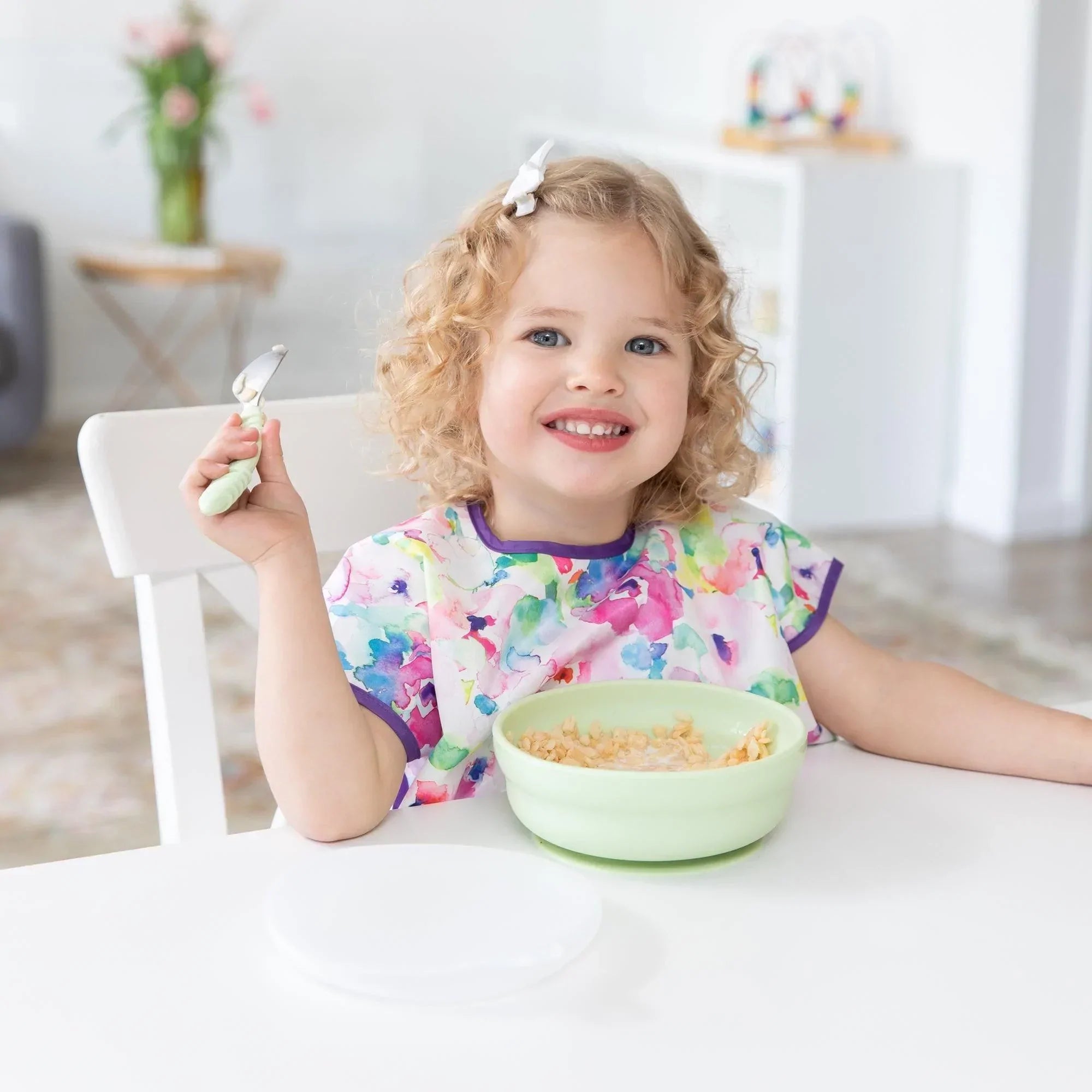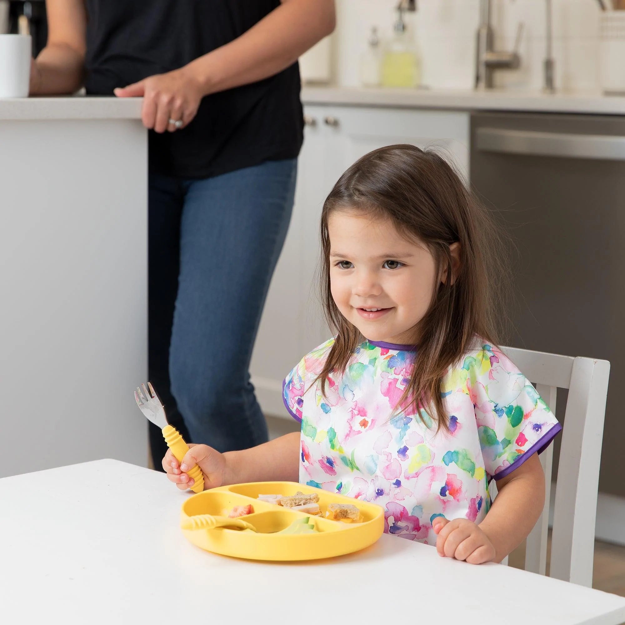 Your child won’t realize they’re wearing a bib as they slip on this short-sleeved toddler bib that features a large catch-all pocket to help contain spills, crumbs, and more. The back hook-and-loop closure allows for a quick, adjustable, and tug-proof fit. Wipeable and machine washable for easy cleaning so you can use it over and over again!