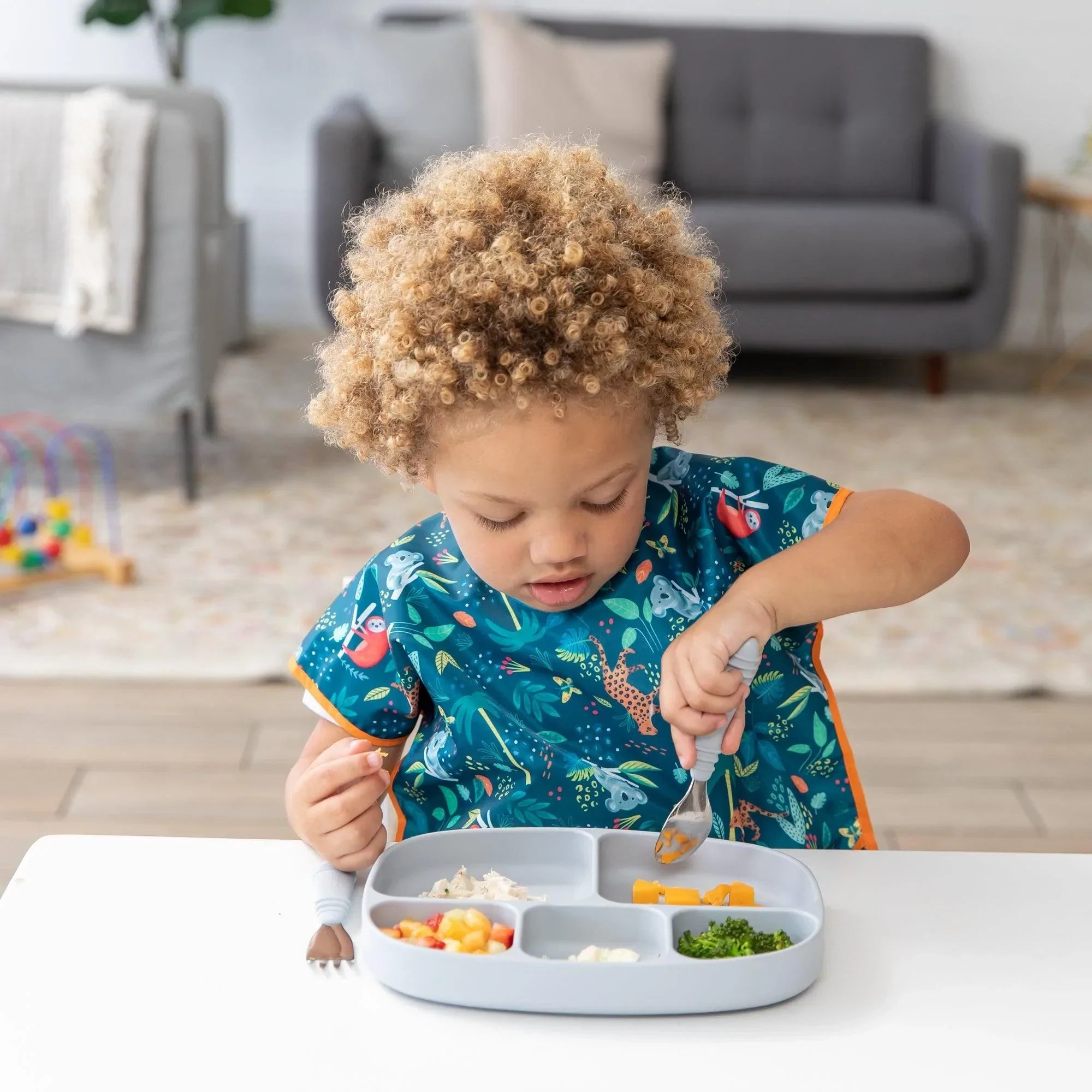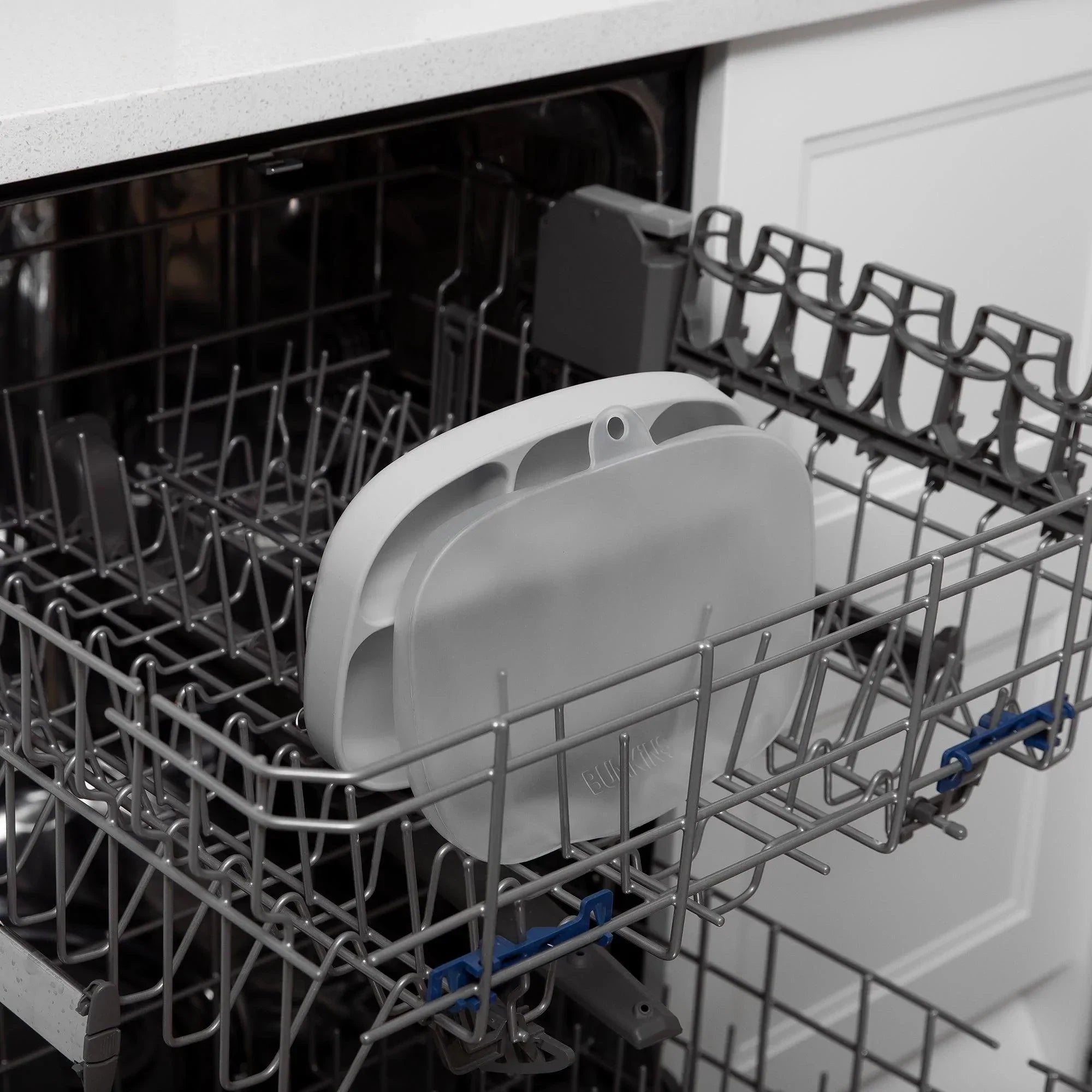 Can we get a high five for the new five-section version of the original Silicone Grip Dish? With a leak-resistant lid, it’s great for storing leftovers or prepping meals! Write on the lid, labeling leftovers—use a washable, dry-erase or wet-erase marker. Made from 100% food-safe silicone, the dish is as durable and versatile as the original version, just with added sections for more food fun. Perfectly sized for toddler portions—there are two large sections that hold approximately 9 oz each, two smaller sections hold approximately 3 oz each, and one 4 oz section; all with deep walls to help contain food. The Grip Dish can be safely put in the microwave, oven (up to 204°C), freezer, or dishwasher. A strong suction base, keeps the Grip Dish in place, making plates on the floor a thing of the past!