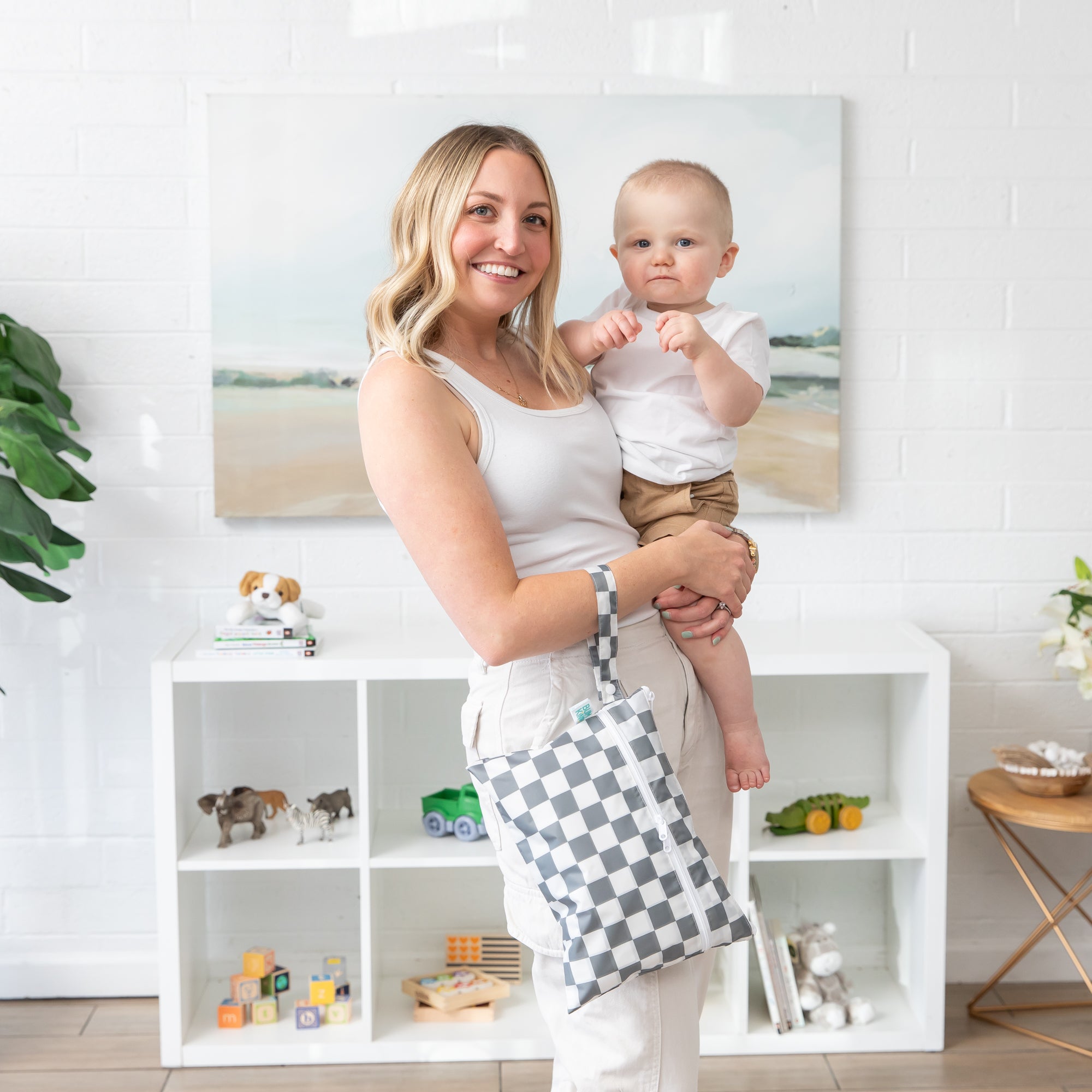 Your new on-the-go essential has arrived! Bumkins reusable Wet/Dry Clutch has everything you love about the classic Wet/Dry Bag, but in a compact, on-the-go size. The clutch features the same waterproof fabric as our SuperBib and heat-sealed seams for true waterproof protection. Two compartments with smooth zippered closures keep wet and dry items separate. Single-ply construction means no worrying about icky stuff growing between layers of fabric. Wet/Dry Clutches make great compact diaper bags and can also hold dirty clothes and wet swimsuits. These bags make excellent organizers for toys, accessories, toiletries, electronics, travel and more! With a snap handle, snap your bag wherever you need it – stroller, changing table or suitcase. Bags are non-gusseted, non-insulated and non-stretch.