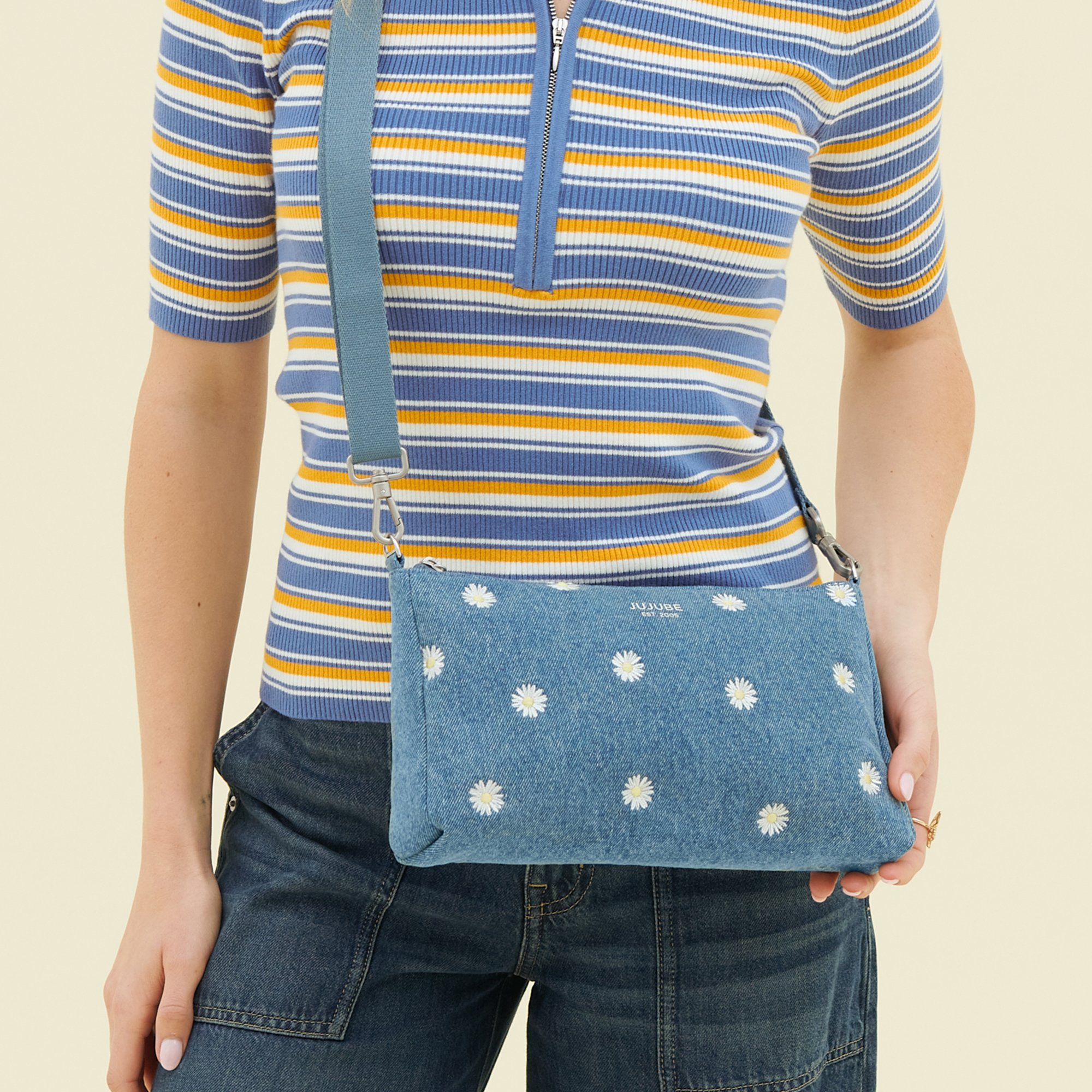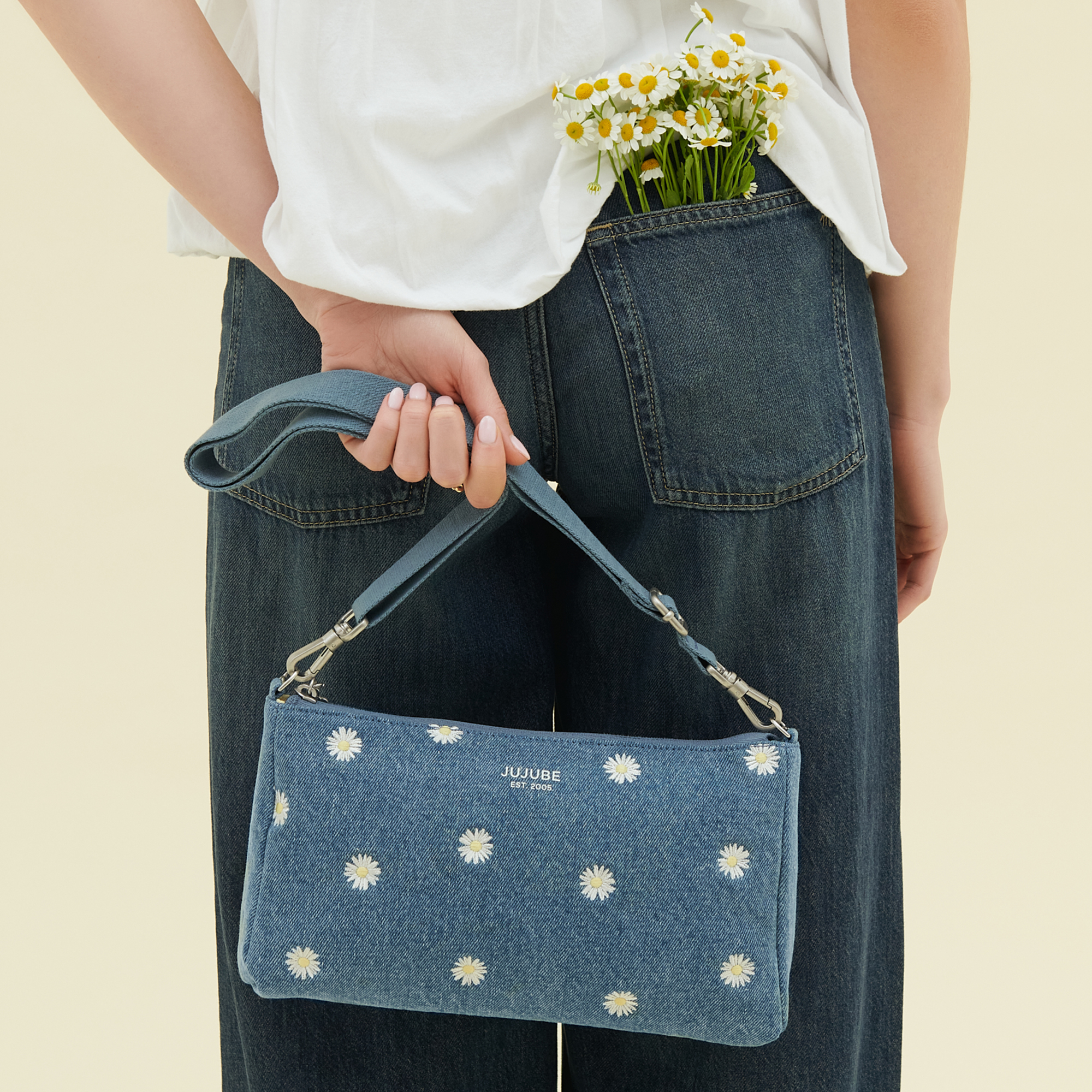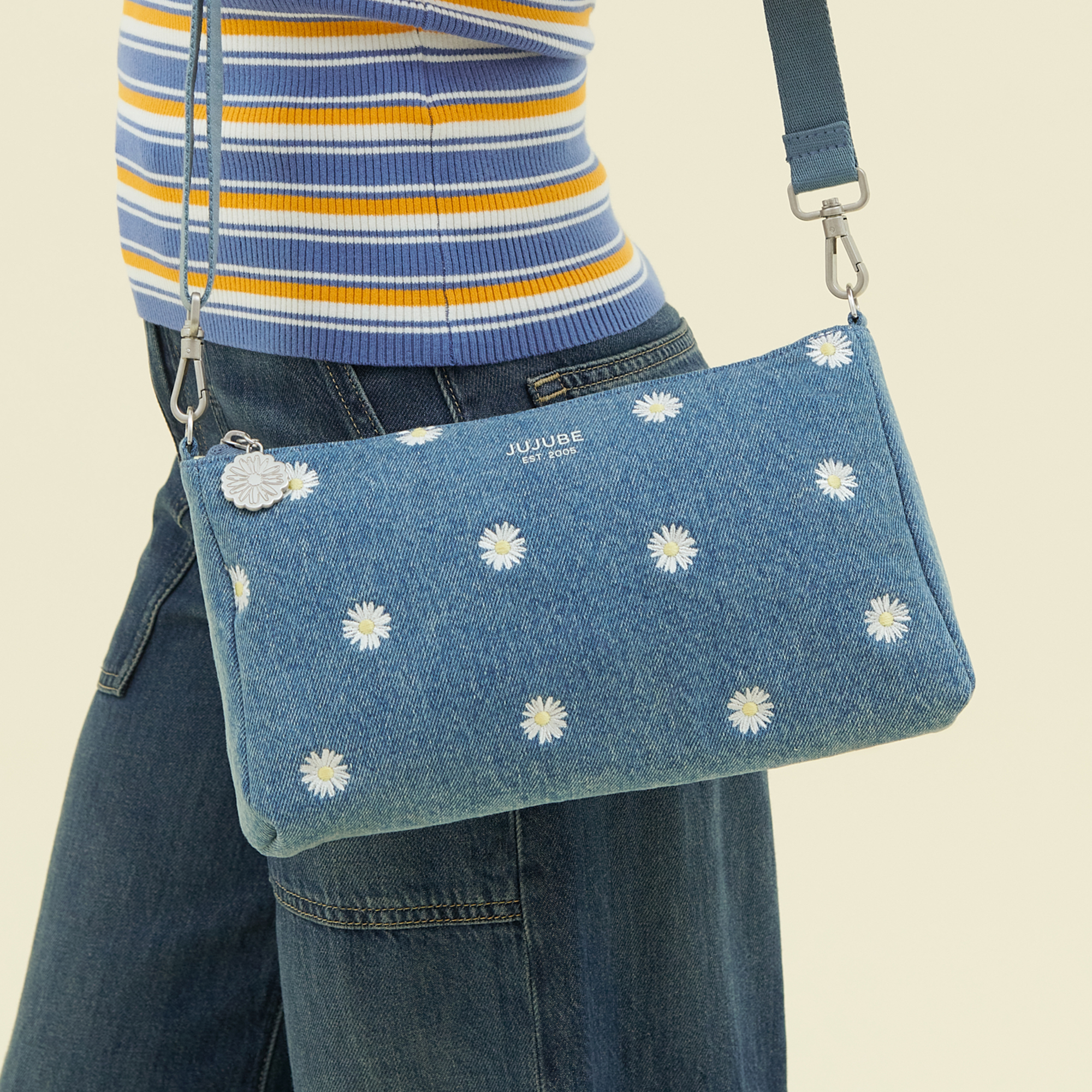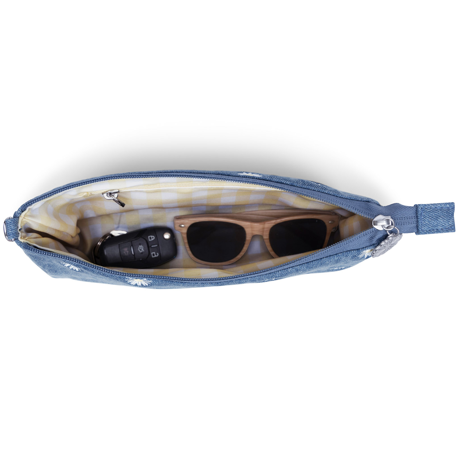 You know how it goes—always on the hunt for those essentials. Keep everything organized with the stylish, machine-washable 3-Piece Pouch Set from JuJuBe, perfect for stashing diapers, wipes, sunscreen, bandages, keys, and wallet, these pouches fit right into any JuJuBe diaper bag. Made with a 100% cotton exterior showcasing a light blue denim, embroidered daisies, and a cheerful yellow gingham lining, they add a handmade charm for the baby years and beyond. The large pouch even doubles as a small purse with its adjustable shoulder strap, and the detachable wristlet strap works with all three pouches. It's the ultimate win-win!
