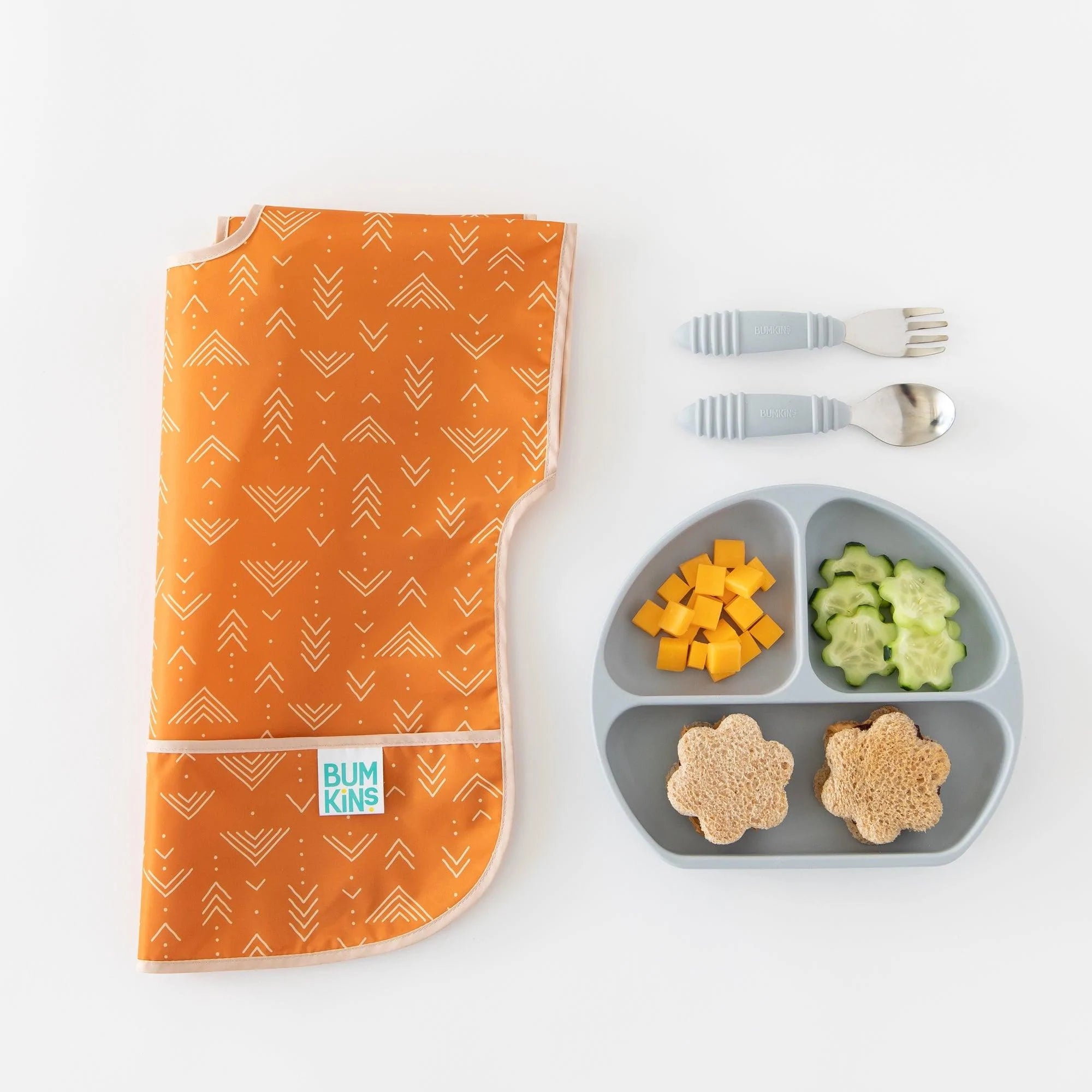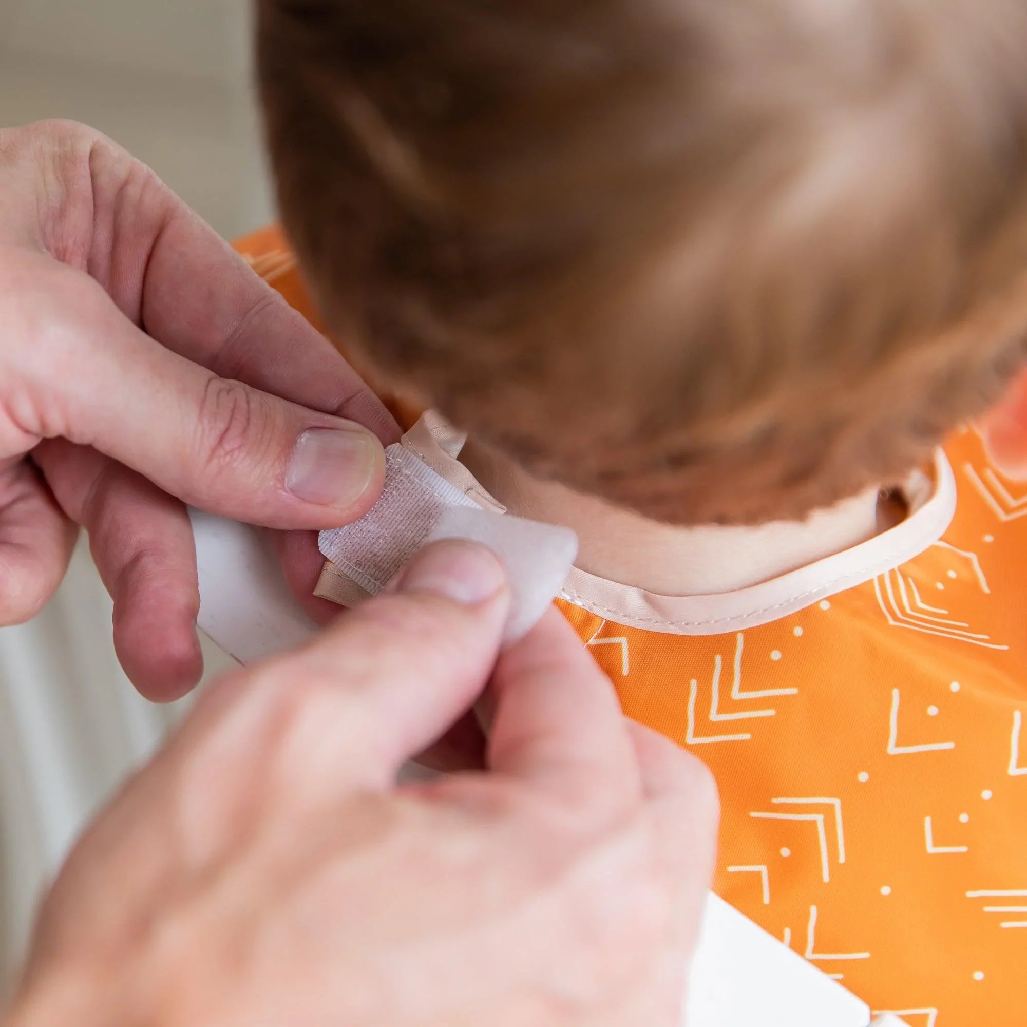Your child won’t realize they’re wearing a bib as they slip on this short-sleeved toddler bib that features a large catch-all pocket to help contain spills, crumbs, and more. The back hook-and-loop closure allows for a quick, adjustable, and tug-proof fit. Wipeable and machine washable for easy cleaning so you can use it over and over again!