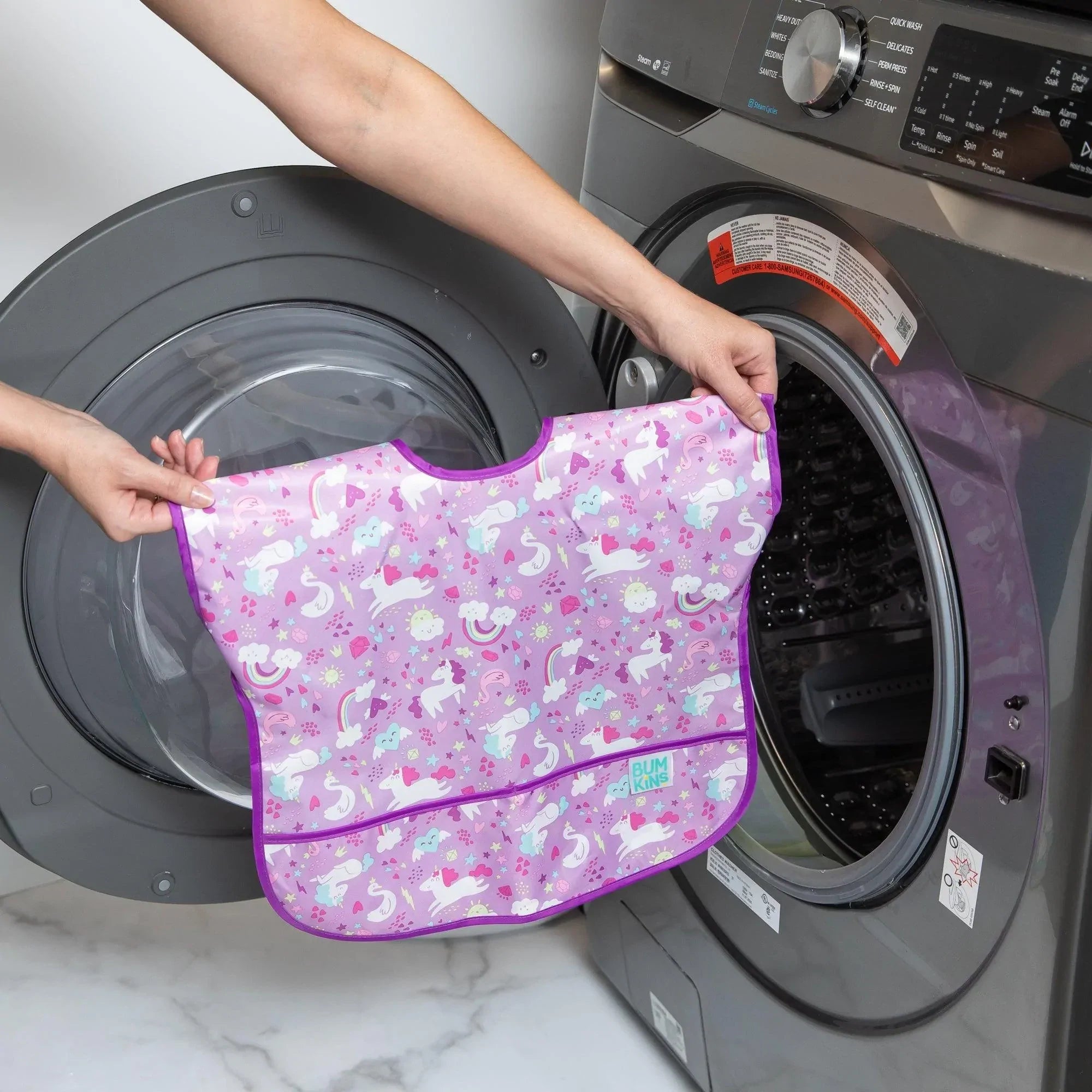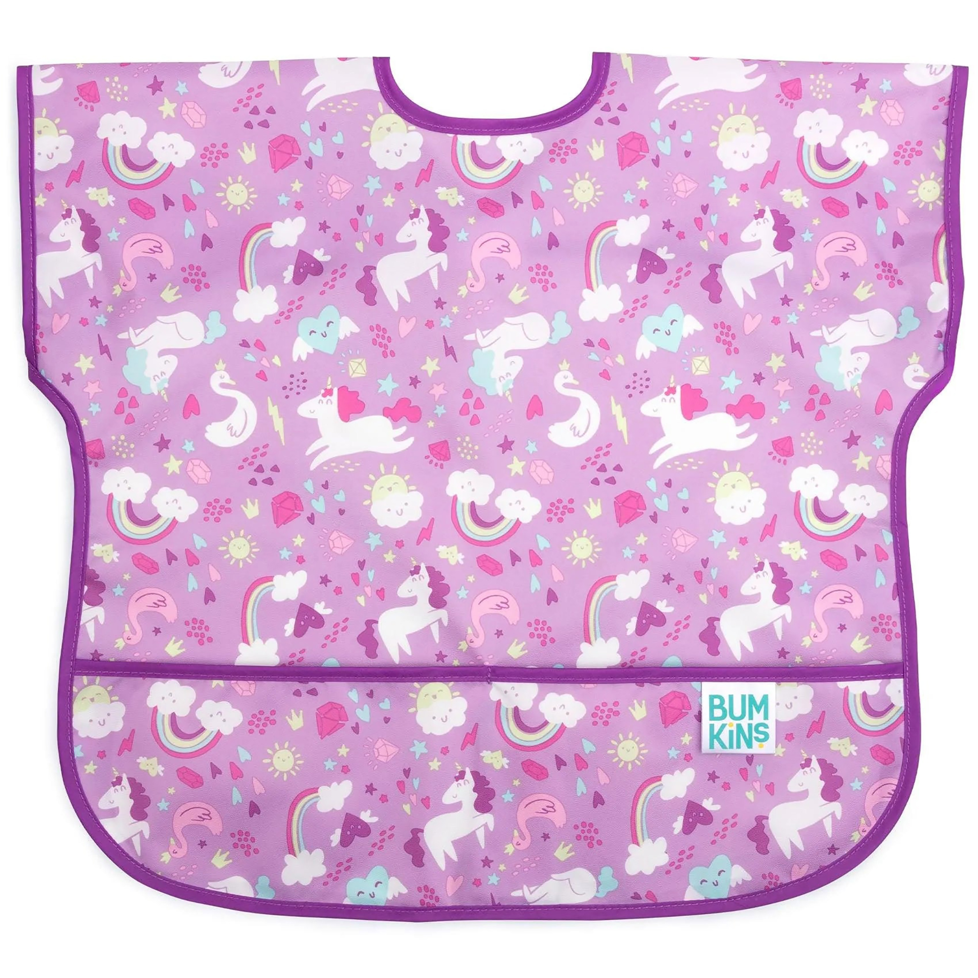 Your child won’t realize they’re wearing a bib as they slip on this short-sleeved toddler bib that features a large catch-all pocket to help contain spills, crumbs, and more. The back hook-and-loop closure allows for a quick, adjustable, and tug-proof fit. Wipeable and machine washable for easy cleaning so you can use it over and over again!