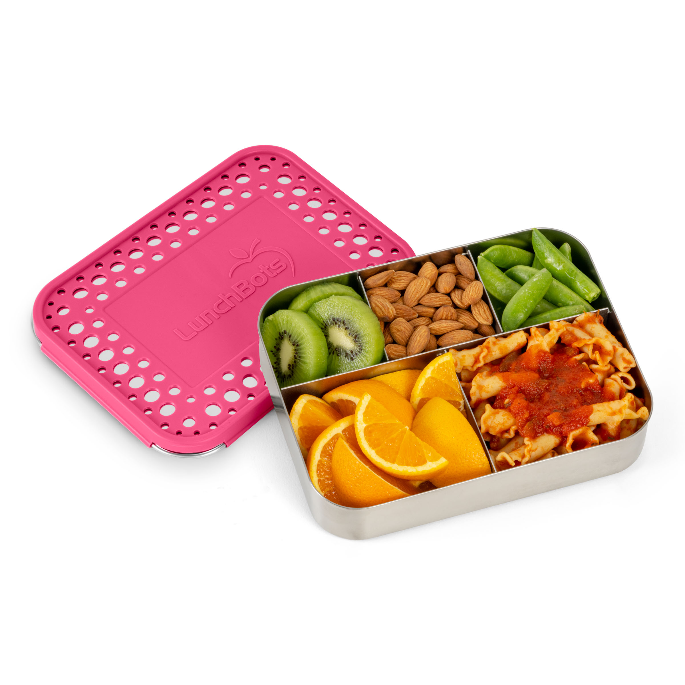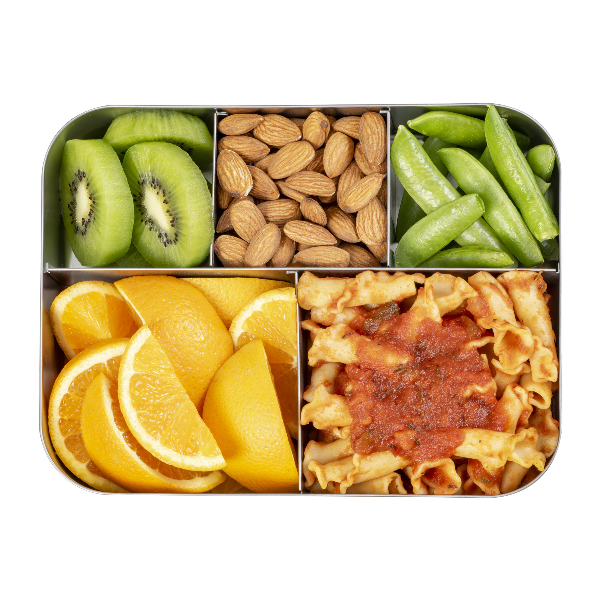 This spacious, stainless steel bento box features five compartments, making it easy for you to add variety to your child’s meal. Kids love the Cinco because it keeps food neat and separate without the need for multiple containers.