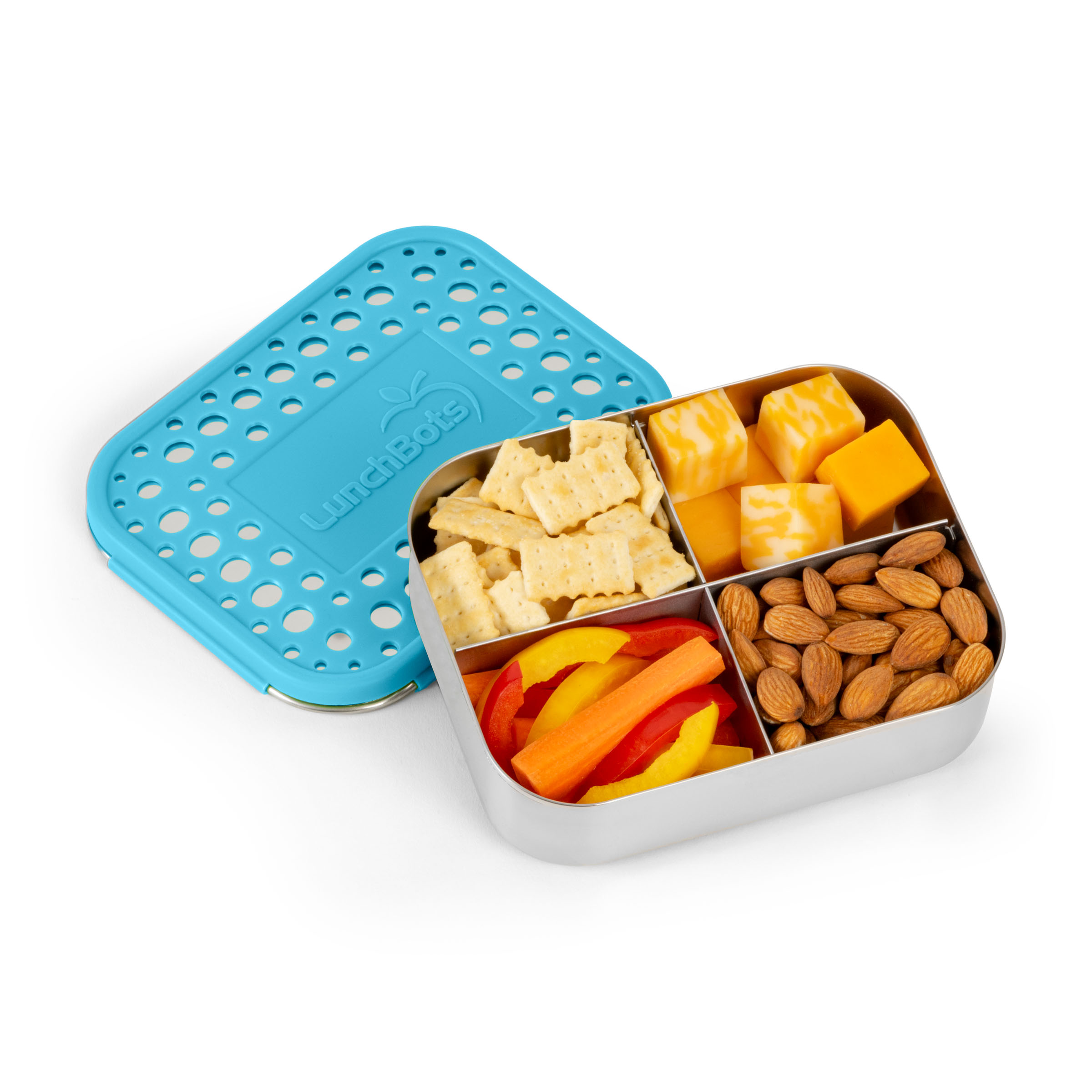 - 4-compartment bento box designed to hold a variety of snack foods.