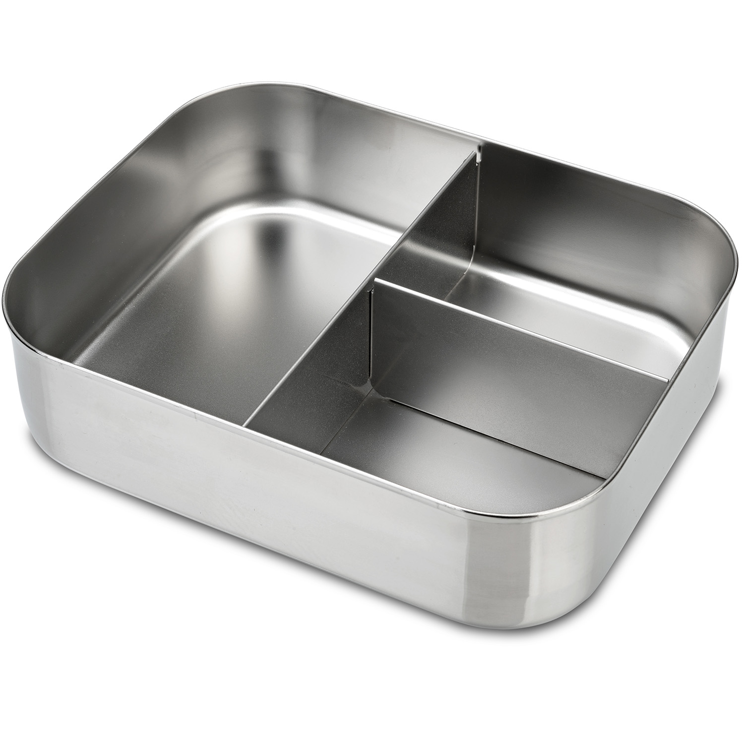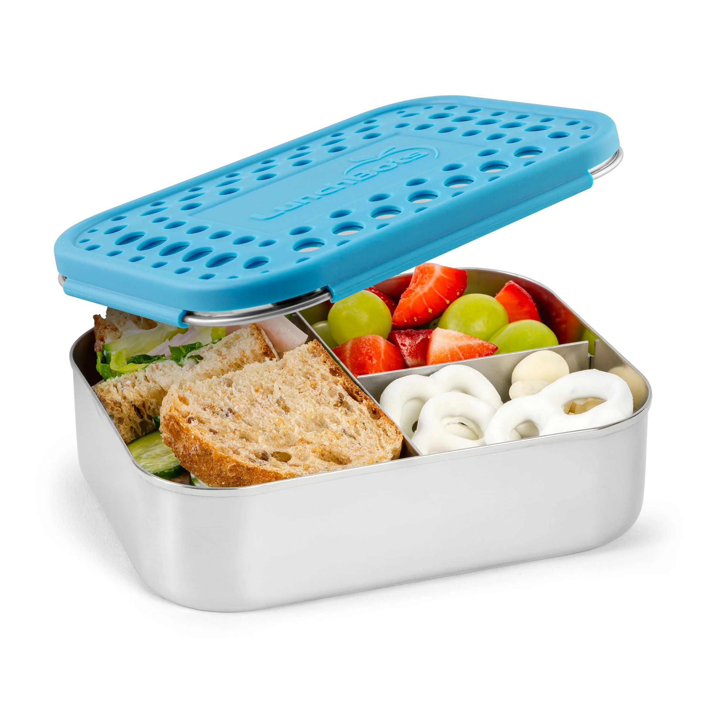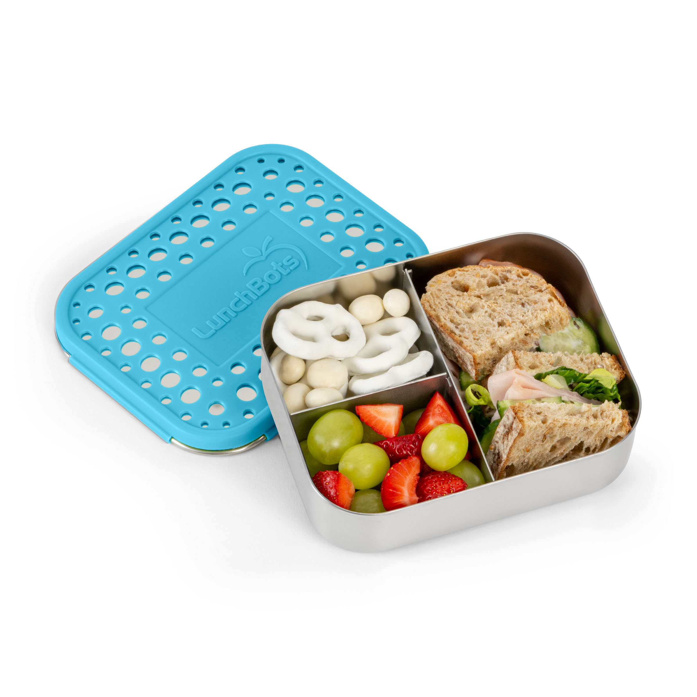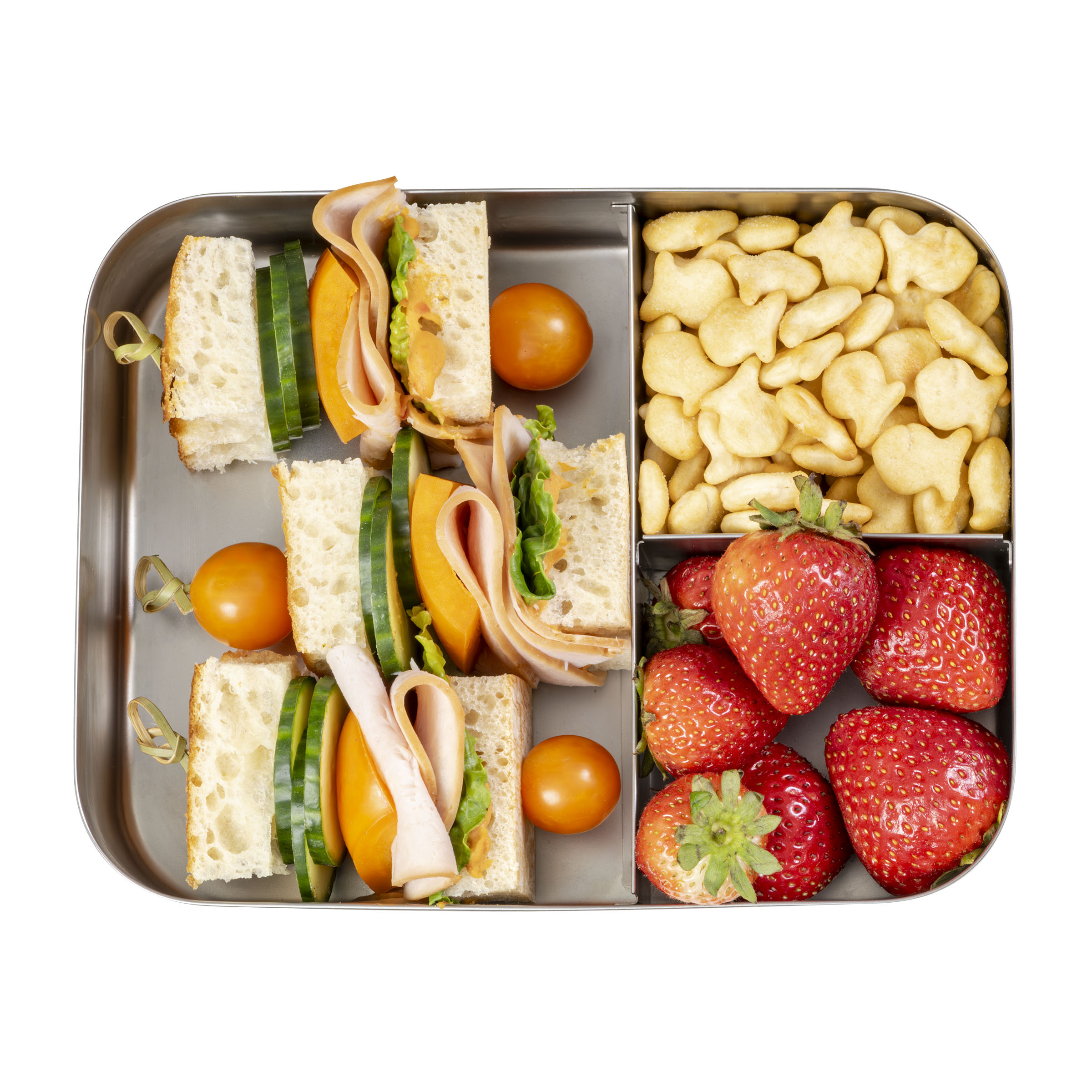 - 3-compartment bento box designed to hold a 1/2 sandwich plus 2 small sides.