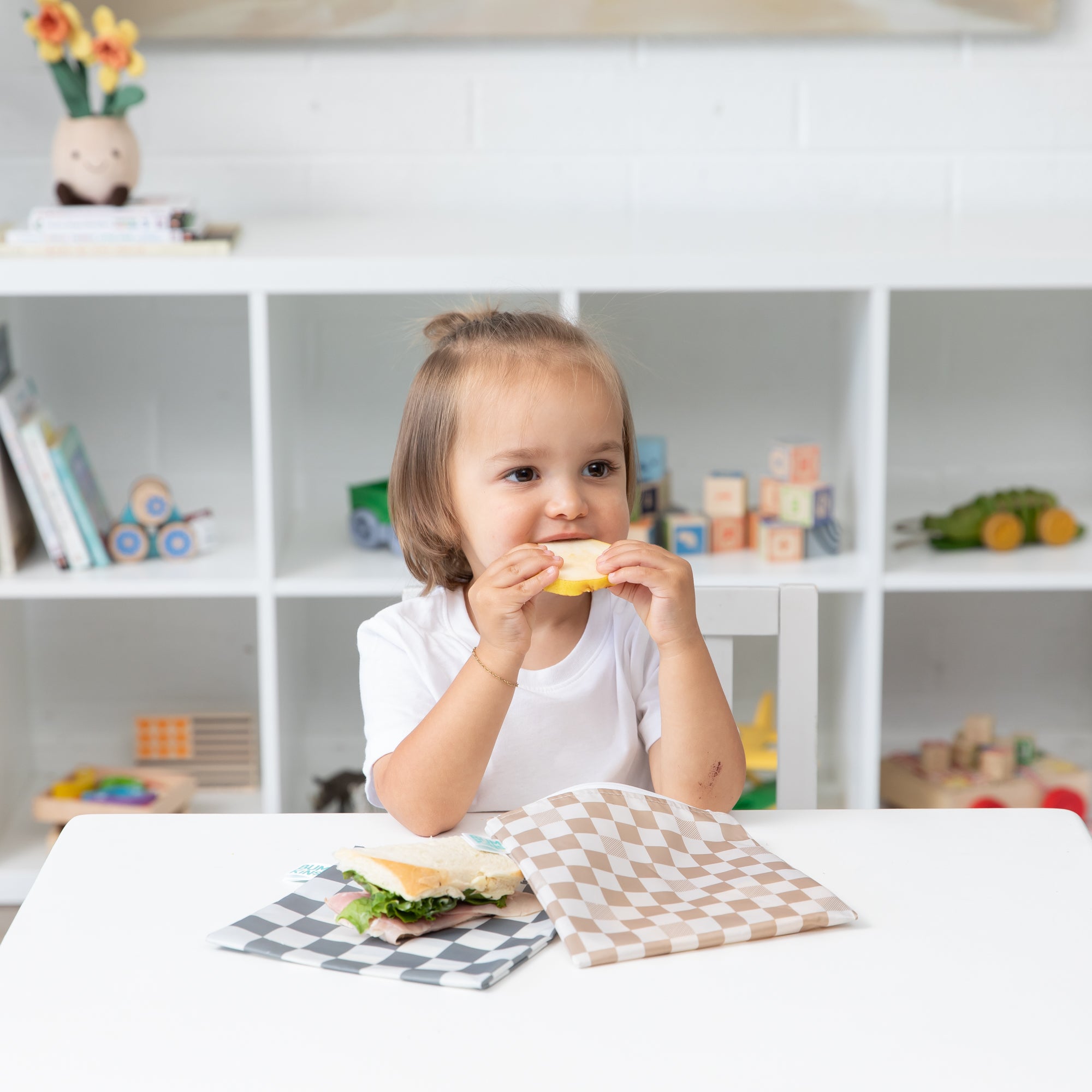 Help save the Earth, one small change at a time. An alternative to single-use plastic bags, our reusable large snack bags/sandwich bags are made from the same waterproof fabric as our award-winning SuperBib. A smooth zipper closure locks in crumbs, and single-ply construction means no worrying about icky stuff growing between layers of fabric. Great for food and fun, snack bags help organize lunches, toys, electronics, and more. They’ll even fit a bagel!