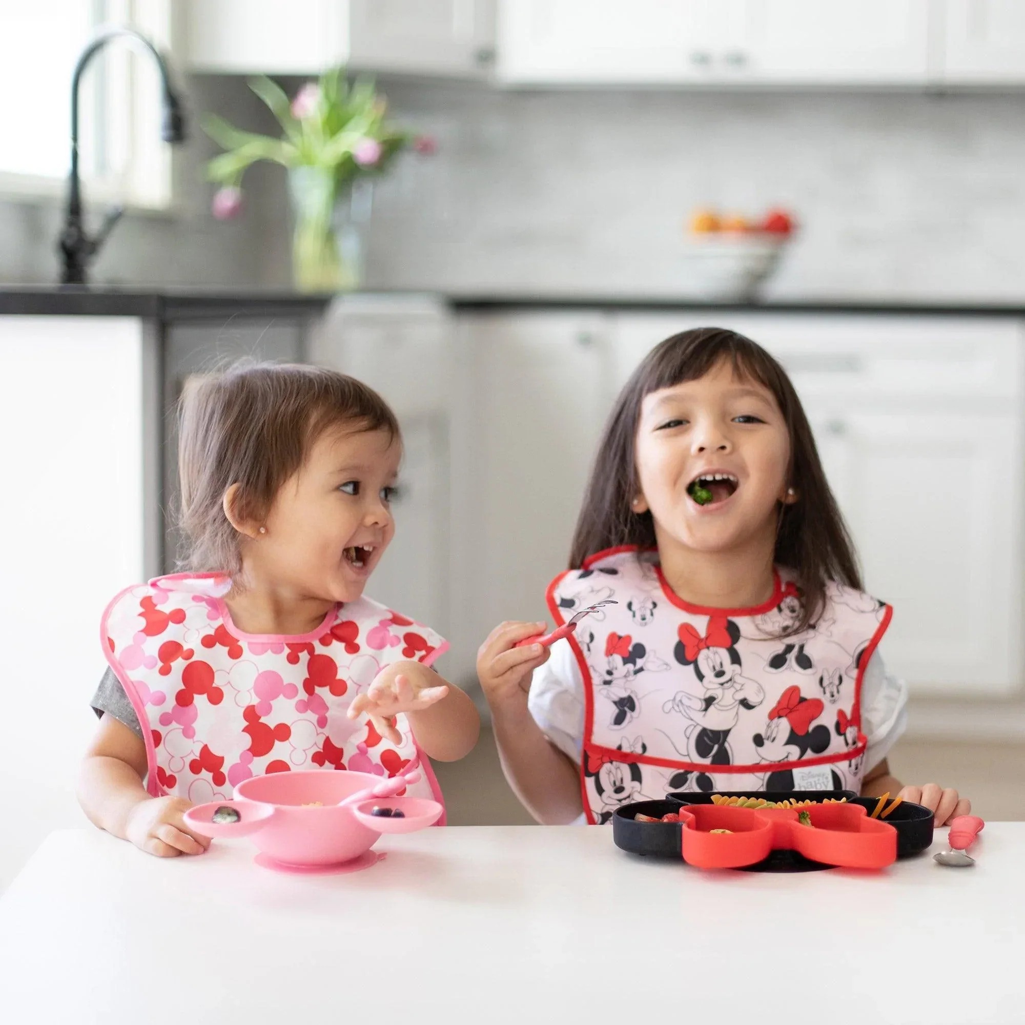 Inspired by one of Disney's most beloved characters, Minnie Mouse, the Silicone Grip Dish is perfect for little one’s learning to self-feed. It’s sized for baby and toddler portions. And it fits and sticks to most highchair trays and tables. A strong suction base ensures the dish stays put – even with the most aggressive toddler! Silicone can withstand low and high temperatures, easily transitioning from the refrigerator or freezer to the oven or microwave. Made with 100% food-safe silicone that’s durable, stain and bacteria resistant. Measures approximately.