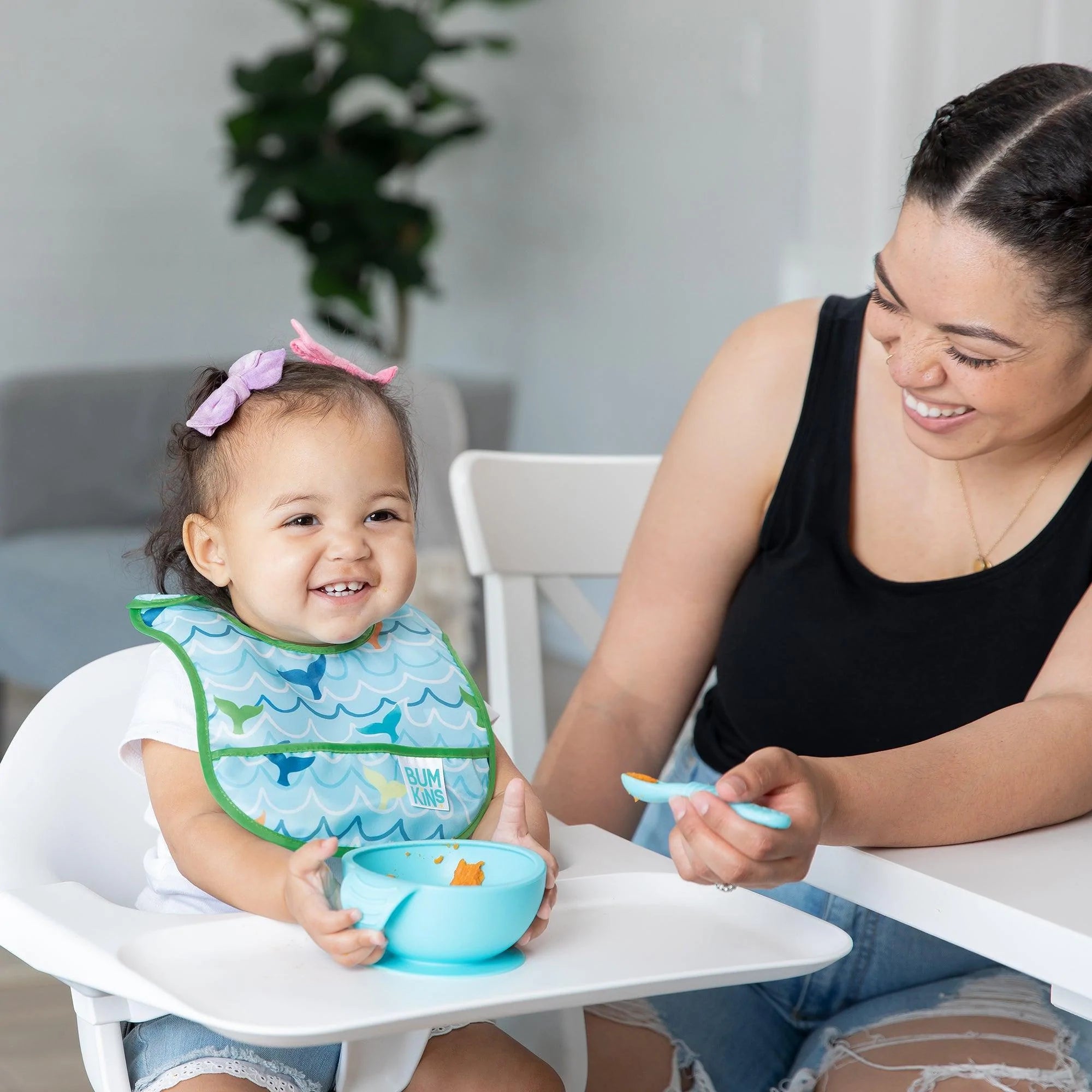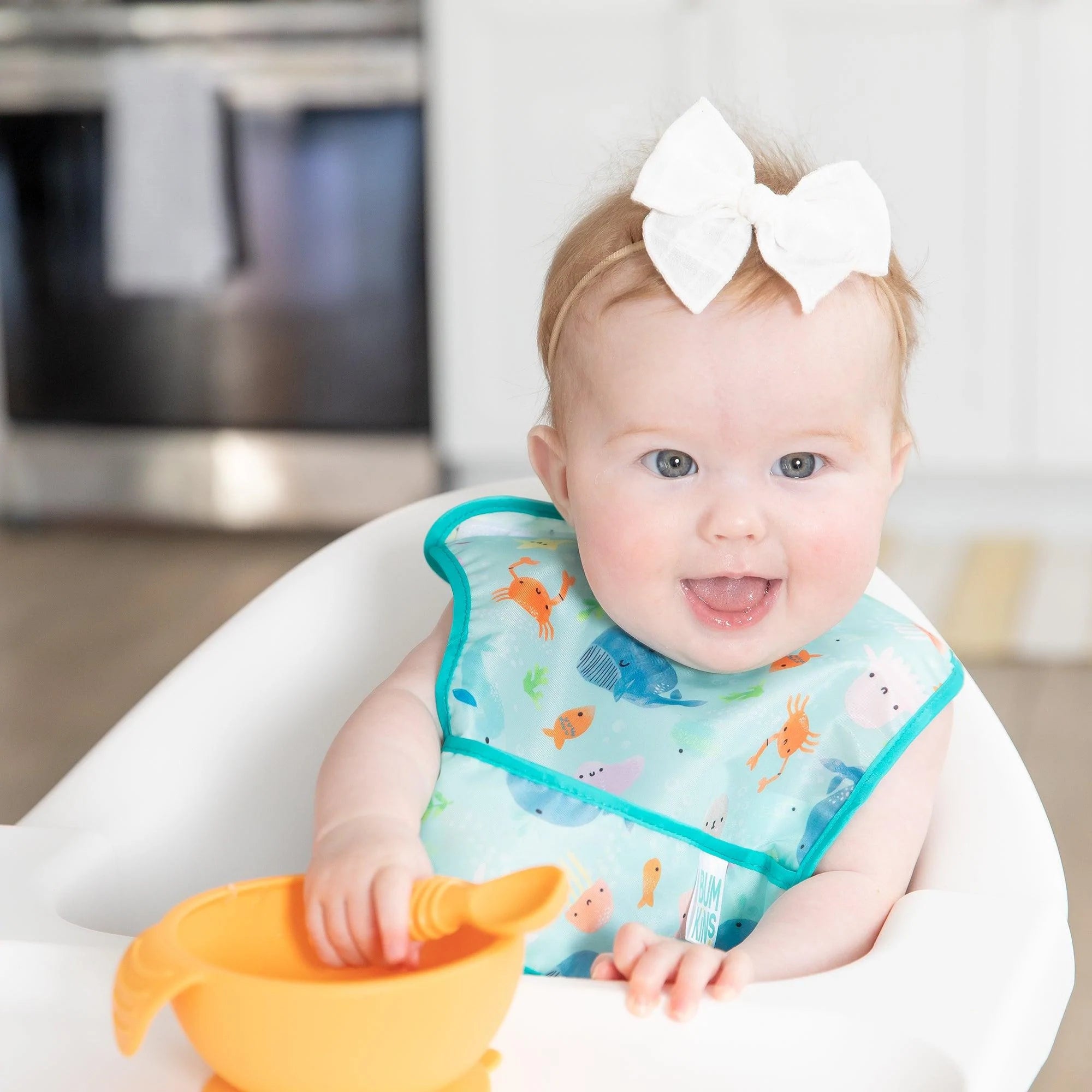 Perfect for baby’s first foods, these Starter Bibs attach over the back of the shoulder with a hook-and-loop closure for a quick, adjustable, and tug-proof fit and feature a large catch-all pocket to help contain spills, crumbs, and more. Starter Bibs are made from Bumkins’ lightweight, durable, waterproof fabric that is resistant to stains and odors. Their single-ply construction means no worrying about icky stuff growing between layers of fabric. Wipeable and machine washable, these bibs are easy to clean, and a pack of two ensures you always have one handy!