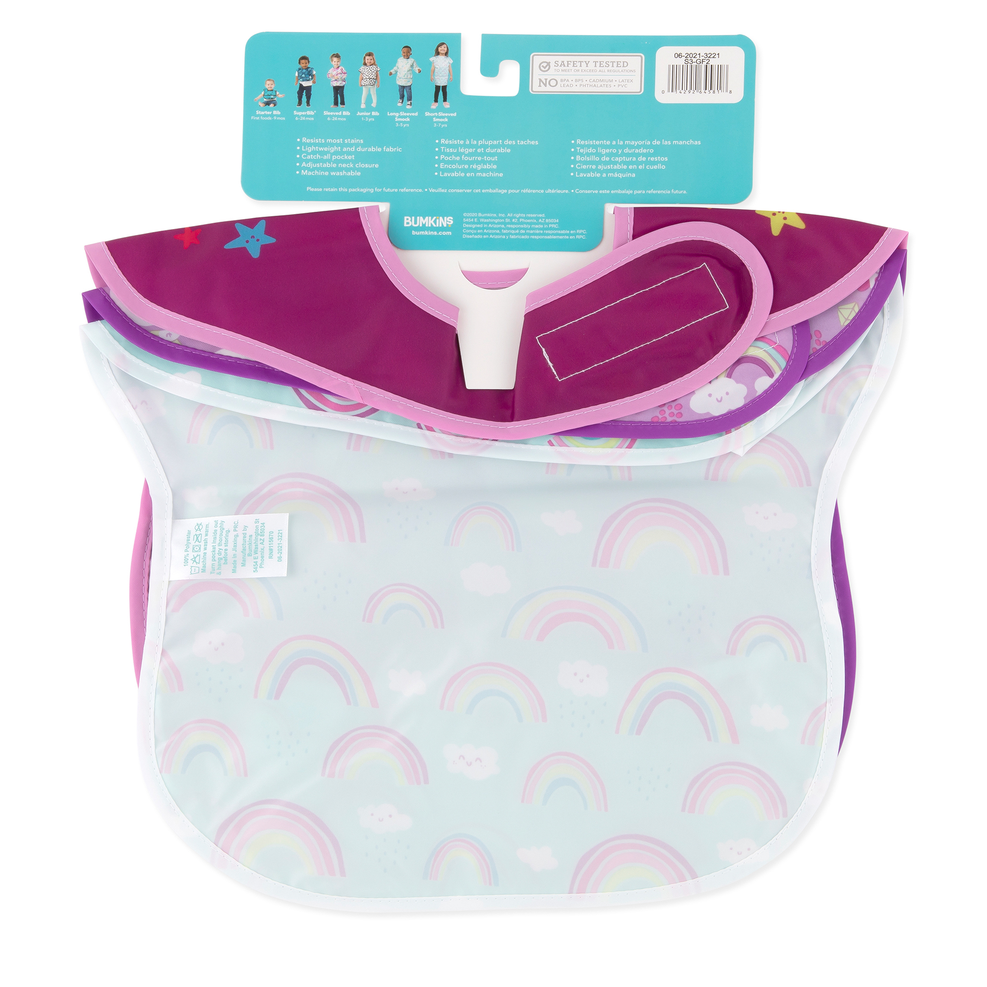 Our SuperBibs save you from the mess! The SuperBib attaches over the back of the shoulder with hook and loop closure for a quick, adjustable and tug-proof fit. With a handy crumb catcher / catch-all pocket for containing spills. Made from Bumkins lightweight, waterproof, easy-wipe, stain and odor resistant fabric. Single ply construction means no worrying about icky stuff growing between layers of fabric. Without a cotton layer, stains and smells don't stick. Wipeable and machine washable for easy cleaning so you can use it over and over again.