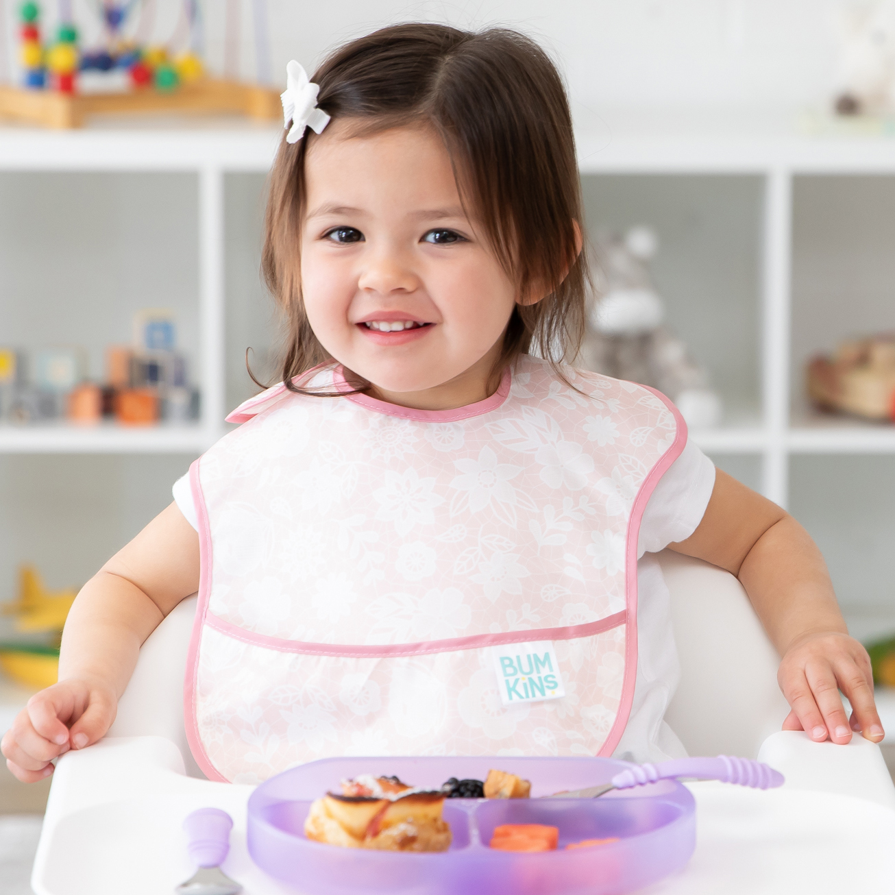 Our SuperBibs save you from the mess! The SuperBib attaches over the back of the shoulder with hook and loop closure for a quick, adjustable and tug-proof fit. With a handy crumb catcher / catch-all pocket for containing spills. Made from Bumkins lightweight, waterproof, easy-wipe, stain and odor resistant fabric. Single ply construction means no worrying about icky stuff growing between layers of fabric. Without a cotton layer, stains and smells don't stick. Wipeable and machine washable for easy cleaning so you can use it over and over again.