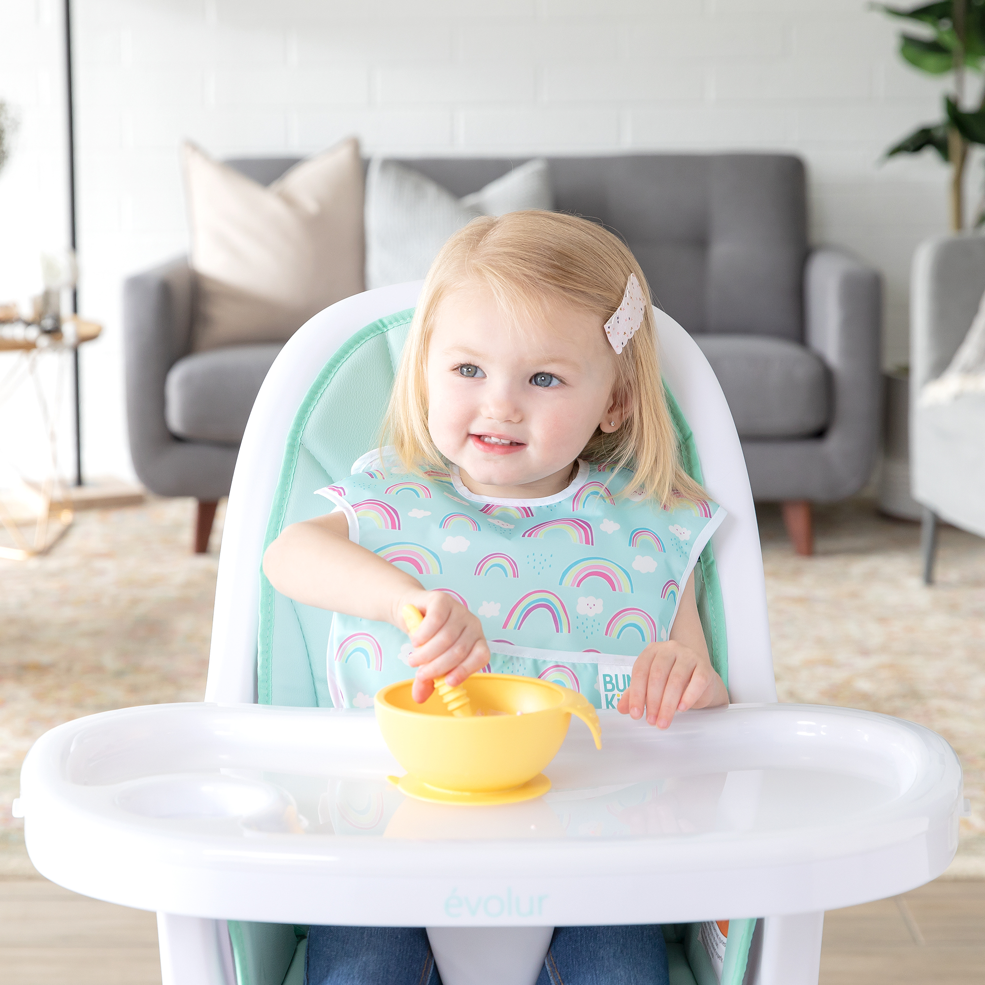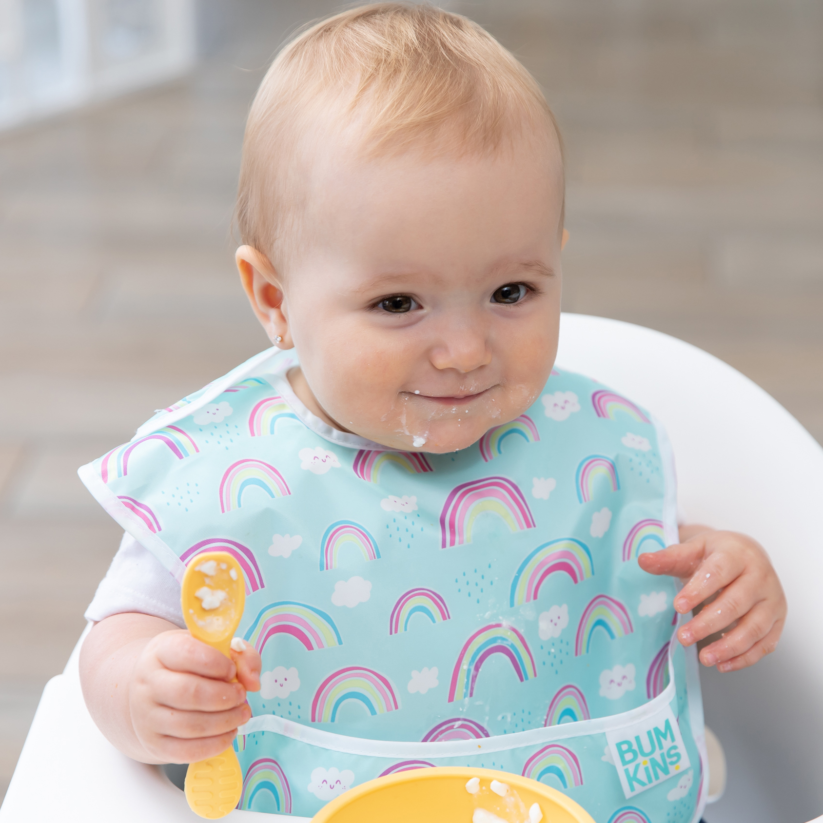 Our SuperBibs save you from the mess! The SuperBib attaches over the back of the shoulder with hook and loop closure for a quick, adjustable and tug-proof fit. With a handy crumb catcher / catch-all pocket for containing spills. Made from Bumkins lightweight, waterproof, easy-wipe, stain and odor resistant fabric. Single ply construction means no worrying about icky stuff growing between layers of fabric. Without a cotton layer, stains and smells don't stick. Wipeable and machine washable for easy cleaning so you can use it over and over again.