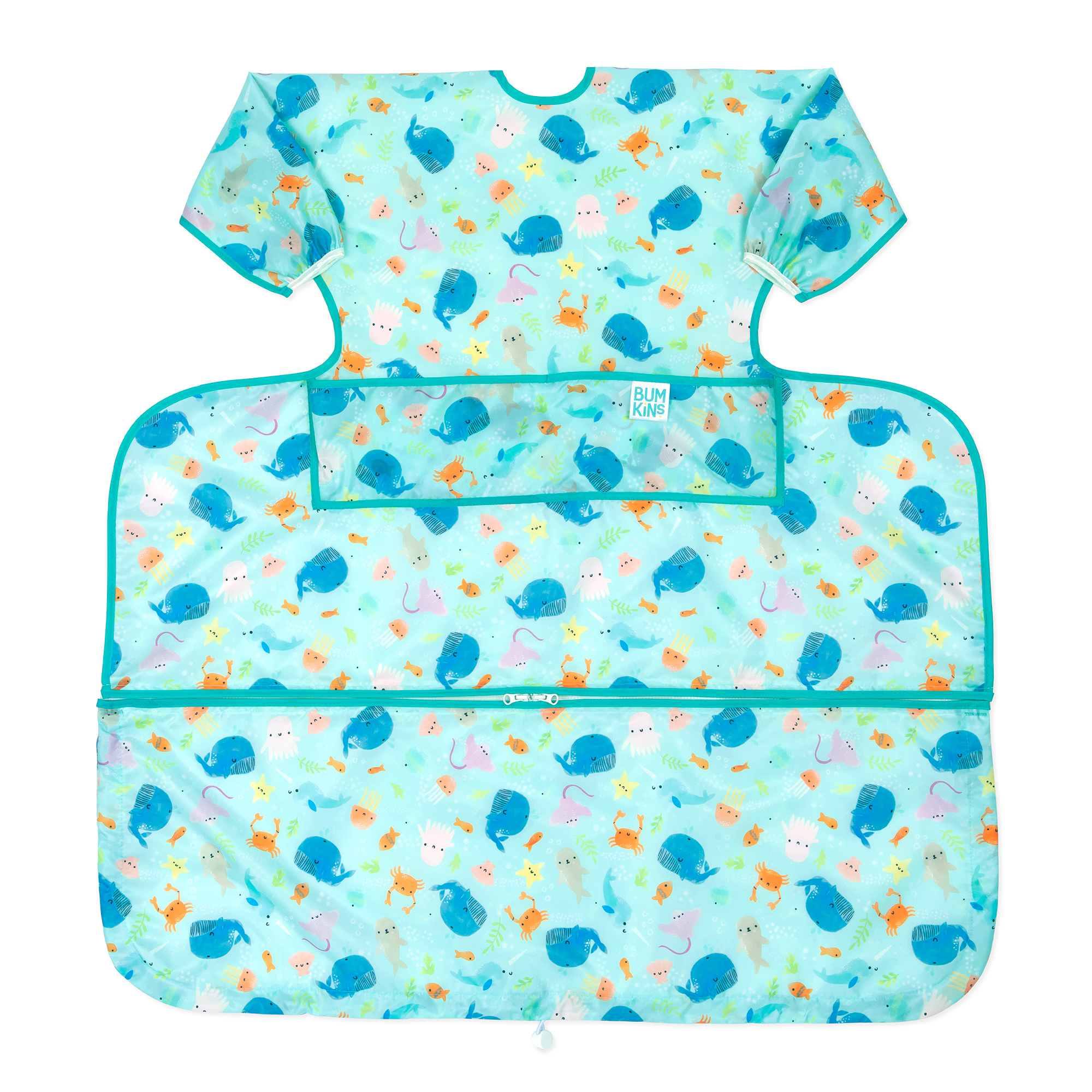 The Tray Mate Sleeved High Chair Bib is for little ones who like to swim in their food! A 2-in-1 combination bib made with Bumkins’ signature waterproof fabric provides complete coverage for extra messy eaters! Our long-sleeved bib with elasticized cuffs covers baby and connects to a universal highchair tray cover with a drawstring, making cleanup a cinch! As baby grows and needs less coverage, you can unzip the tray cover from the bib portion to convert it into a regular Sleeved Bib with a catch-all pocket. And you can even stick our silicone dishware to the tray, using a double zipper opening to lock it in.
