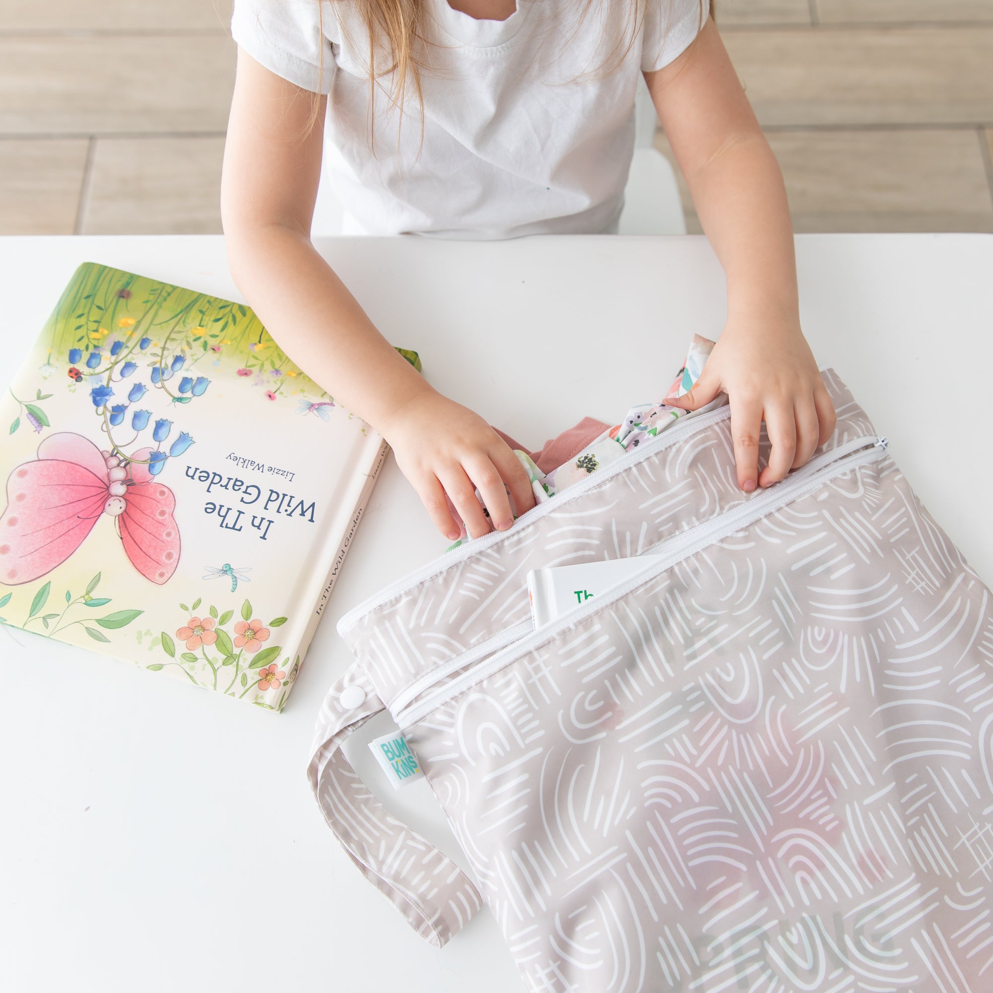 The better alternative to single-use plastic bags, our reusable Wet / Dry Bags are made from the same waterproof fabric as our SuperBib. Our bags feature heat-sealed seams for true waterproof protection. Two compartments with smooth zippered closures keep wet and dry items separate. Single-ply construction means no worrying about icky stuff growing between layers of fabric. Wet / Dry bags are great for carrying diapers, dirty gym clothes and wet swimsuits. These bags make excellent organizers for toys, accessories, toiletries, electronics, travel and more! With a snap handle, snap your bag wherever you need it – stroller, changing table or suitcase. Bags are non-gusseted, non-insulated and non-stretch.