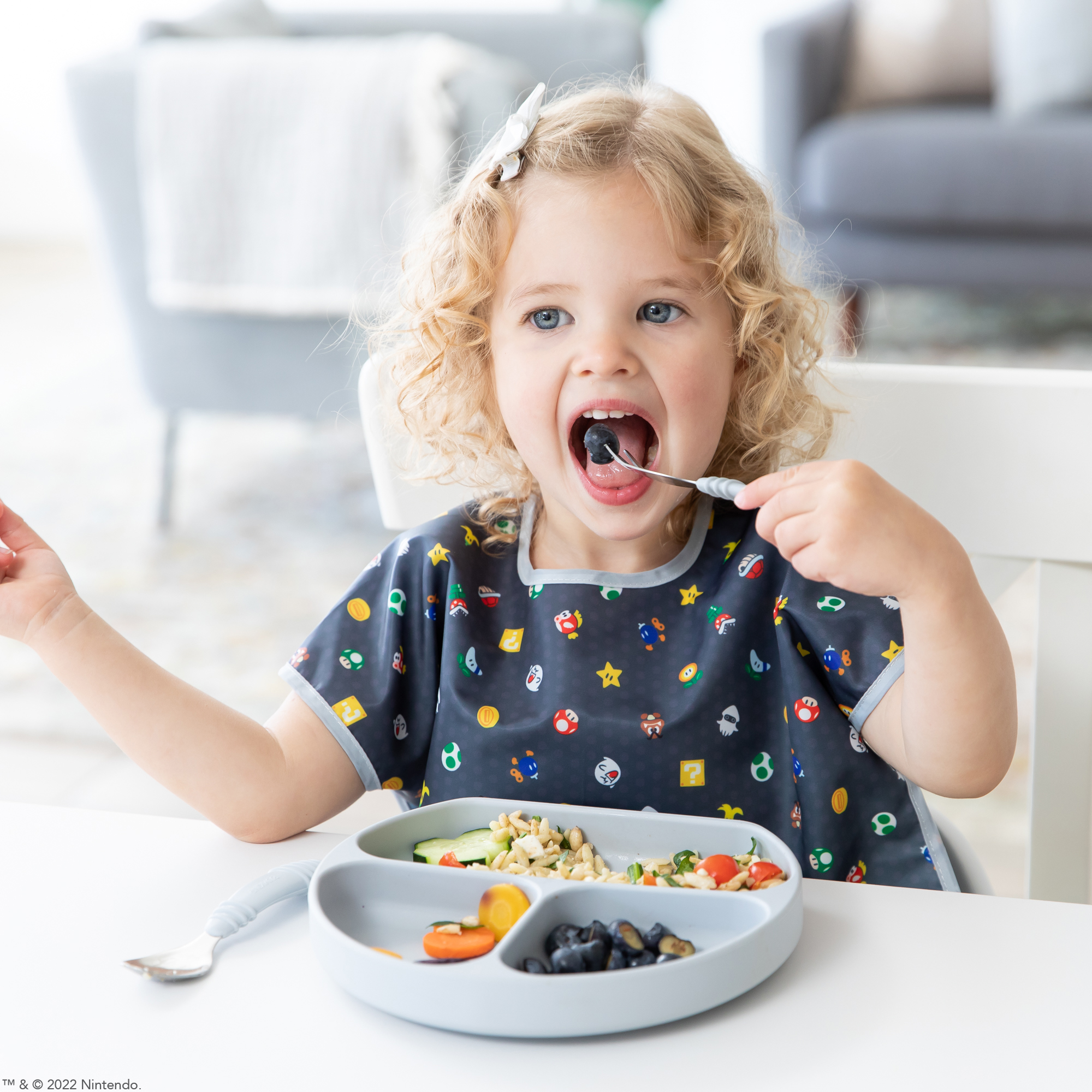 Your child won’t realize they’re wearing a bib as they slip on this short-sleeved toddler bib that features a large catch-all pocket to help contain spills, crumbs, and more. The back hook-and-loop closure allows for a quick, adjustable, and tug-proof fit. Wipeable and machine washable for easy cleaning so you can use it over and over again!