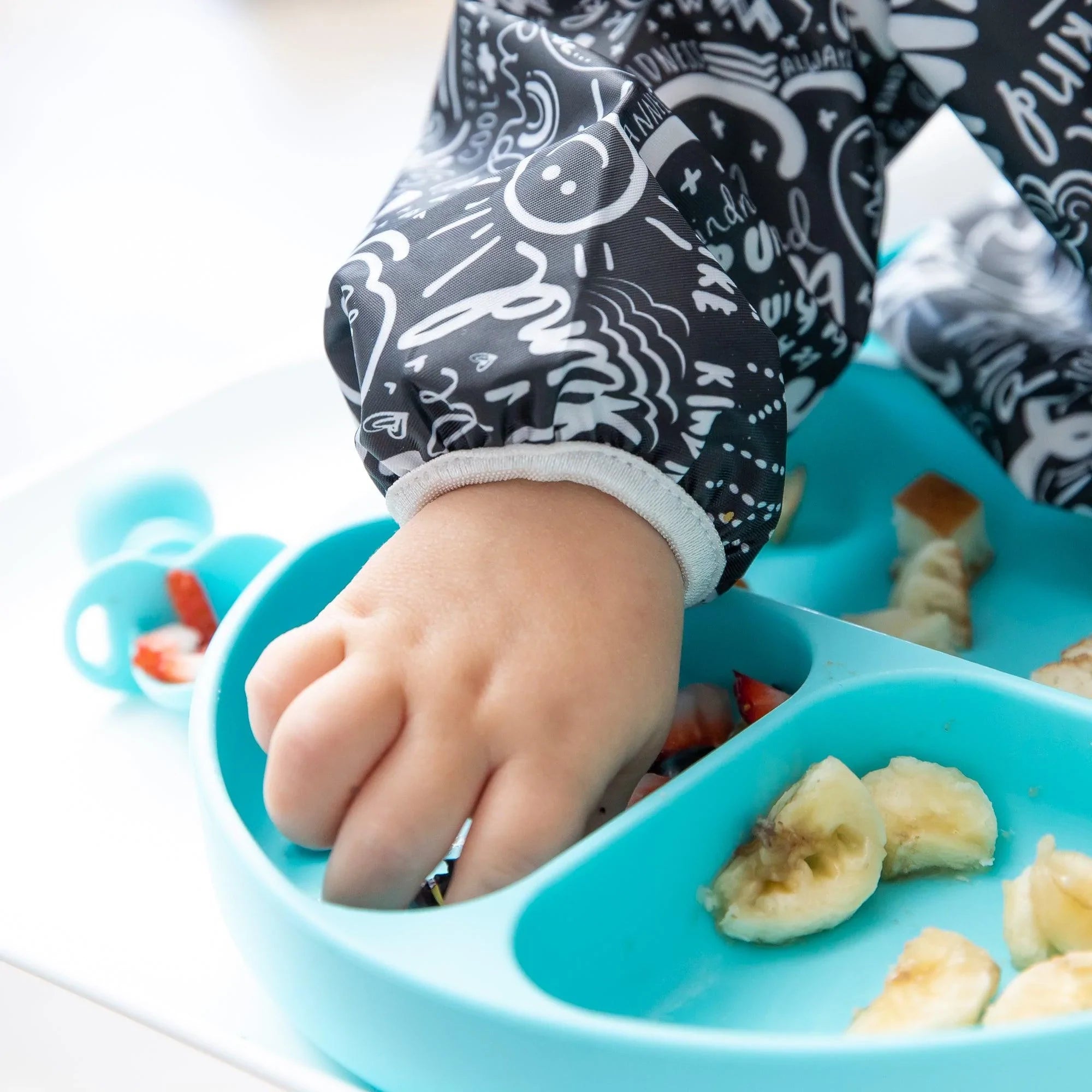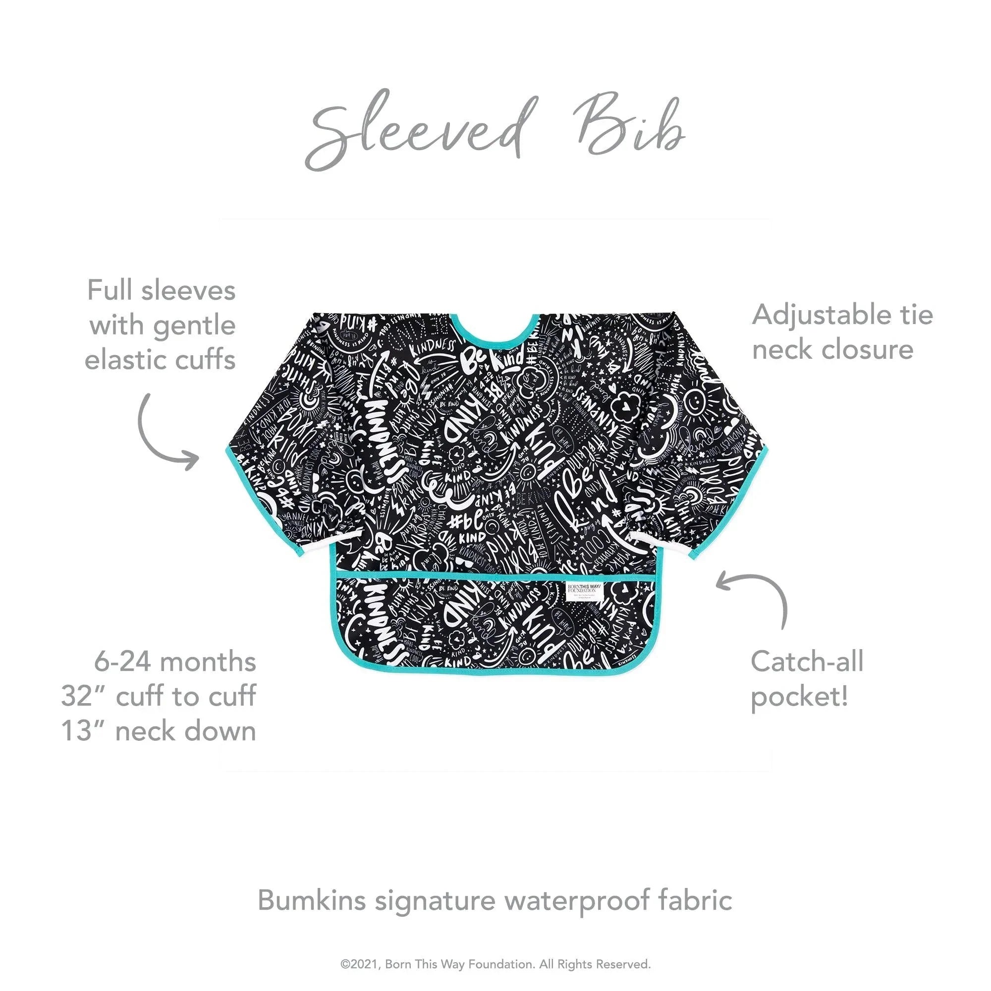De tamaño generoso e ideal para dar de comer al bebé, el babero con mangas está fabricado con el tejido ligero, duradero e impermeable de Bumkins, que resiste las manchas y los olores. Con una sola capa de tejido, no tienes que preocuparte de que crezcan cosas asquerosas entre las capas. Ajústalo a tu pequeño con un cierre de lazo trasero y puños elásticos. Un gran bolsillo ayuda a contener derrames, migas y más. Se puede limpiar con un paño y se puede lavar a máquina para que puedas usarlo una y otra vez.
