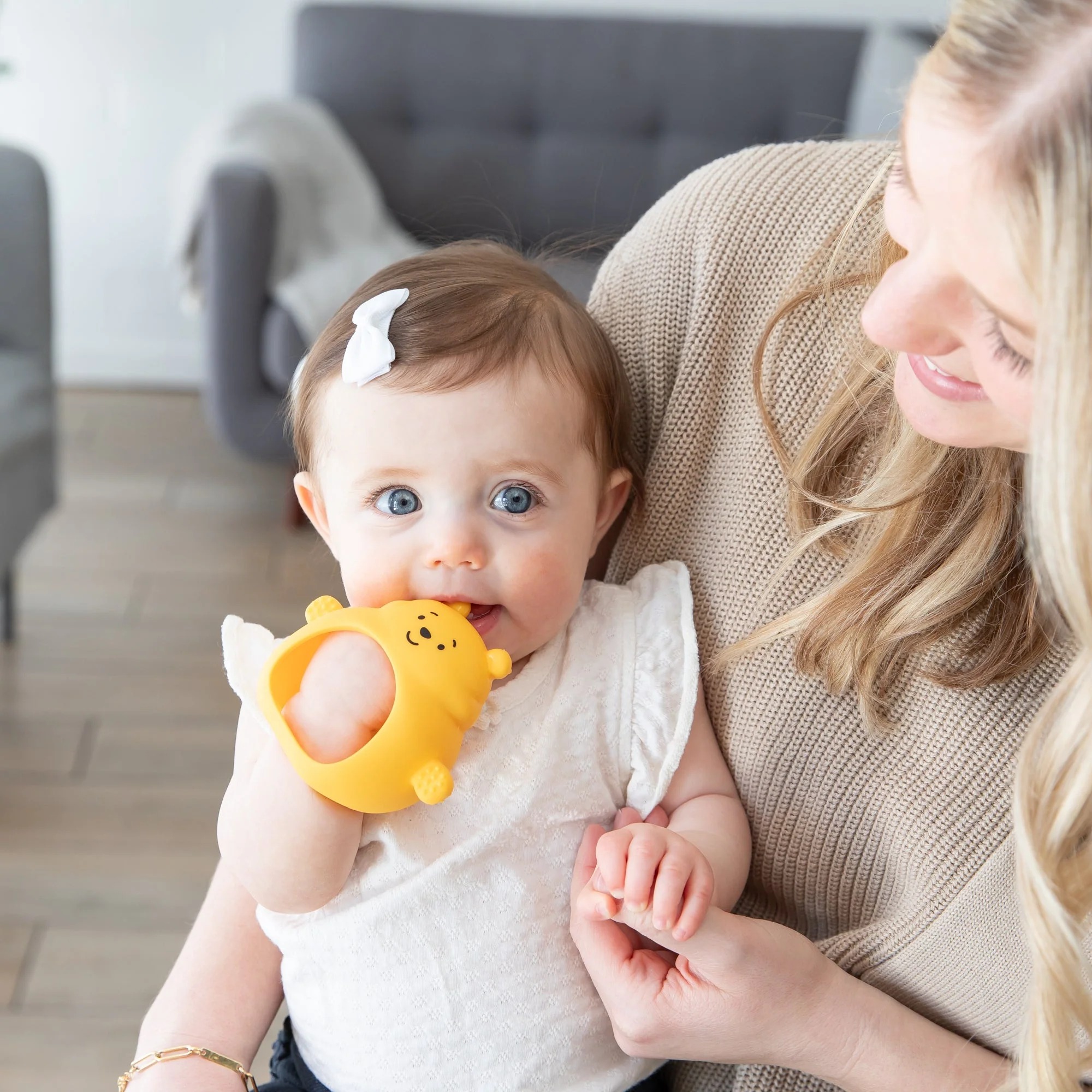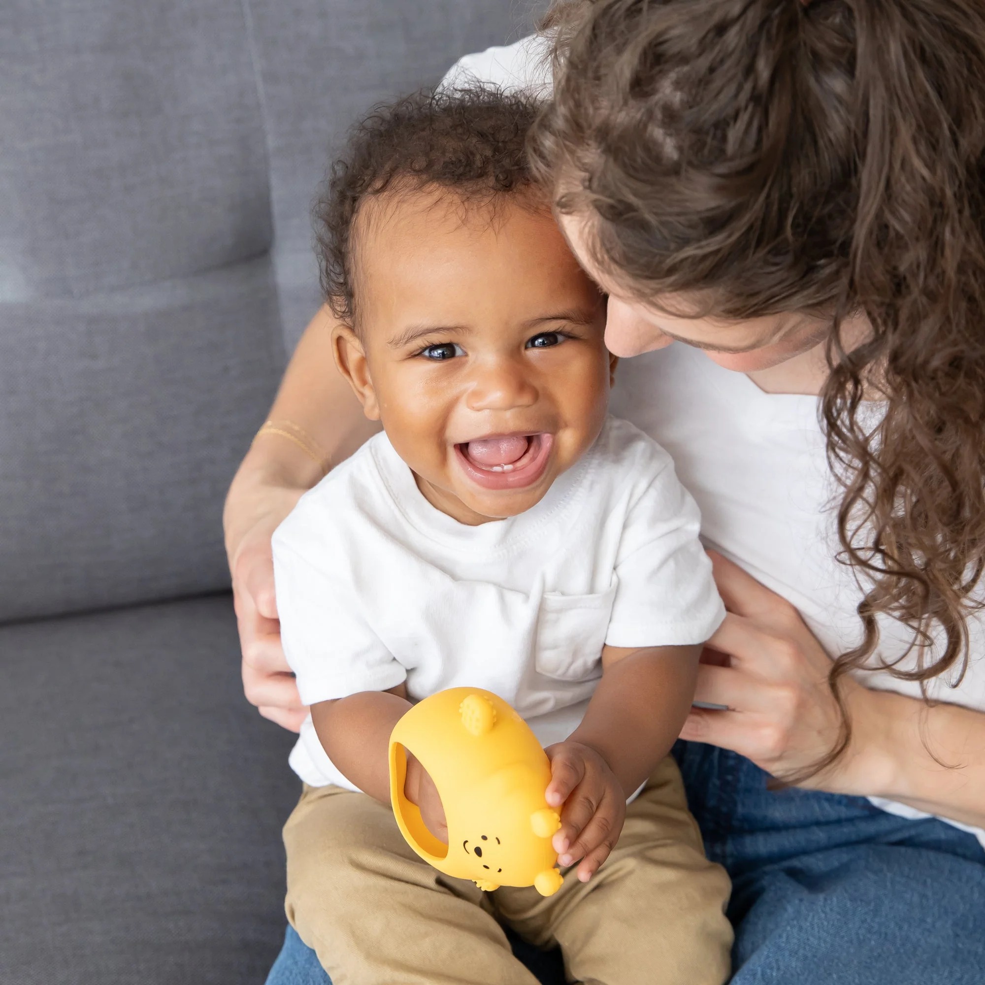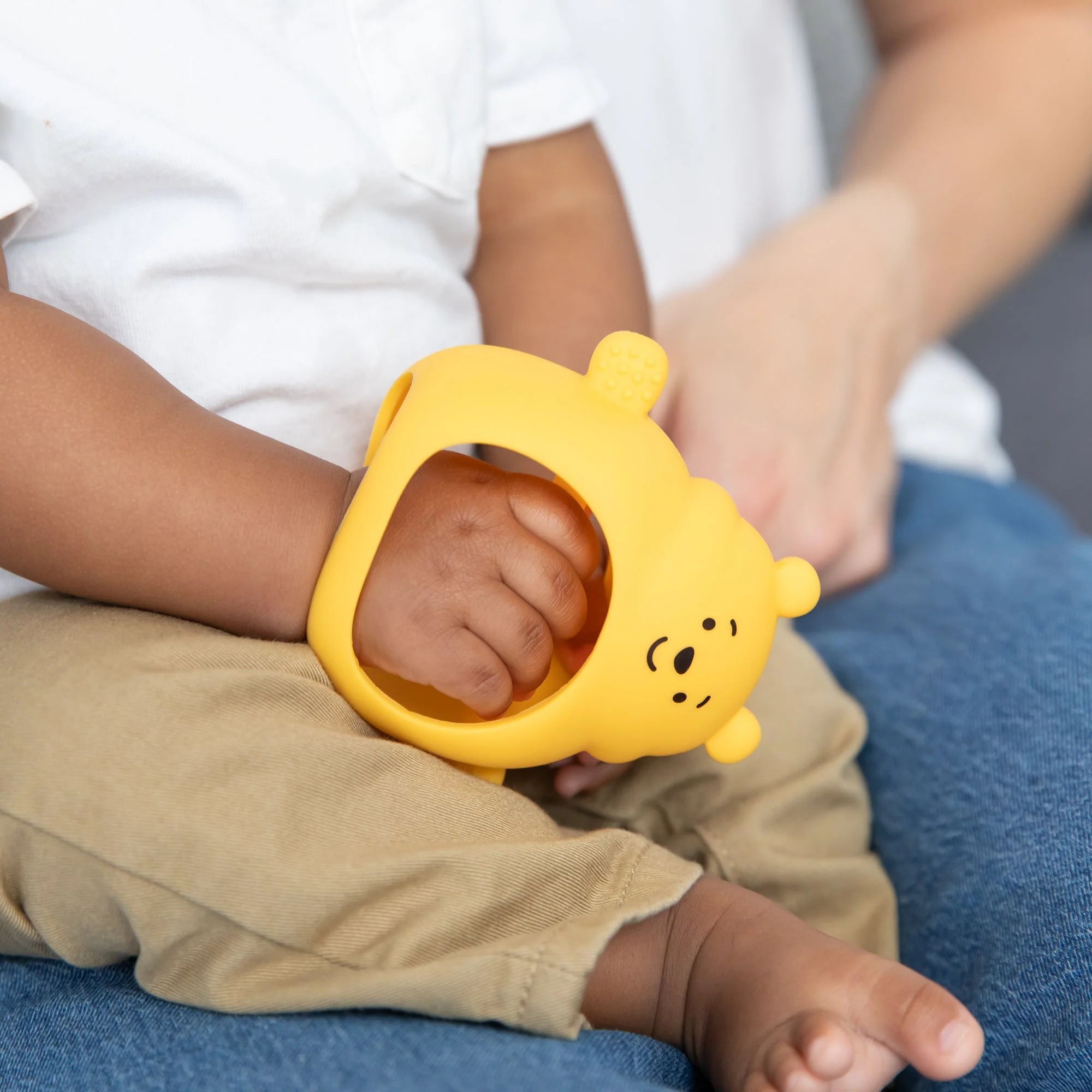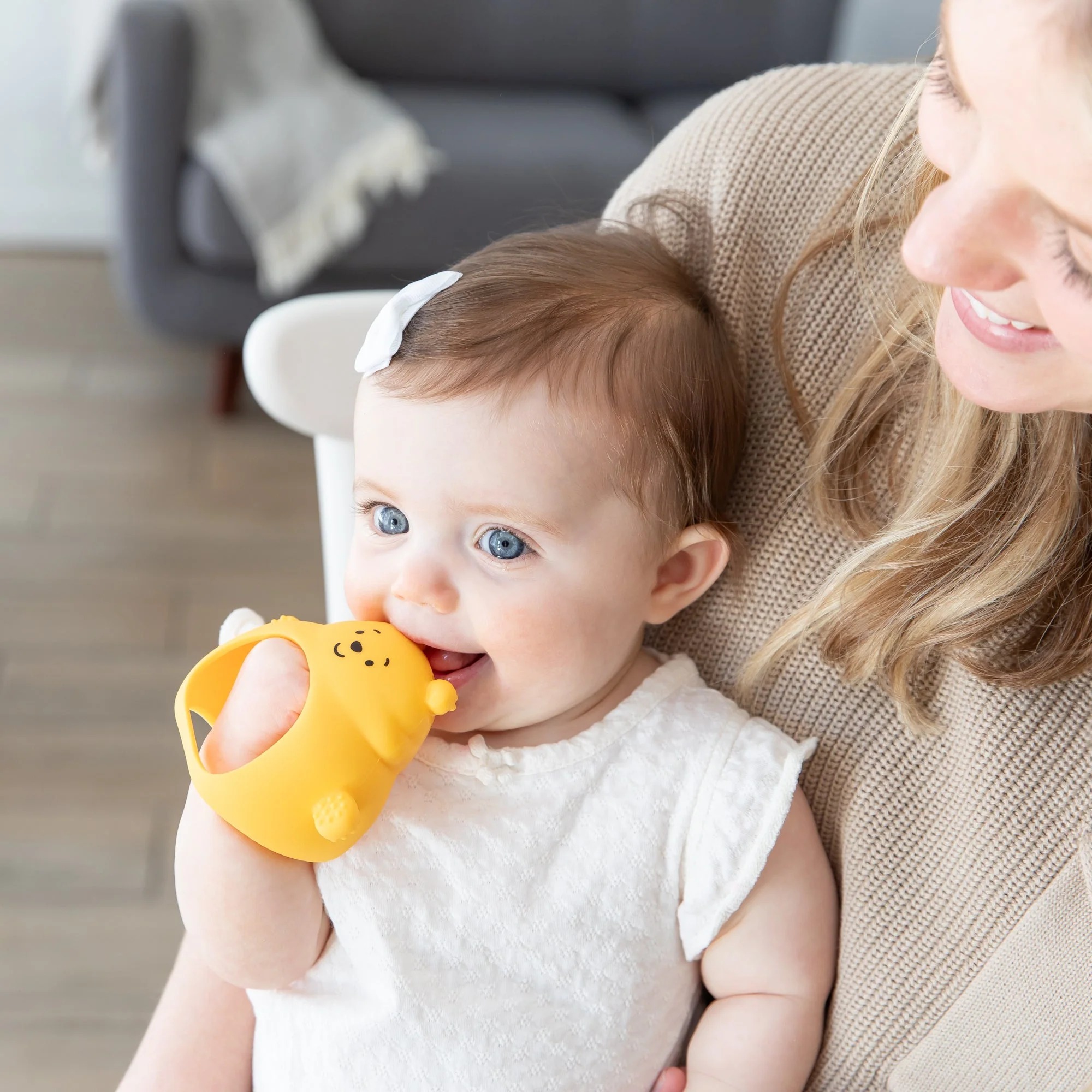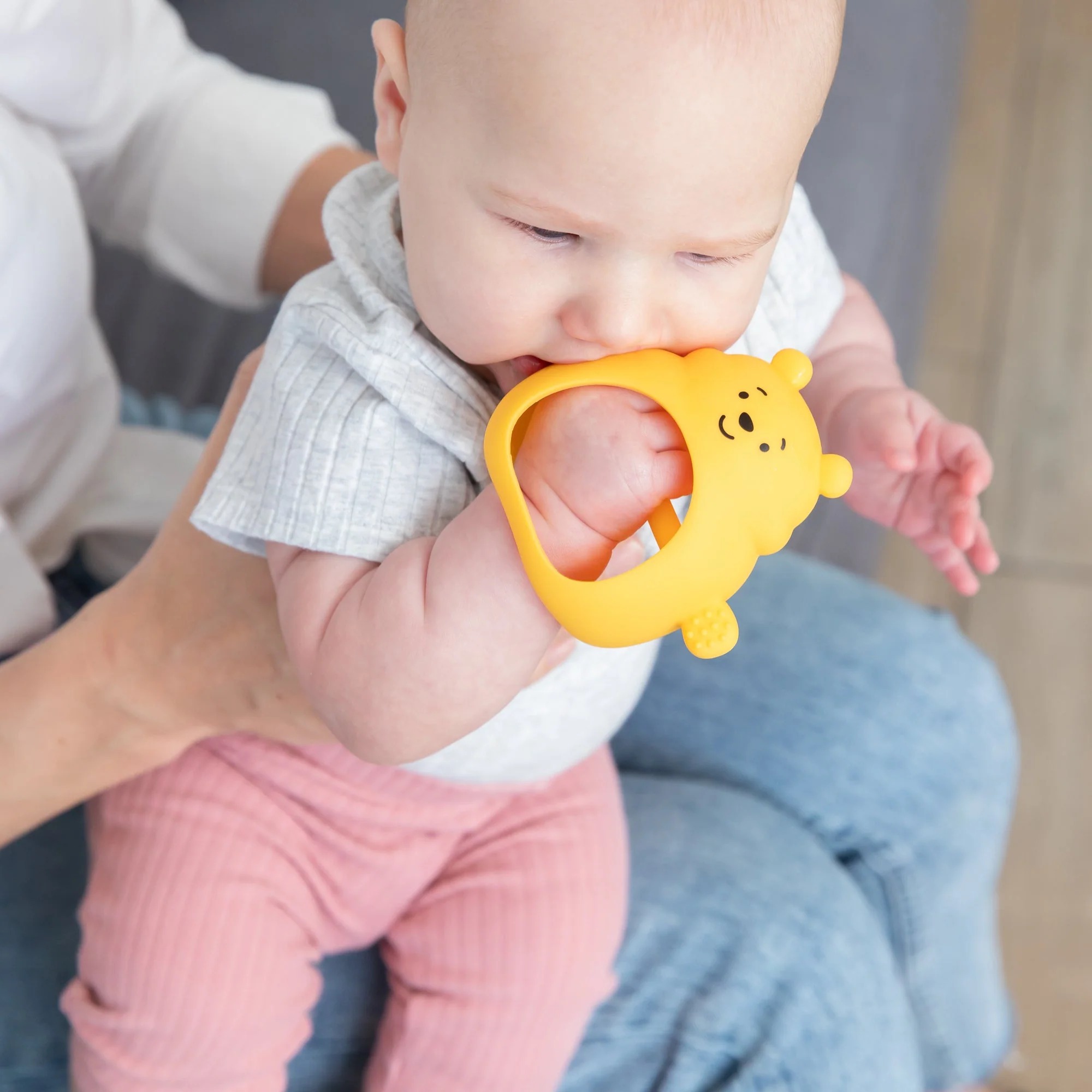 Help give teething a hand with the Silicone Un-Droppable Mitt Teether in the shape of Disney's Winnie the Pooh. Designed to fit their little hands and made from silicone that’s flexible and gentle enough when your baby wants soft pressure on their gums. Texture massages and provides relief to gums while allowing your baby to explore shapes. Chill for added relief! Silicone has a natural resistance to bacteria. It can be safely boiled to sterilize.