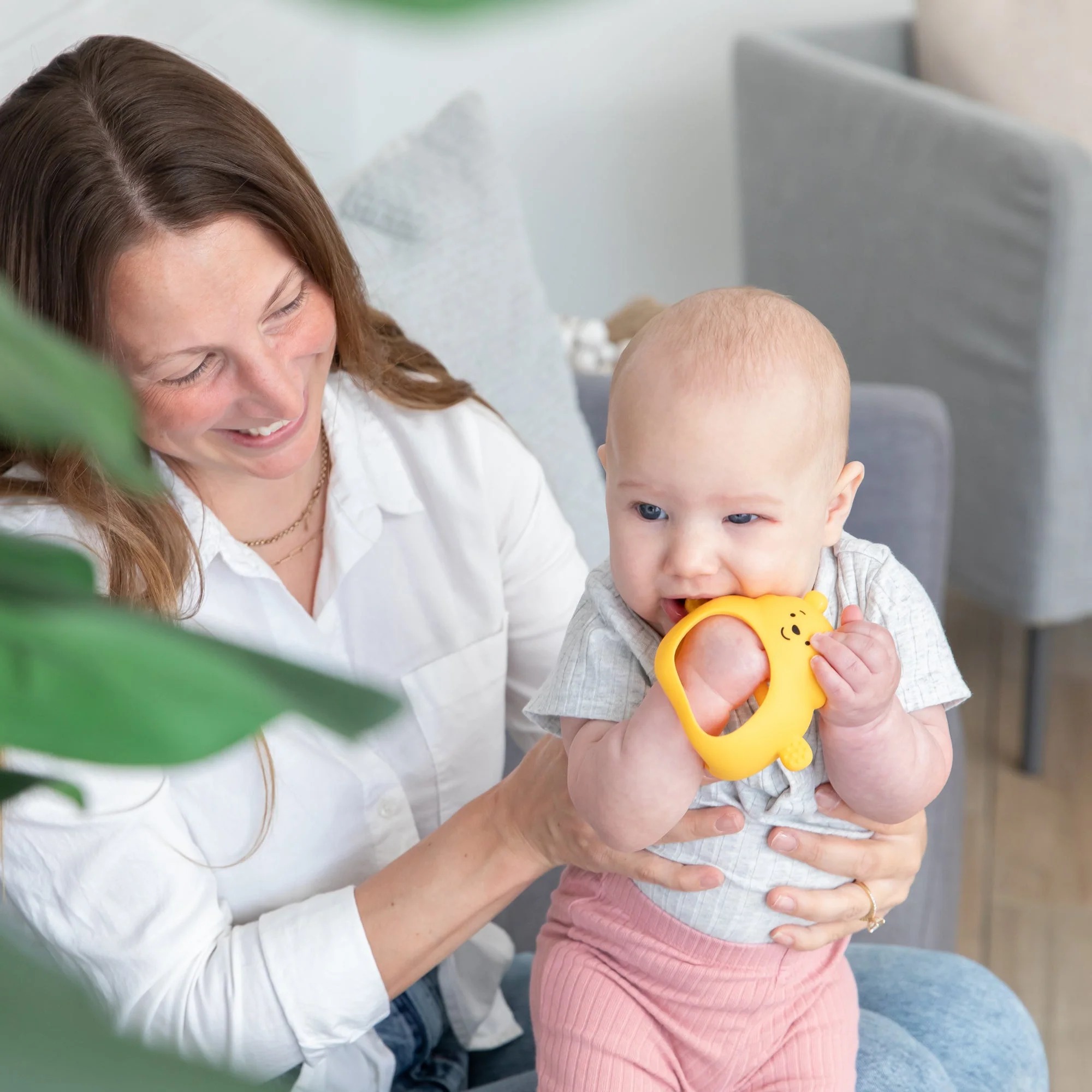 This teether is made from 100% food-safe, LFGB-grade silicone, which is tested to higher standards than regular FDA-grade silicone. Because of this, LFGB-grade silicone inherently uses less additives or fillers, is less likely to impact the smell or taste of food, and has a higher durability compared to FDA-grade silicone, resulting in a more premium product.