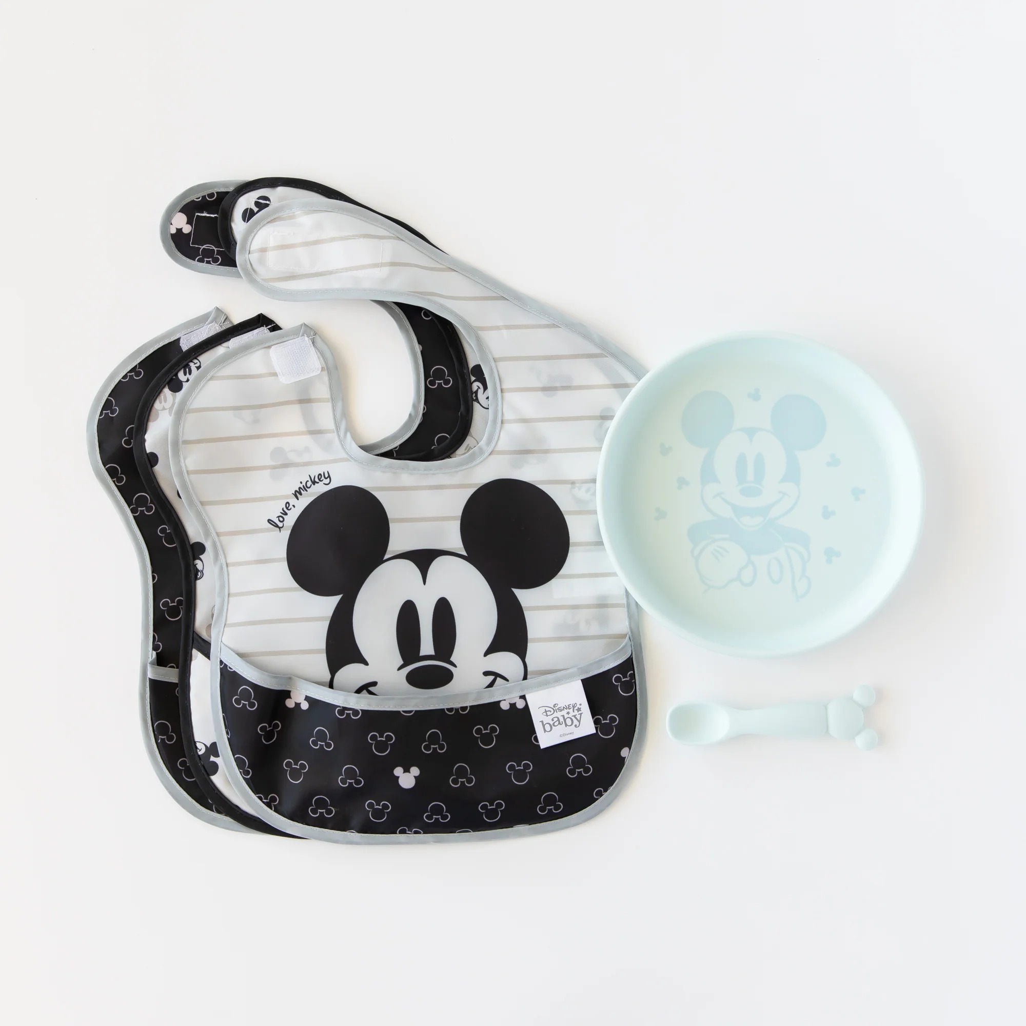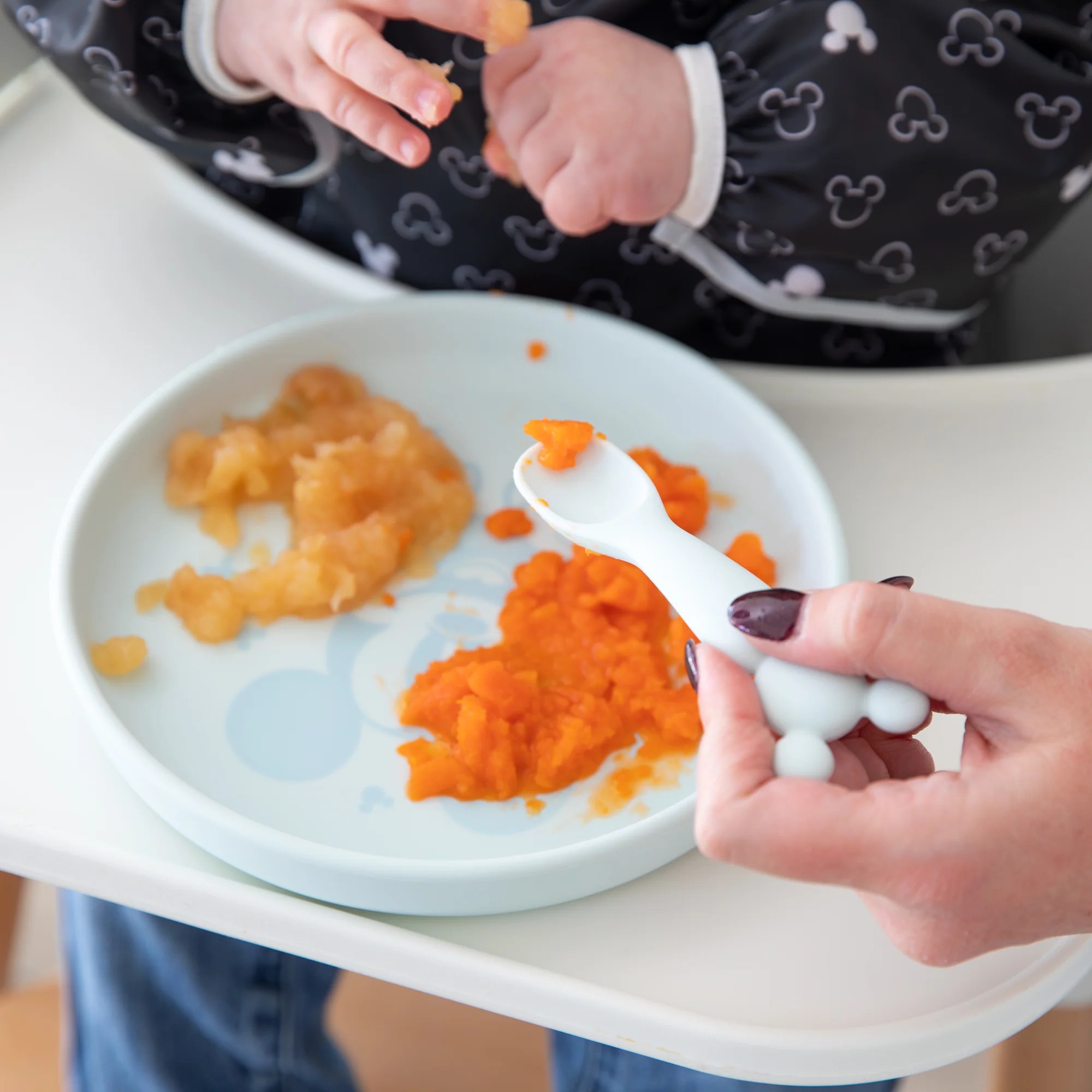 - Training spoon sized for baby with a fun handle featuring Disney’s iconic characters and shapes