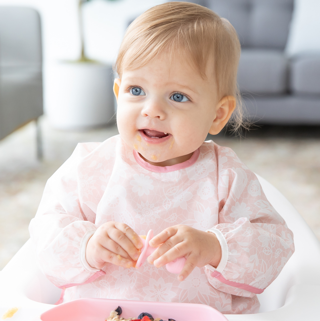 De tamaño generoso e ideal para dar de comer al bebé, el babero con mangas está fabricado con el tejido ligero, duradero e impermeable de Bumkins, que resiste las manchas y los olores. Con una sola capa de tejido, no tienes que preocuparte de que crezcan cosas asquerosas entre las capas. Ajústalo a tu pequeño con un cierre de lazo trasero y puños elásticos. Un gran bolsillo ayuda a contener derrames, migas y más. Se puede limpiar con un paño y se puede lavar a máquina para que puedas usarlo una y otra vez.