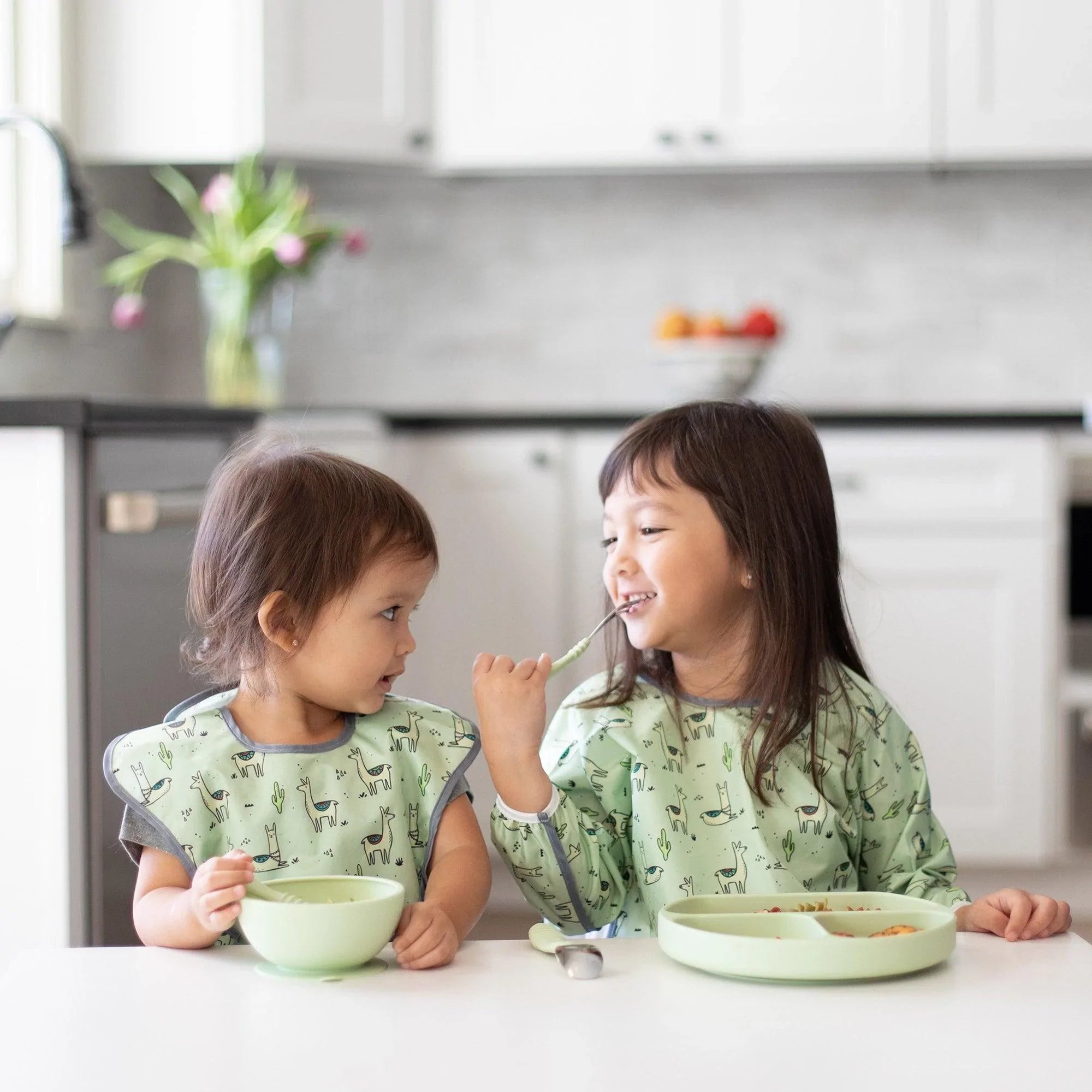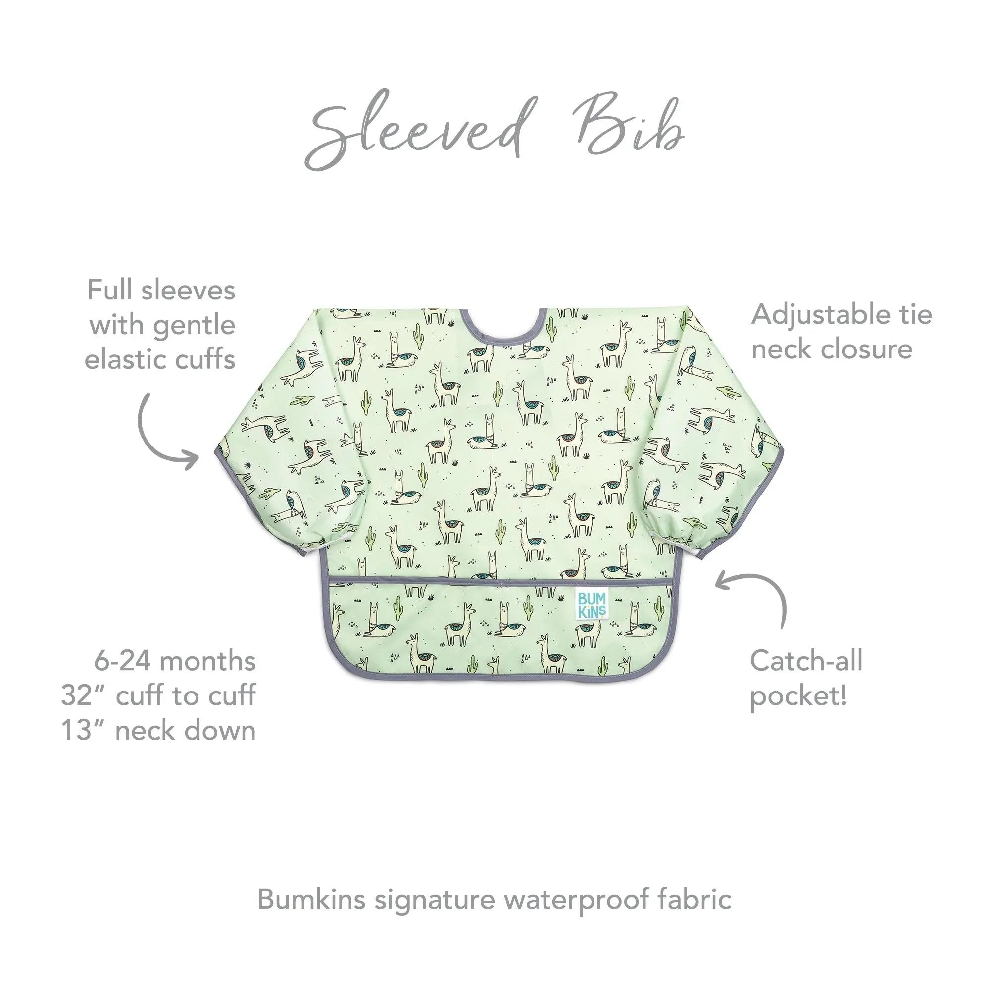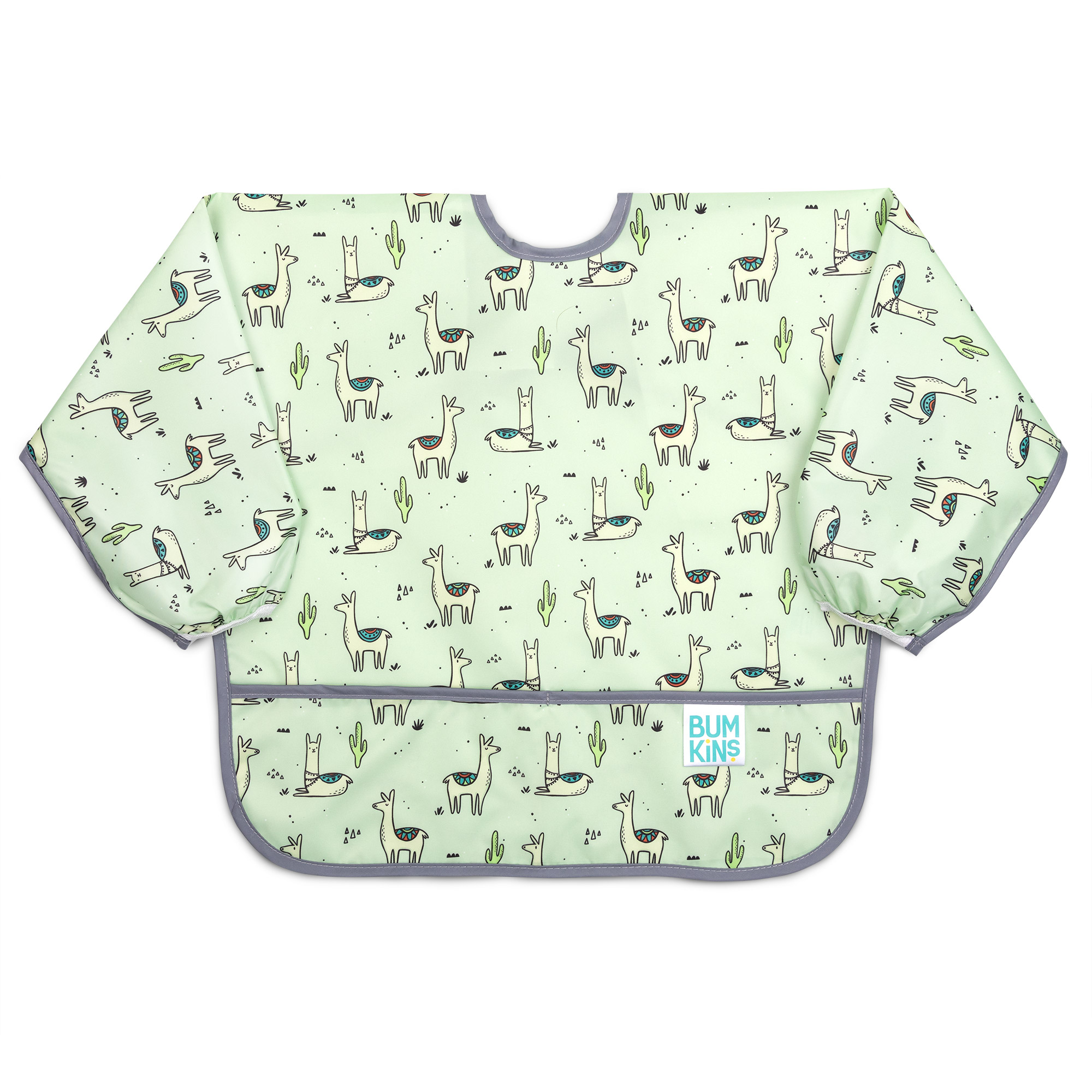 De tamaño generoso e ideal para dar de comer al bebé, el babero con mangas está fabricado con el tejido ligero, duradero e impermeable de Bumkins, que resiste las manchas y los olores. Con una sola capa de tejido, no tienes que preocuparte de que crezcan cosas asquerosas entre las capas. Ajústalo a tu pequeño con un cierre de lazo trasero y puños elásticos. Un gran bolsillo ayuda a contener derrames, migas y más. Se puede limpiar con un paño y se puede lavar a máquina para que puedas usarlo una y otra vez.