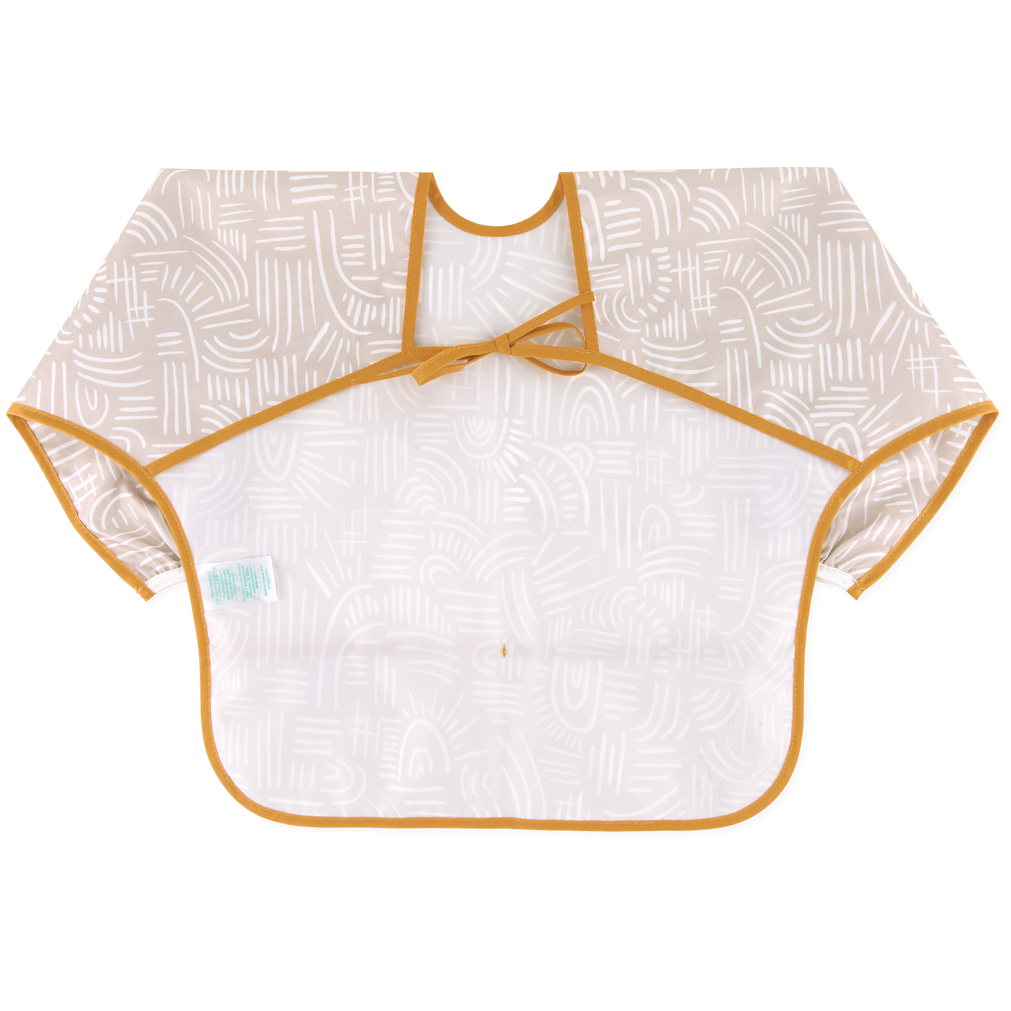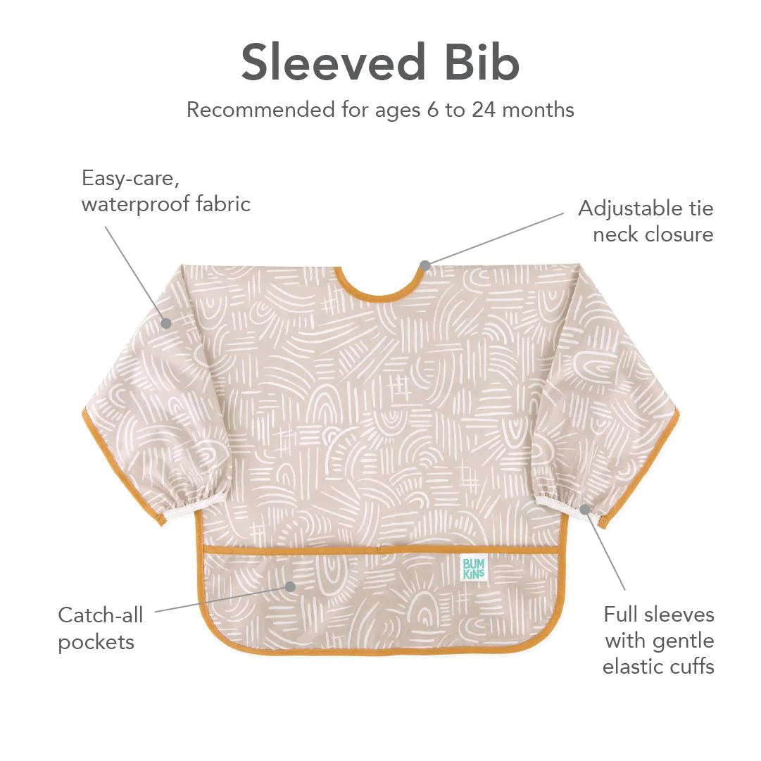 De tamaño generoso e ideal para dar de comer al bebé, el babero con mangas está fabricado con el tejido ligero, duradero e impermeable de Bumkins, que resiste las manchas y los olores. Con una sola capa de tejido, no tienes que preocuparte de que crezcan cosas asquerosas entre las capas. Ajústalo a tu pequeño con un cierre de lazo trasero y puños elásticos. Un gran bolsillo ayuda a contener derrames, migas y más. Se puede limpiar con un paño y se puede lavar a máquina para que puedas usarlo una y otra vez.