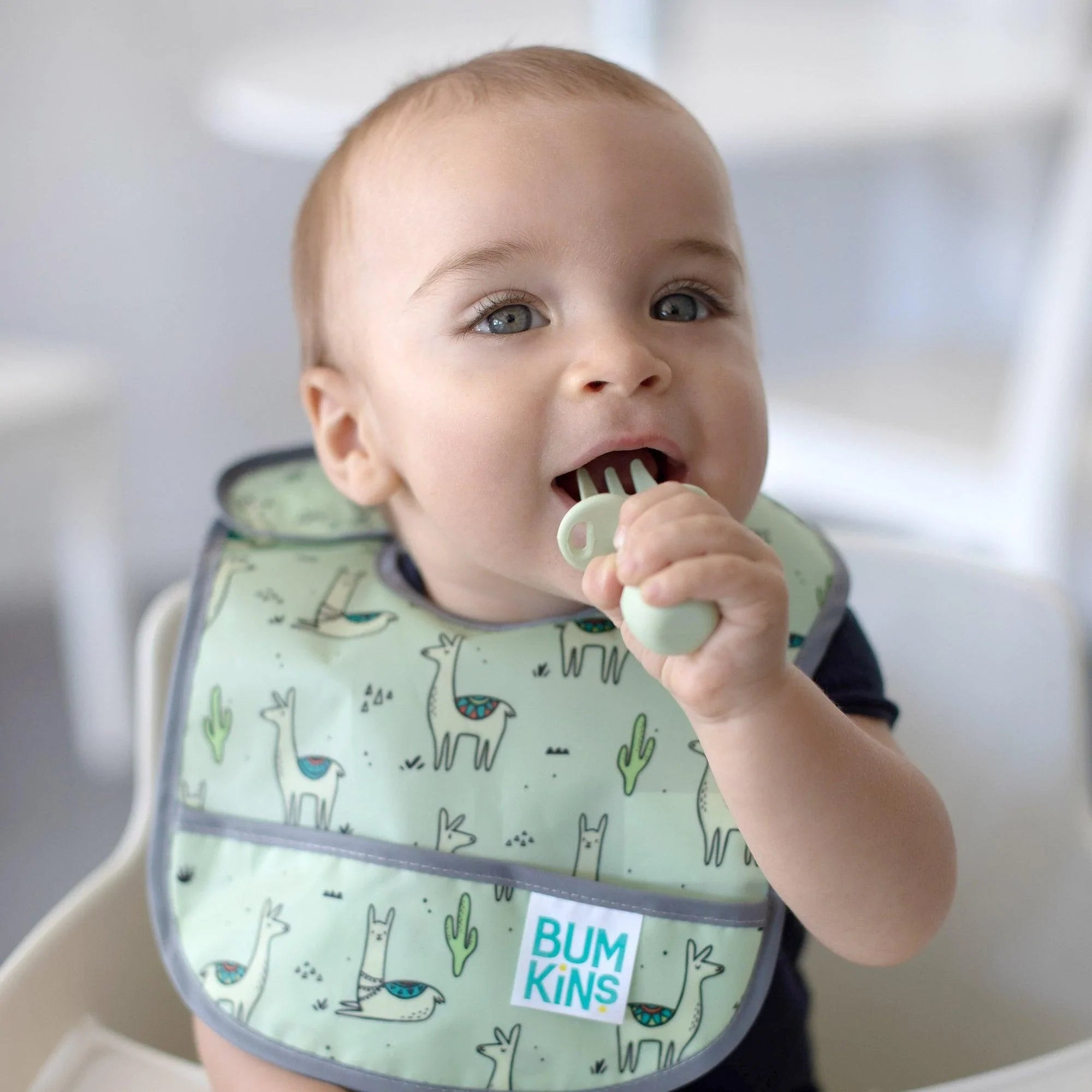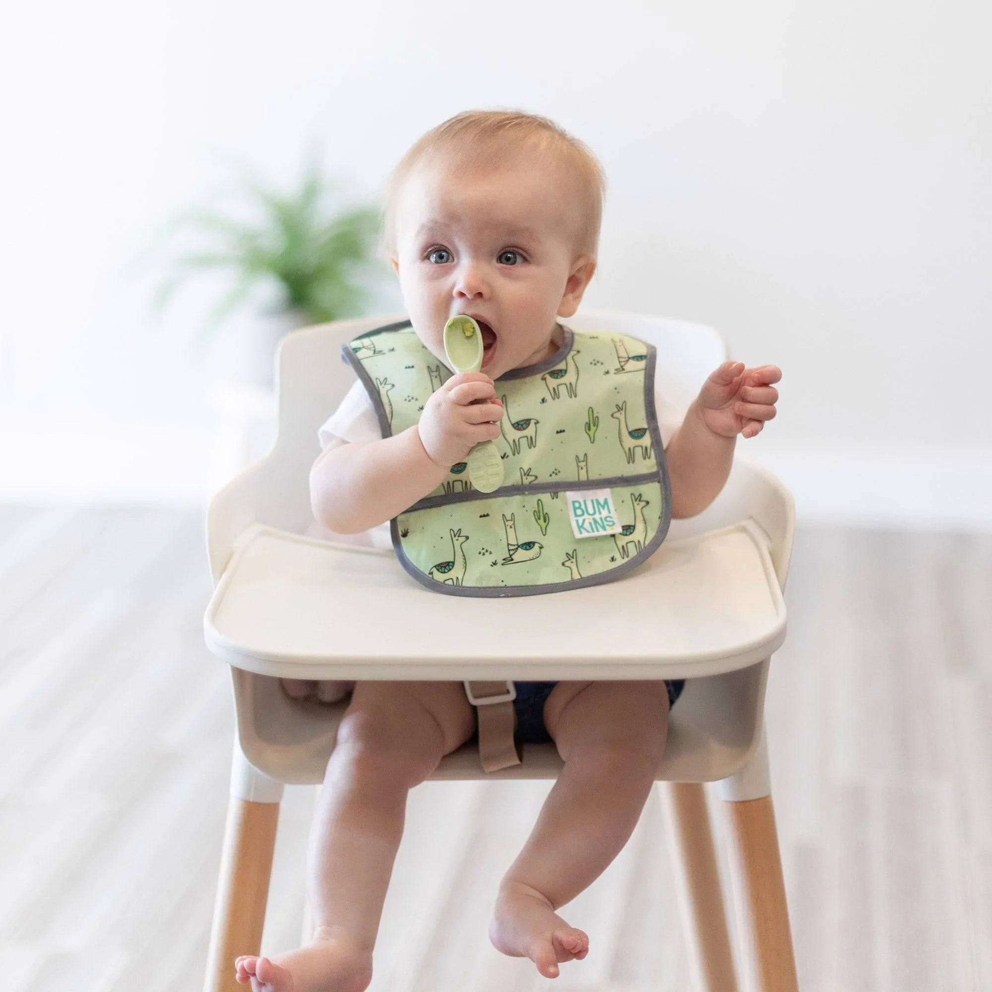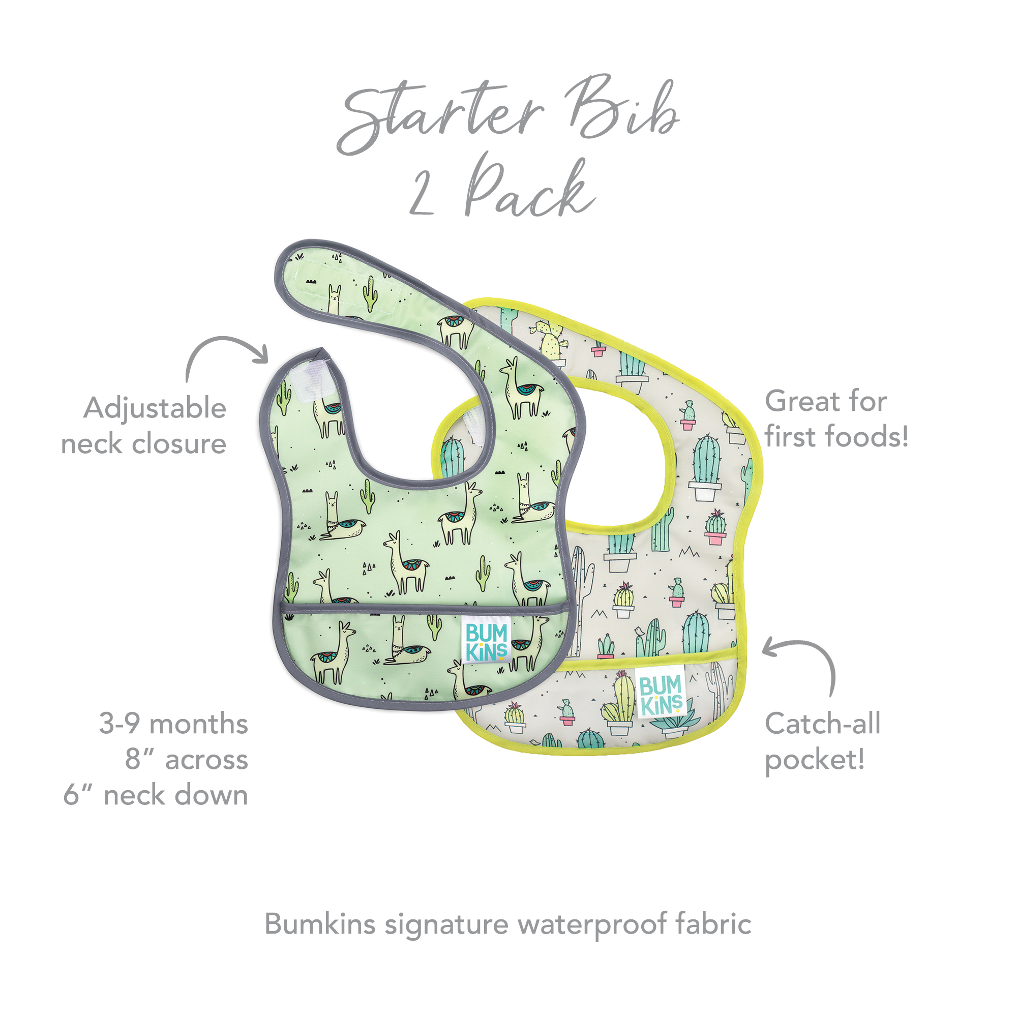 Perfectos para las primeras comidas del bebé, estos baberos de iniciación se sujetan en la parte posterior del hombro con un cierre autoadherente para un ajuste rápido, ajustable y a prueba de tirones, y cuentan con un gran bolsillo recogedor para ayudar a contener derrames, migas y mucho más. Los baberos Starter están fabricados con el tejido ligero, duradero e impermeable de Bumkins, resistente a las manchas y los olores. Su construcción de una sola capa significa que no hay que preocuparse por las cosas asquerosas que crecen entre las capas de tela. Estos baberos se pueden limpiar fácilmente con un paño y se pueden lavar a máquina, ¡y con un paquete de dos siempre tendrás uno a mano!
