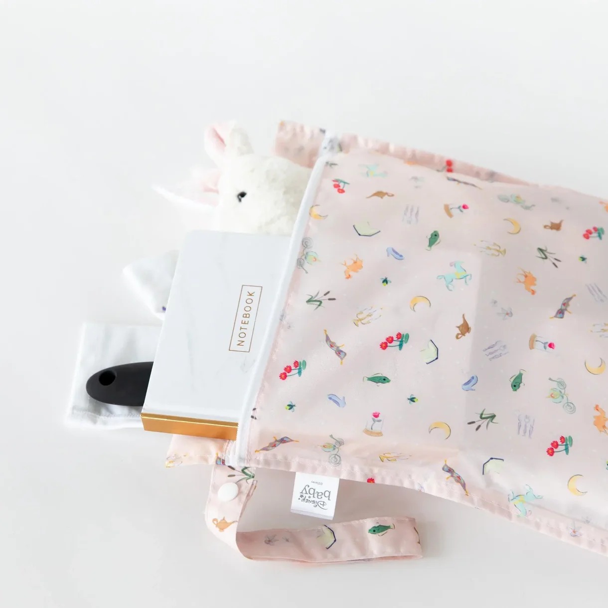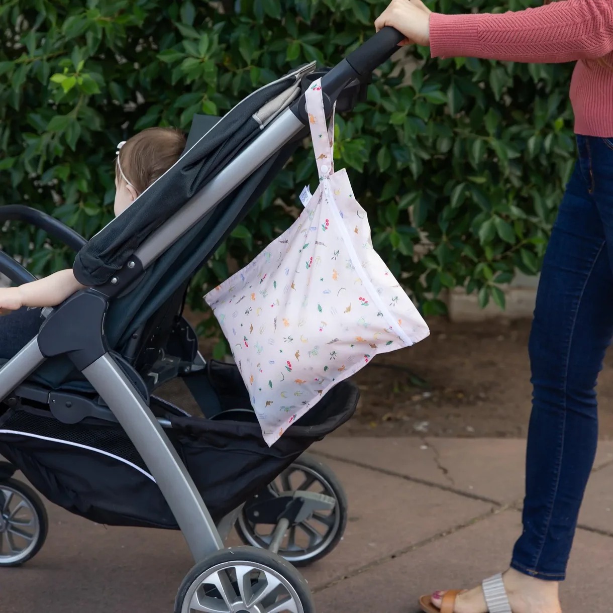 La mejor alternativa a las bolsas de plástico de un solo uso, nuestras bolsas húmedas reutilizables están fabricadas con el mismo tejido impermeable que el galardonado SuperBib de Bumkins. Nuestras bolsas cuentan con costuras termoselladas para una verdadera protección impermeable. Un suave cierre de cremallera impide que se ensucien, y su construcción de una sola capa significa que no hay que preocuparse de que crezcan cosas asquerosas entre las capas de tejido. Las bolsas húmedas son ideales para llevar pañales, ropa sucia del gimnasio y bañadores mojados. Y no sólo para las cosas mojadas: estas bolsas son excelentes organizadores para juguetes, accesorios, artículos de aseo, electrónica, viajes y mucho más. Con un asa a presión, enganche la bolsa donde la necesite: cochecito, cambiador o maleta. Las bolsas tienen un solo compartimento, no tienen fuelle, no están aisladas y no son elásticas.
