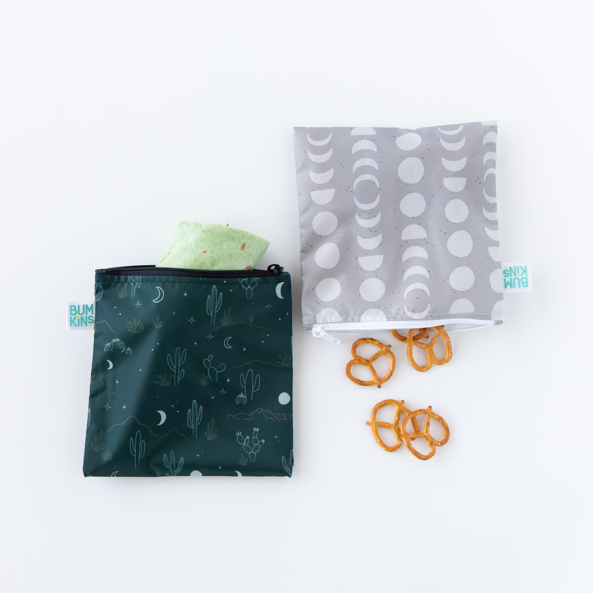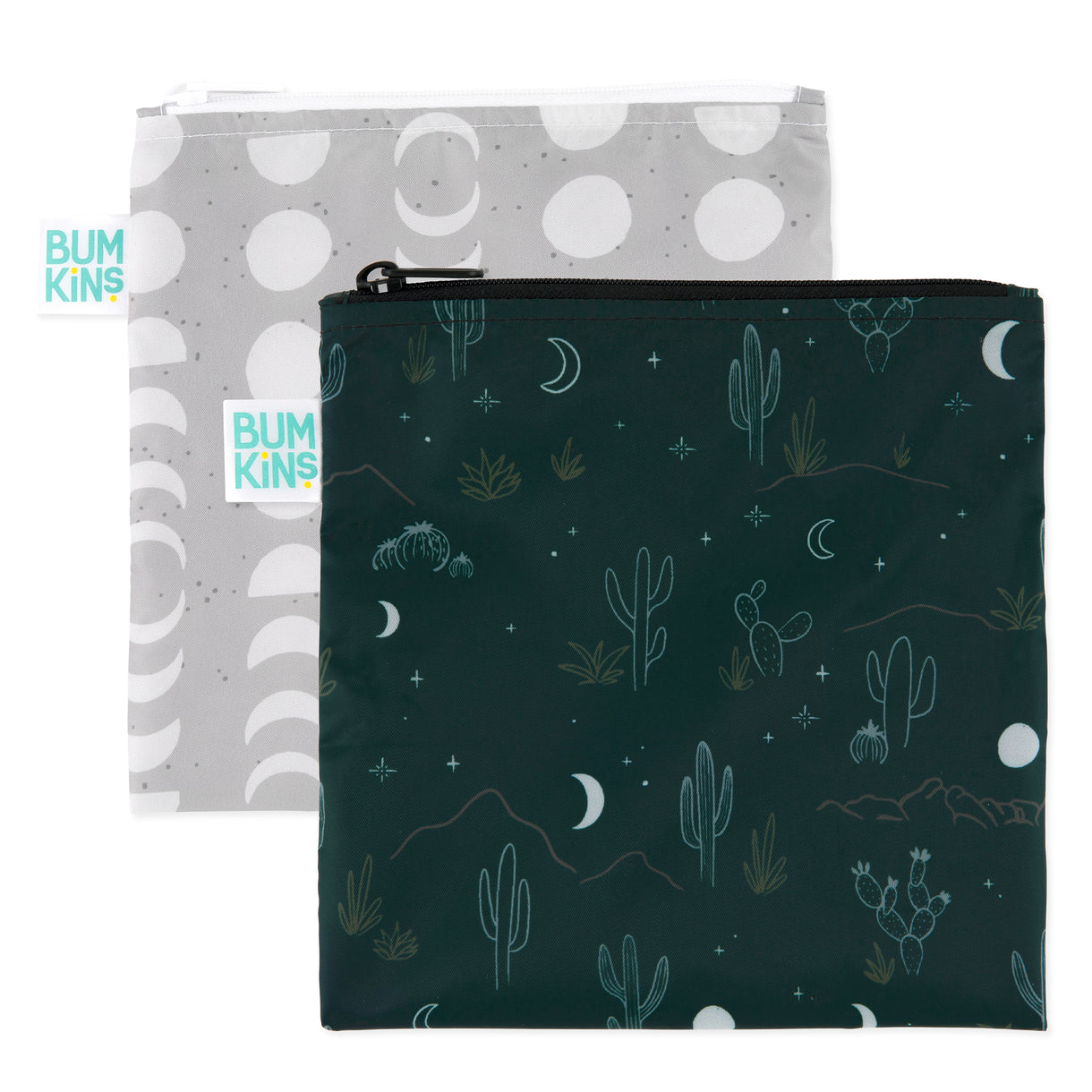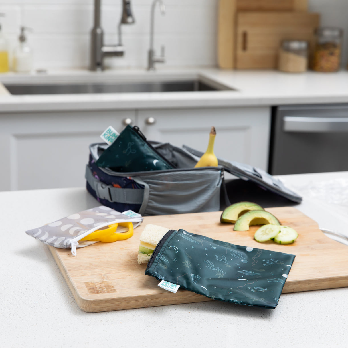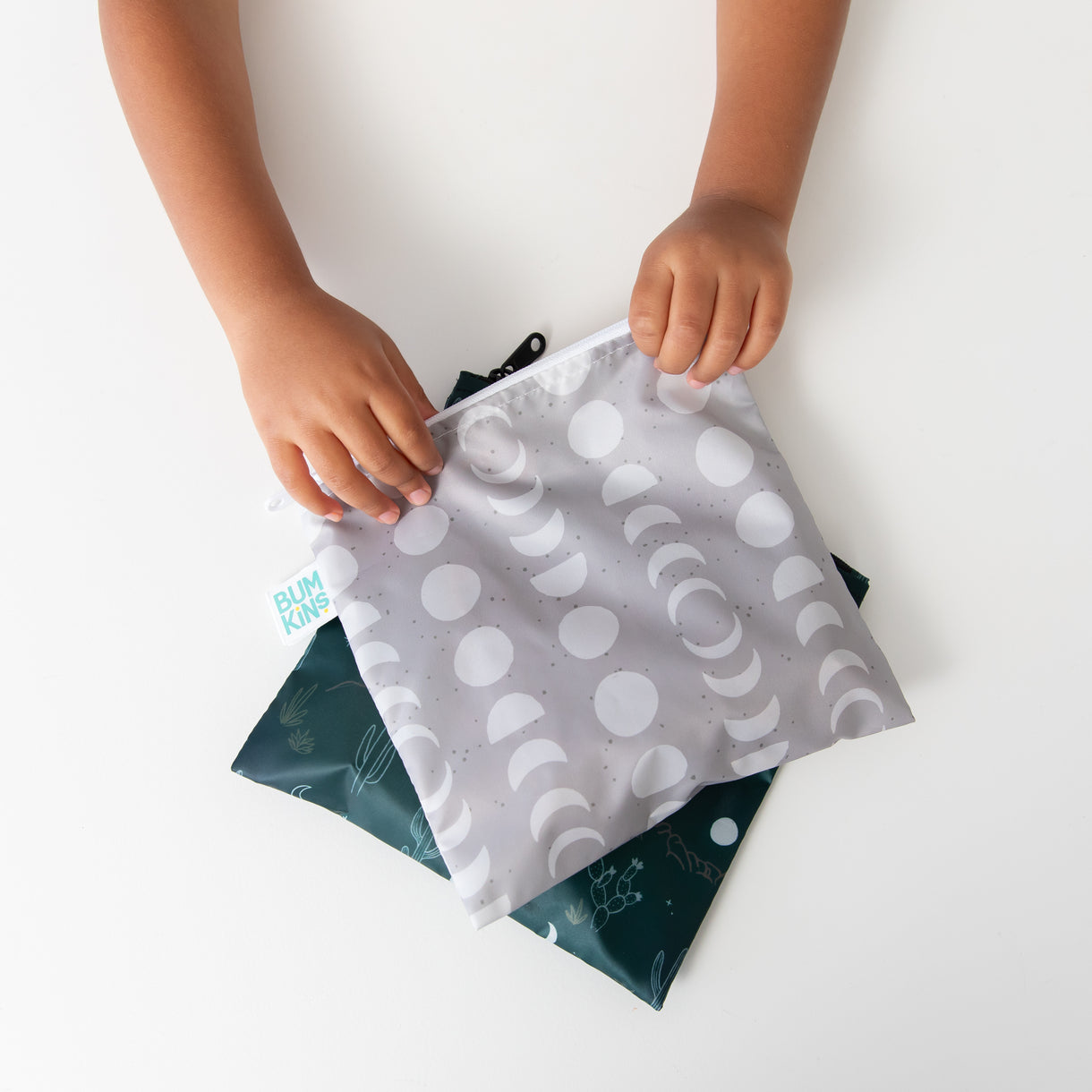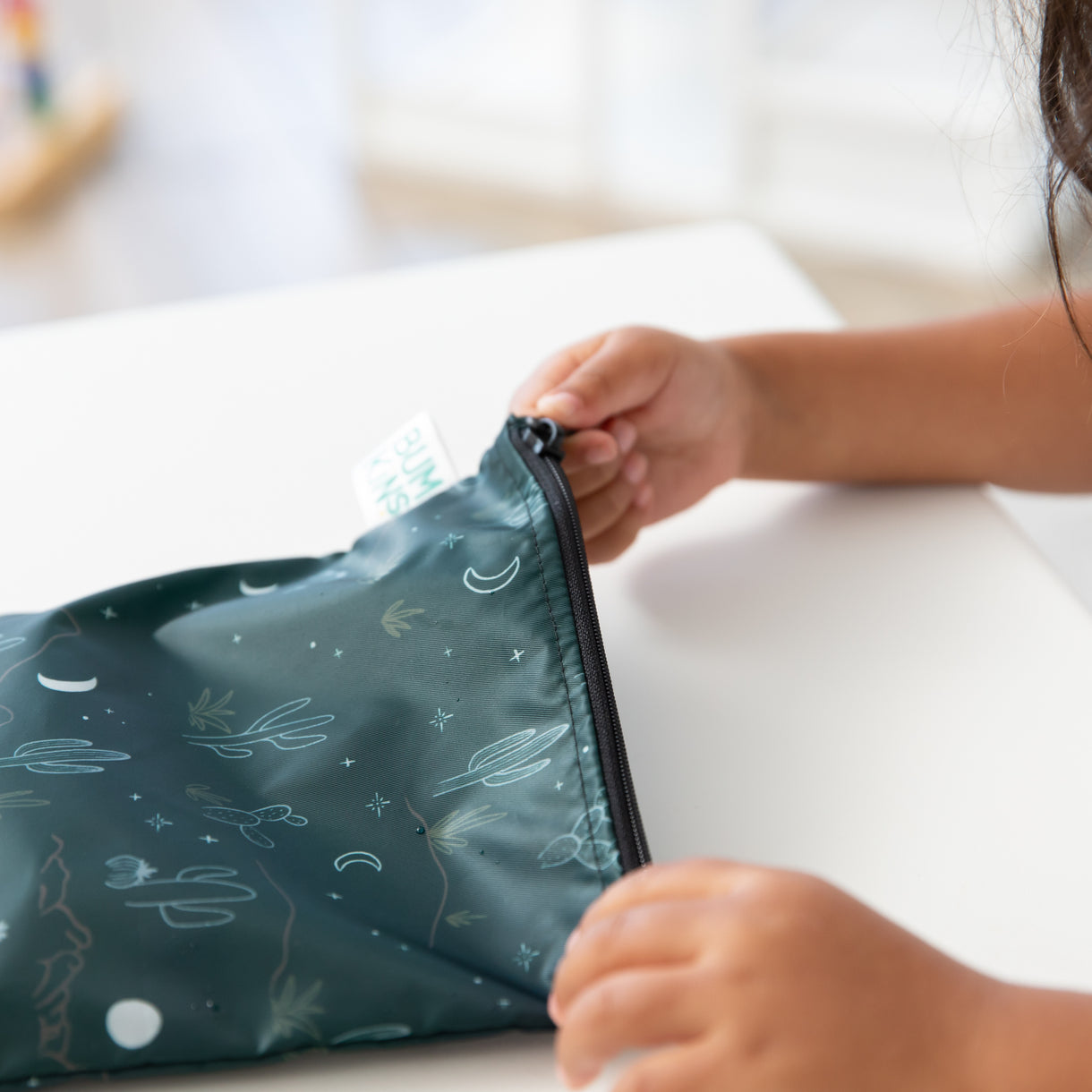Aidez à sauver la Terre, un petit changement à la fois. Alternative aux sacs en plastique à usage unique, nos grands sacs à goûter/sandwichs réutilisables sont fabriqués dans le même tissu imperméable que notre SuperBib primé. Une fermeture à glissière douce retient les miettes, et la construction à un seul pli signifie qu'il n'y a pas d'inquiétude à avoir quant à la prolifération d'éléments dégoûtants entre les couches de tissu. Parfaits pour manger et s'amuser, les sacs à goûter permettent d'organiser les déjeuners, les jouets, les appareils électroniques et bien d'autres choses encore. Ils peuvent même contenir un bagel !