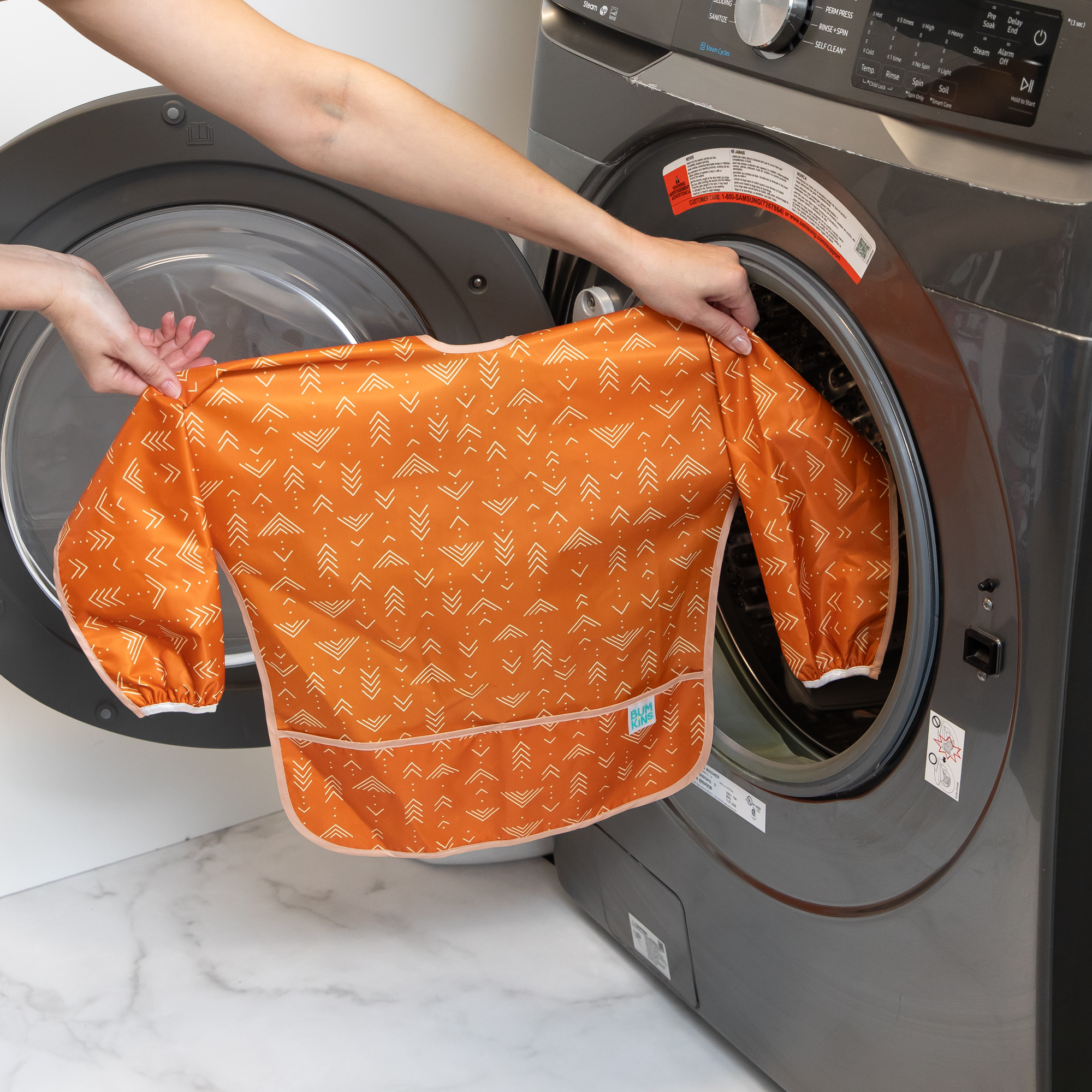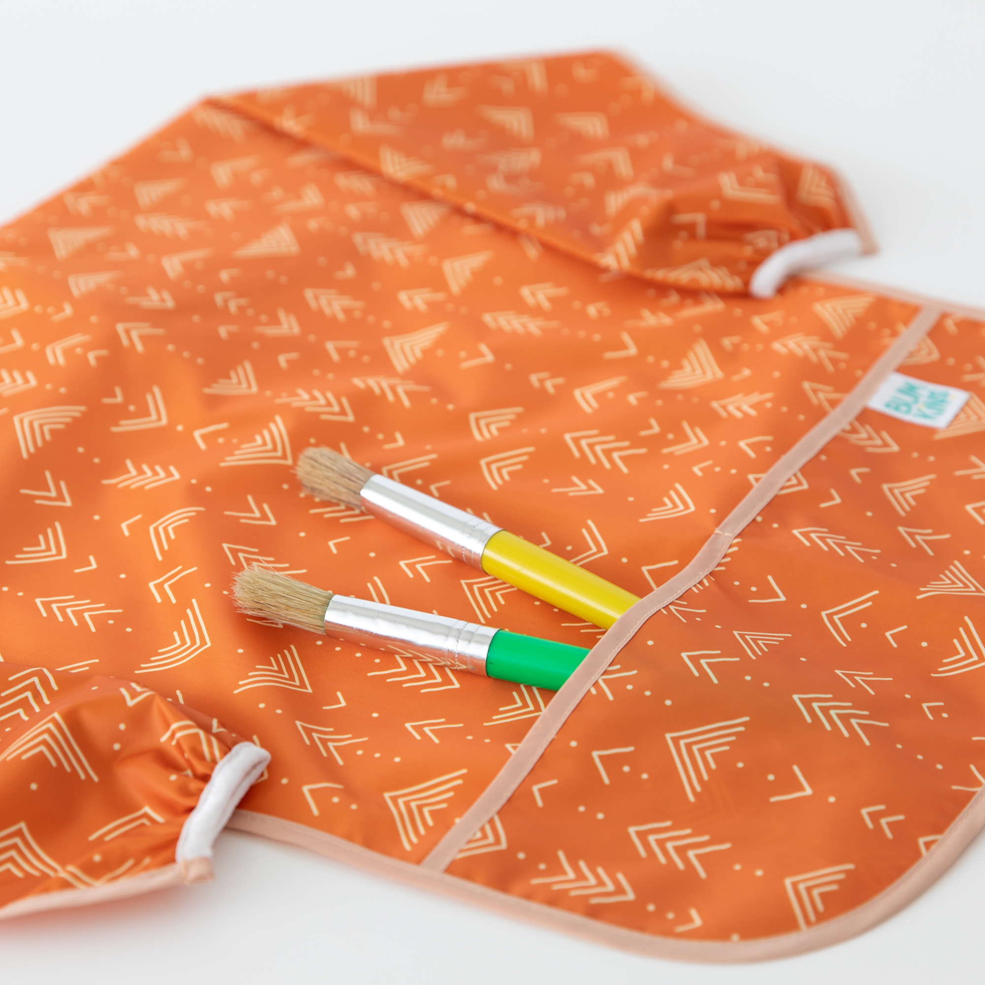 Stay wild, child! Perfect for your budding artist, the Long-Sleeved Art Smock keeps creativity from staining clothes! It can also be used as a bib for messy eaters that may have outgrown our Sleeved Bib. With a pocket large enough to hold art supplies or catch drips and spills. Made from Bumkins lightweight, waterproof, easy-wipe, stain and odor resistant fabric. Single ply construction means no worrying about icky stuff growing between layers of fabric. Without a cotton layer, stains and smells don't stick. Wipeable and machine washable for easy cleaning so you can use it over and over again! Adjustable tie neck closure.