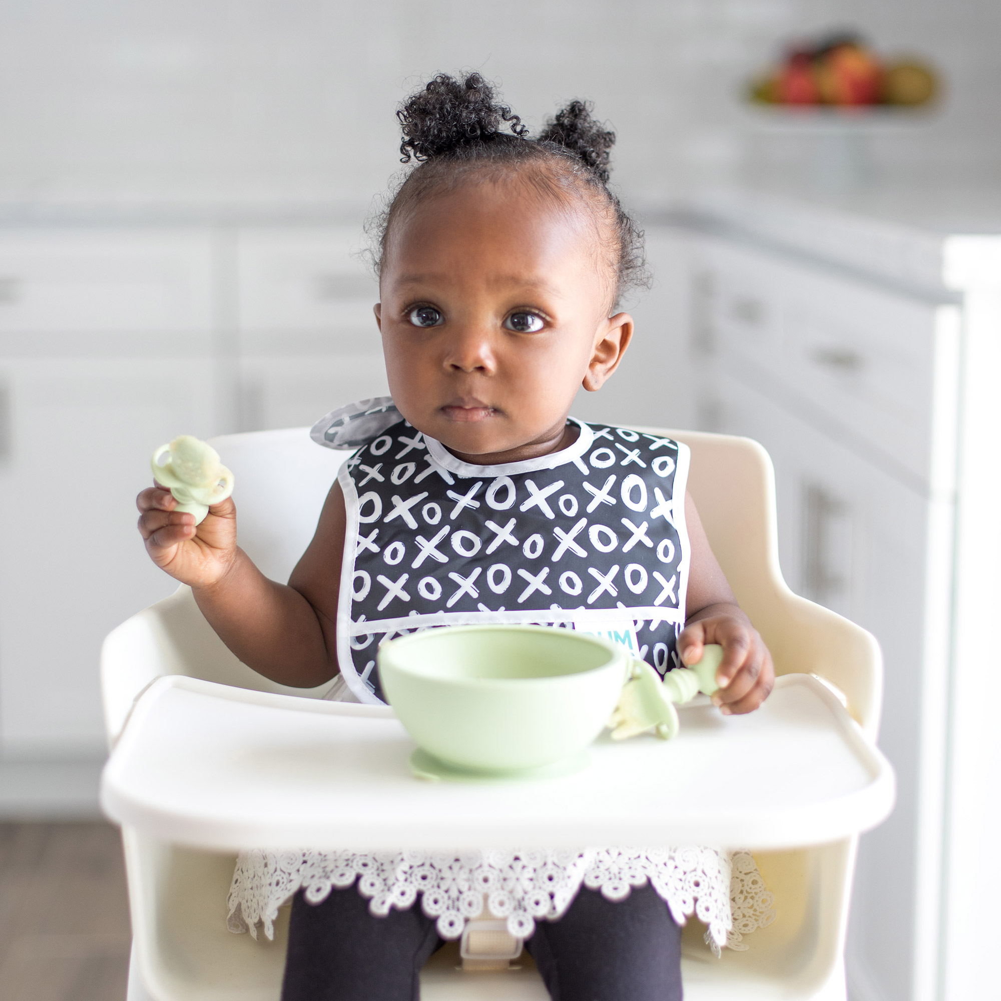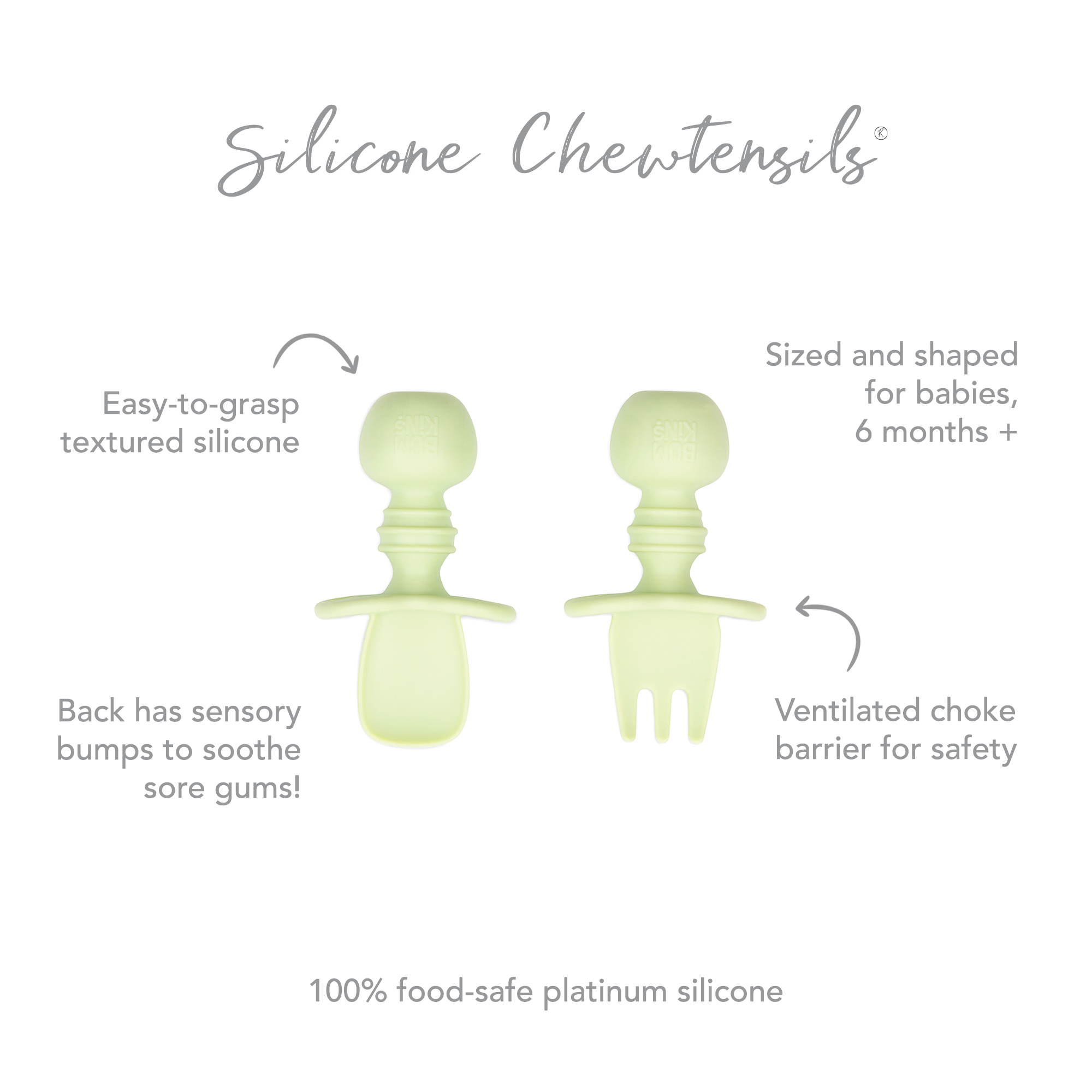 We designed Chewtensils for Stage 1 of baby-led weaning – introducing babies to the concept of holding a utensil and feeding themselves. Made from soft, textured, food-grade silicone that’s easy to grip and gentle on tender gums, with bendable heads for safety. The back of the spoon head has sensory bumps to stimulate gums. They’re perfect for dipping into puréed foods at the early part of baby led weaning. Chewtensils can be chewed on by younger babies before they’re ready to transition to silverware. They’re safe to use – made from 100% food-safe silicone.