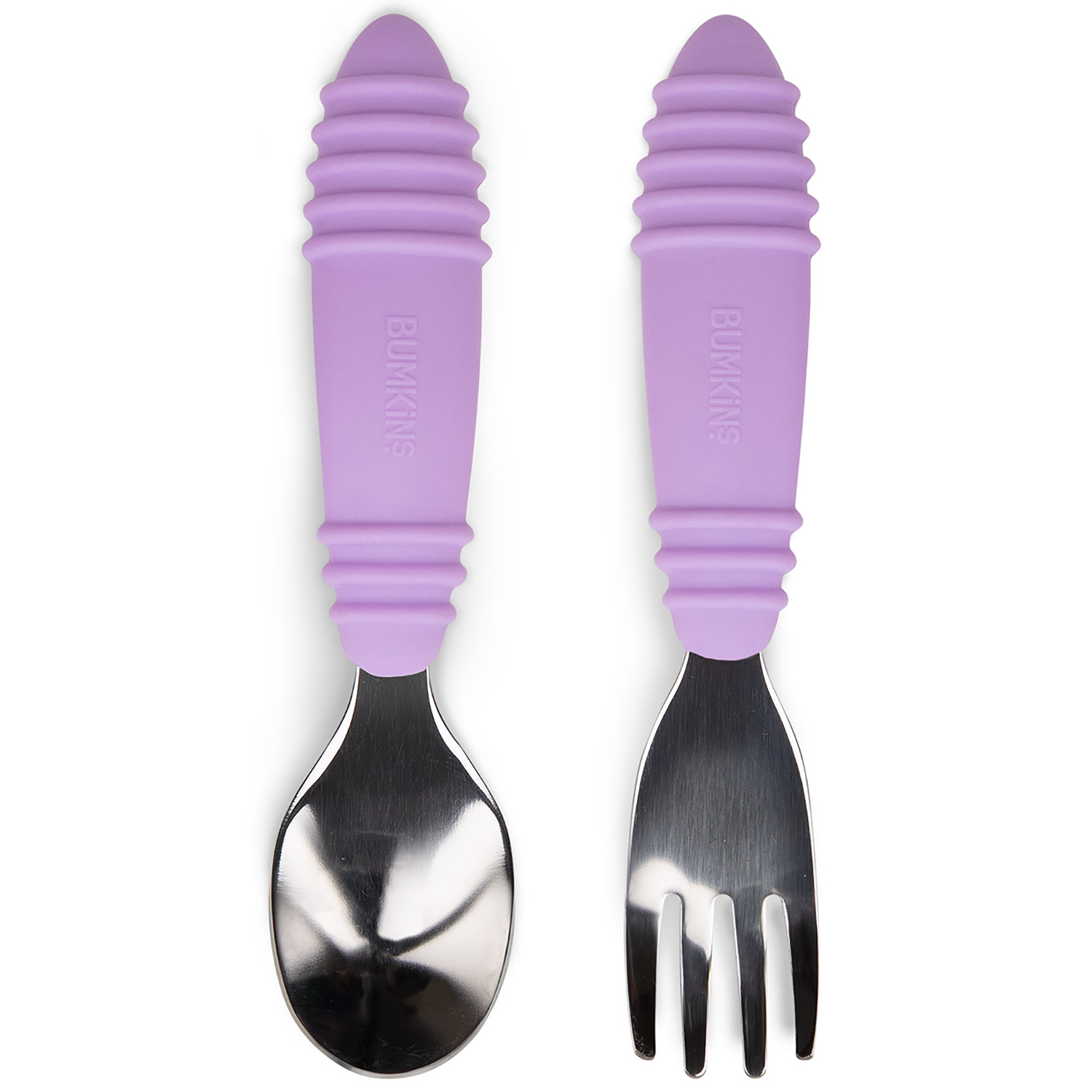 Little ones can dig into mealtime with our Spoon + Fork Set. Stainless steel fork and spoon heads are sized and shaped for toddlers. The concave heads help keep food on the fork or spoon, helping promote self-feeding with solid foods. The outer fork tines are bent to help spear foods and keep food on the fork. Handles are textured silicone so they’re easy-to-grip. Safe to use – made from 100% food-safe silicone.