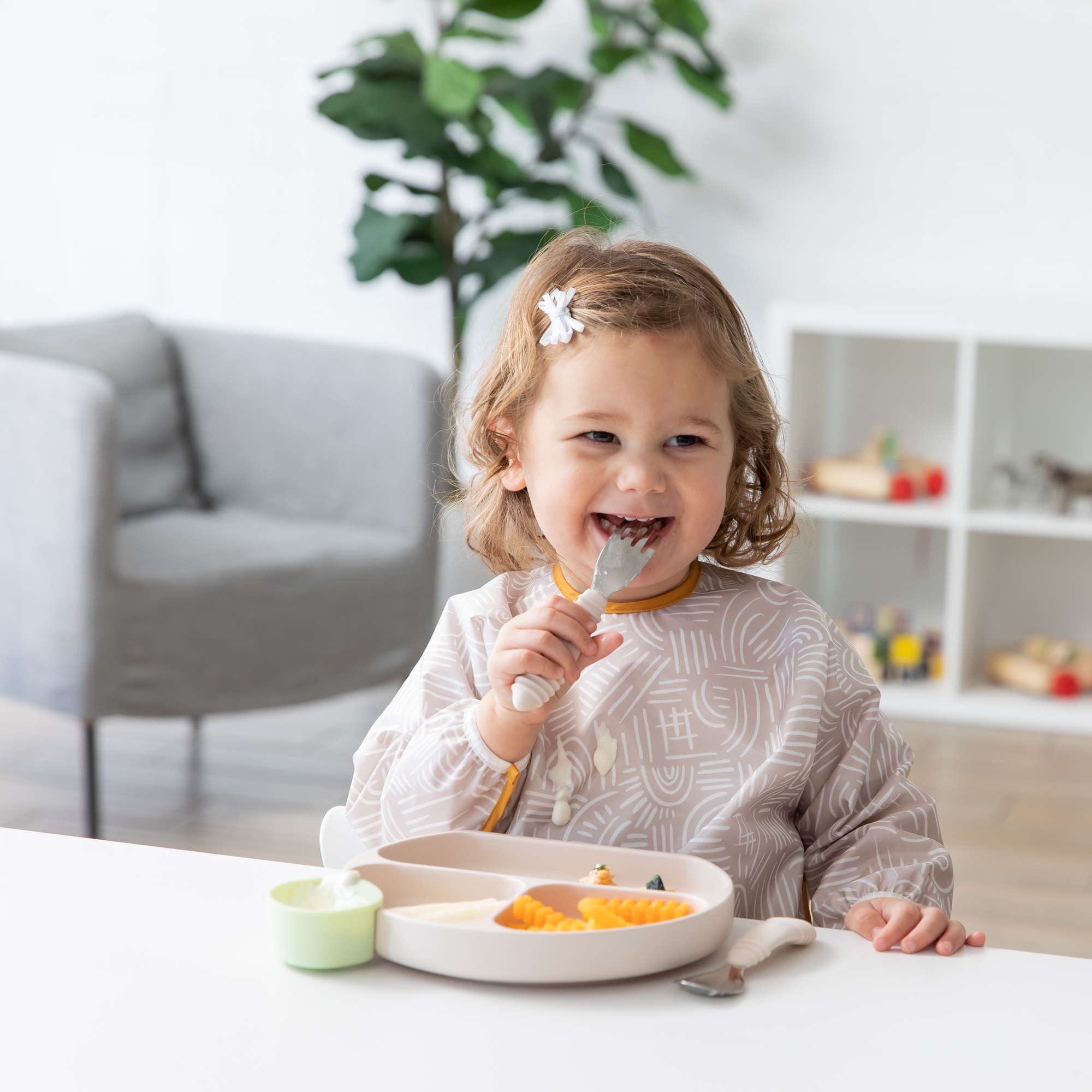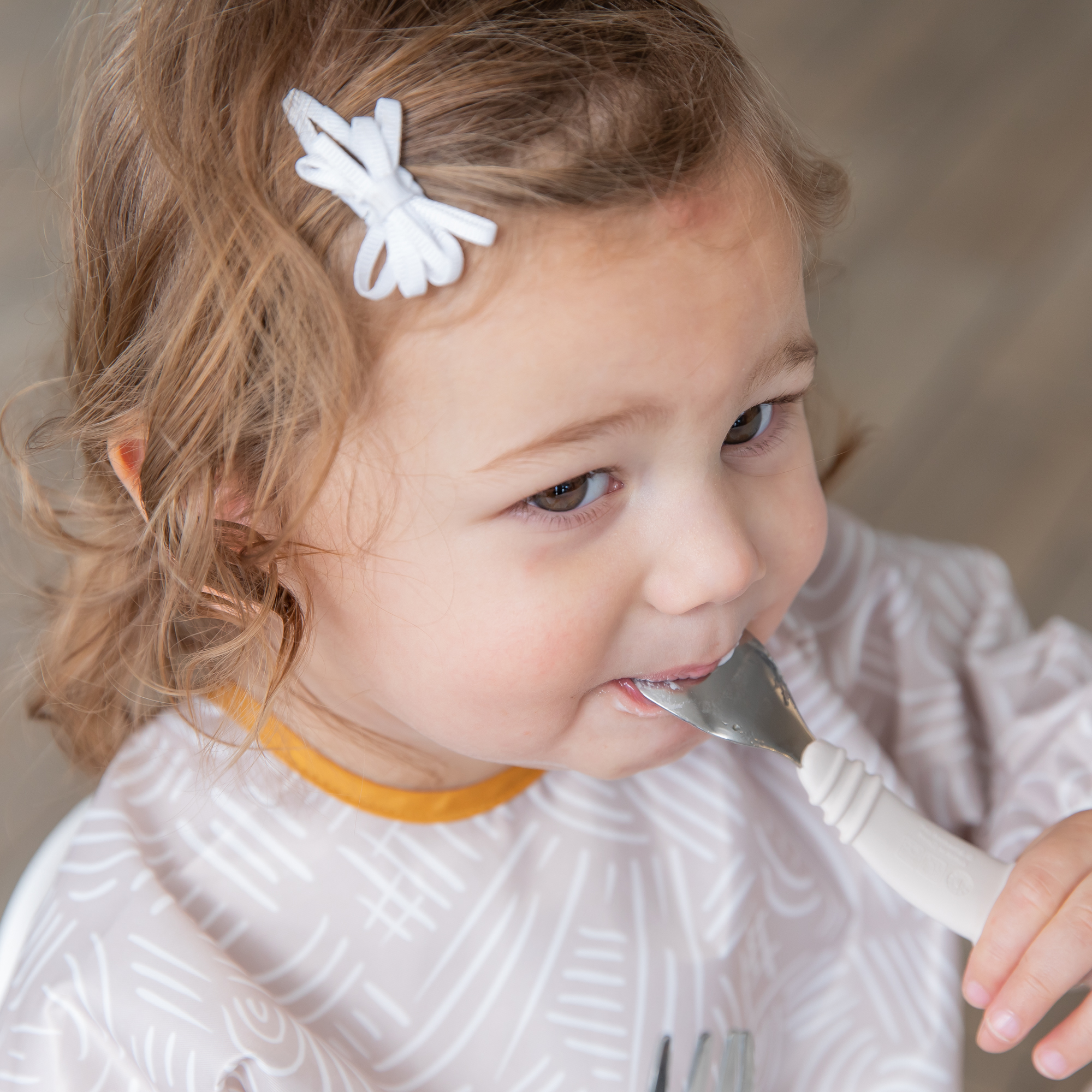 Little ones can dig into mealtime with our Spoon + Fork Set. Stainless steel fork and spoon heads are sized and shaped for toddlers. The concave heads help keep food on the fork or spoon, helping promote self-feeding with solid foods. The outer fork tines are bent to help spear foods and keep food on the fork. Handles are textured silicone so they’re easy-to-grip. Safe to use – made from 100% food-safe silicone.