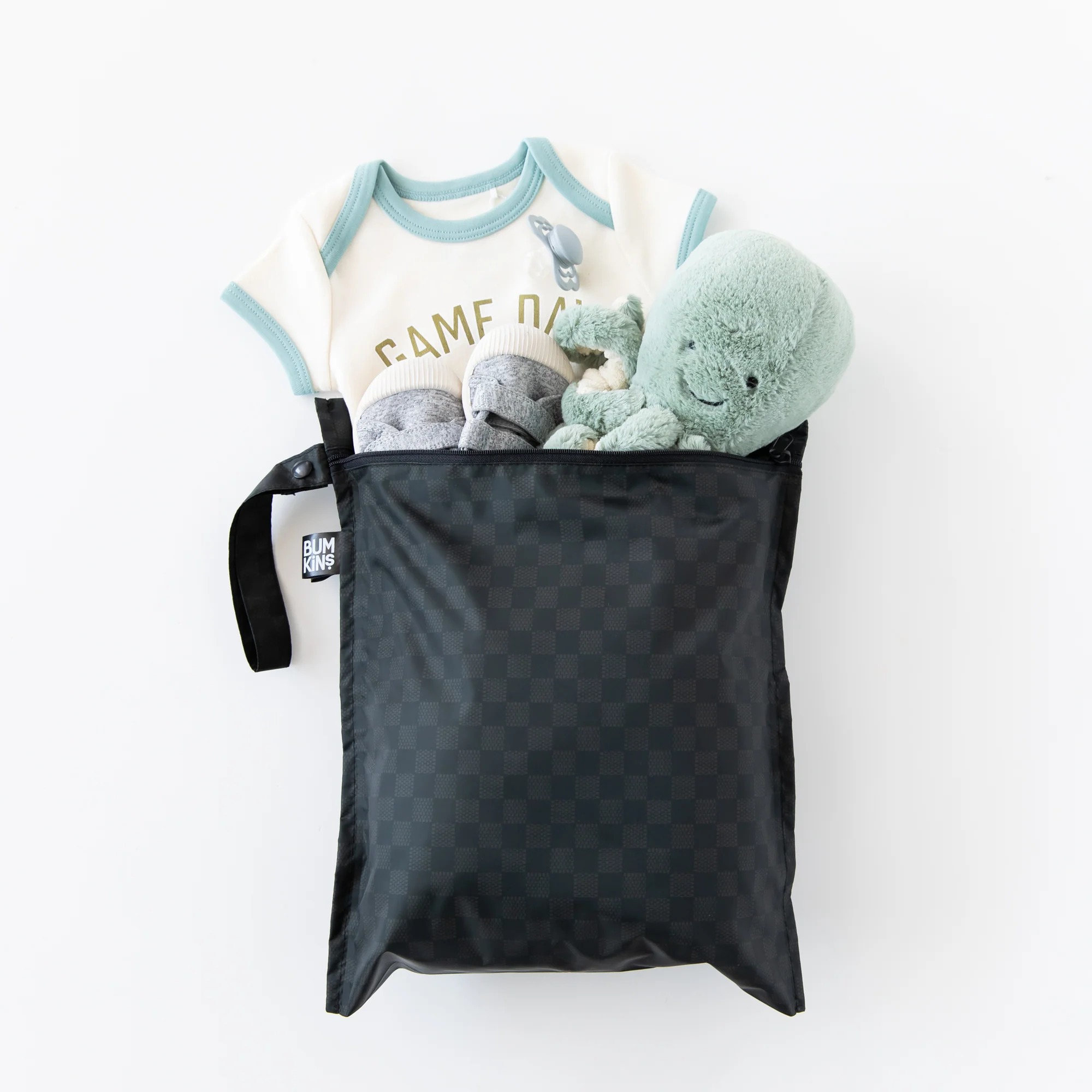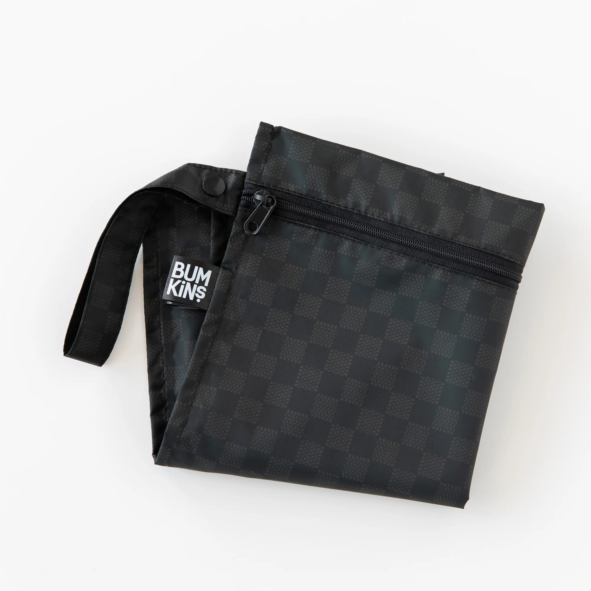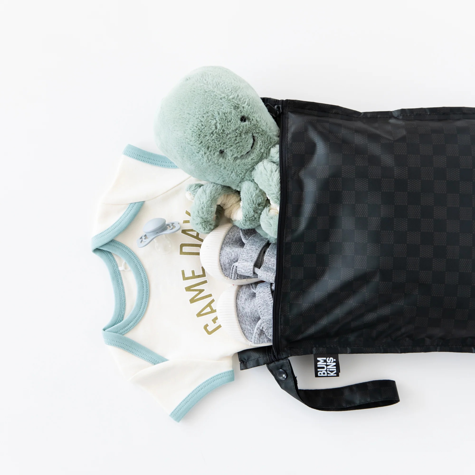 The better alternative to single-use plastic bags, our reusable Wet Bags are made from the same waterproof fabric as Bumkins award-winning SuperBib. Our bags feature heat-sealed seams for true waterproof protection. A smooth zipper closure locks away the mess, and single-ply construction means no worrying about icky stuff growing between layers of fabric. Wet bags are great for carrying diapers, dirty gym clothes, and wet swimsuits. Not just for wet stuff – these bags make excellent organizers for toys, accessories, toiletries, electronics, travel, and more! With a snap handle, snap your bag wherever you need it – stroller, changing table, or suitcase. Bags are single compartment, non-gusseted, non-insulated, and non-stretch.