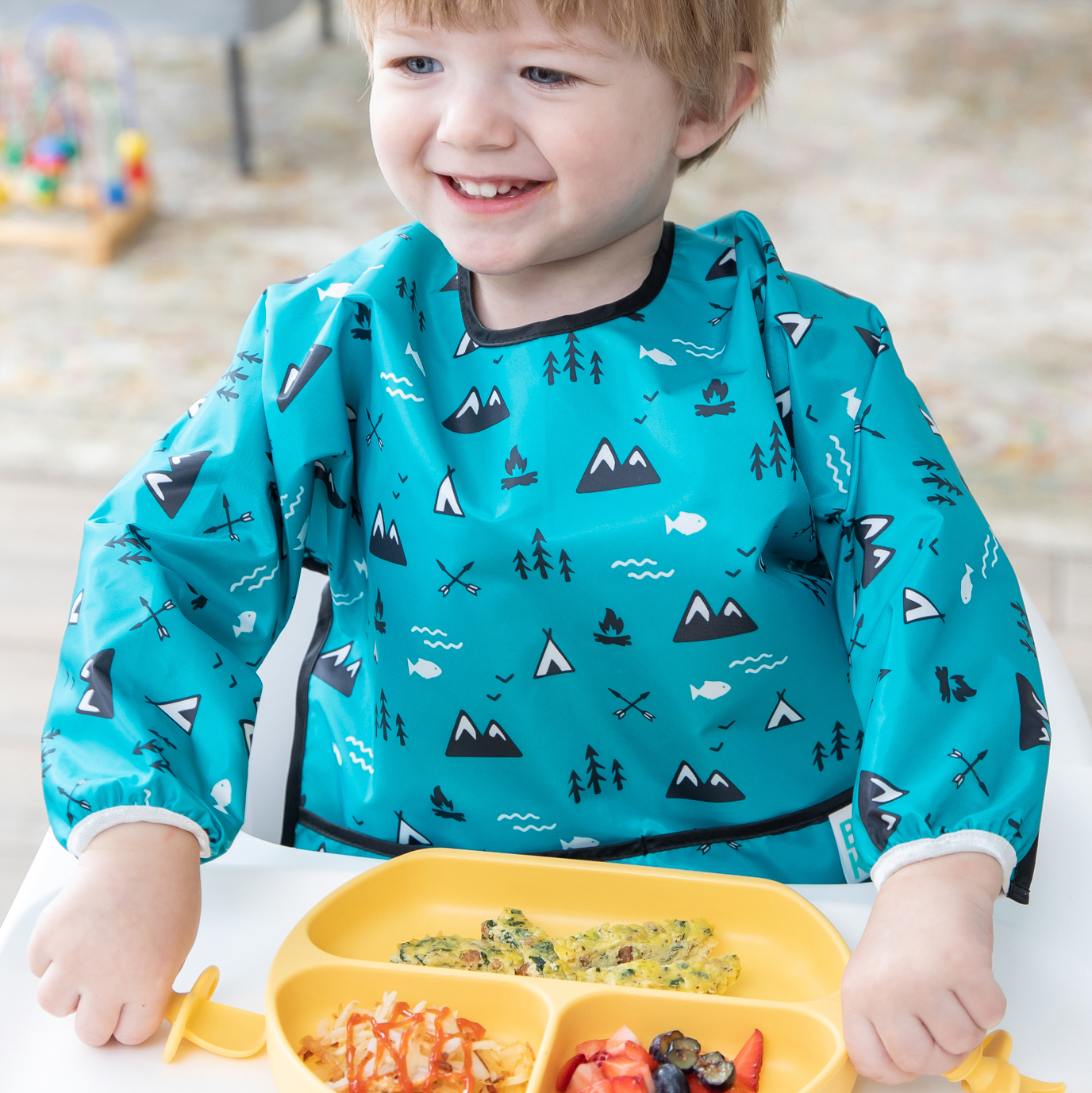 De taille généreuse et idéal pour nourrir le bébé, le bavoir à manches est fabriqué dans le tissu léger, durable et imperméable de Bumkins, qui résiste aux taches et aux odeurs. Avec une seule couche de tissu, vous n'avez pas à vous soucier de la prolifération de substances indésirables entre les couches. Ajustez la taille de votre enfant grâce à la fermeture à l'arrière et aux poignets élastiques. Une grande poche attrape-tout permet de contenir les éclaboussures, les miettes et bien plus encore. Essuyable et lavable en machine, elle se nettoie facilement pour que vous puissiez l'utiliser encore et encore !