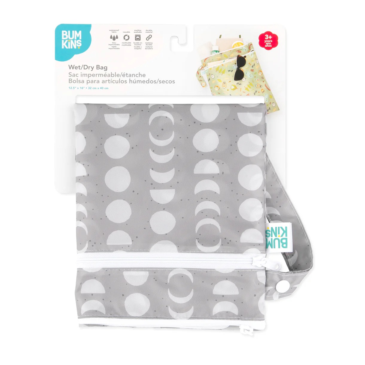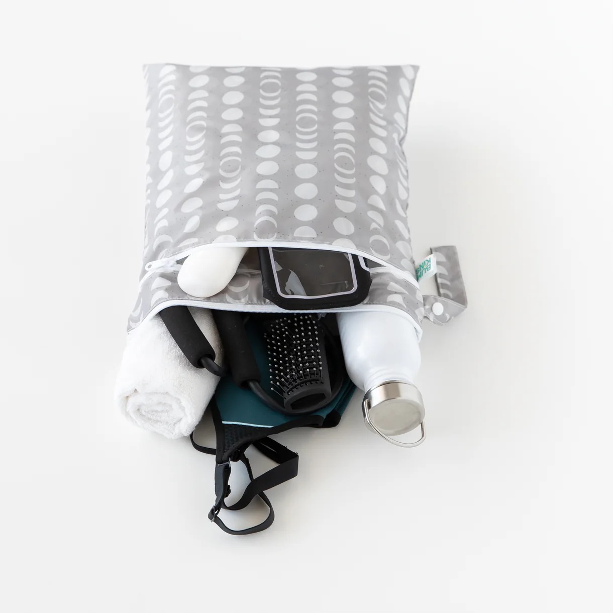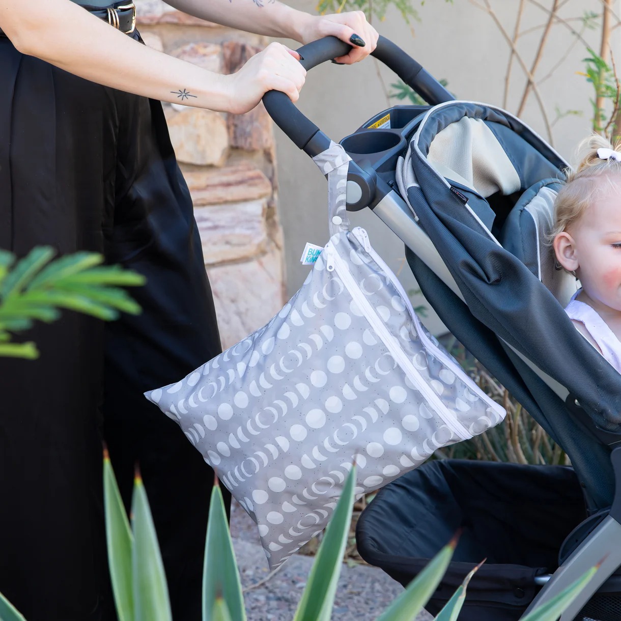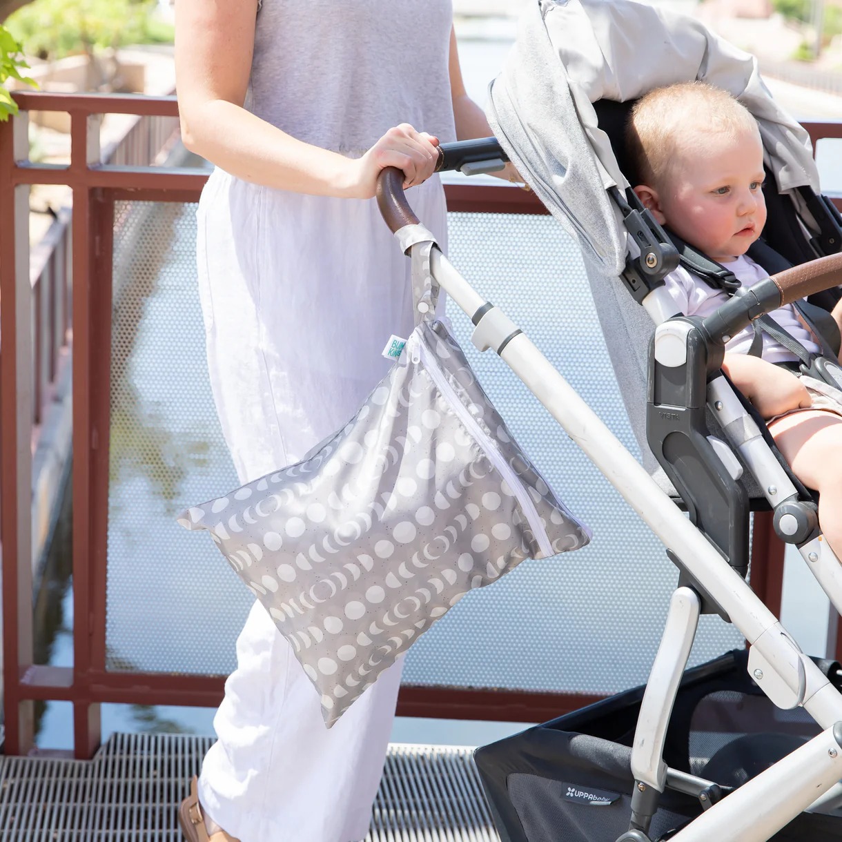 Meilleure alternative aux sacs plastiques à usage unique, nos sacs imperméable/étanche sont fabriqués à partir du même tissu imperméable que notre SuperBib. Nos sacs sont dotés de coutures thermosoudées pour une véritable protection imperméable. Deux compartiments à fermeture à glissière permettent de séparer les articles secs et humides. Grâce à la construction monocouche, vous n'avez pas à vous soucier de la prolifération d'éléments dégoûtants entre les couches de tissu. Les sacs Wet / Dry sont parfaits pour transporter les couches, les vêtements de sport sales et les maillots de bain mouillés. Ces sacs sont d'excellents organisateurs pour les jouets, les accessoires, les articles de toilette, les appareils électroniques, les voyages et bien plus encore ! Avec une poignée à pression, vous pouvez accrocher votre sac là où vous en avez besoin - poussette, table à langer ou valise. Les sacs n'ont pas de soufflet, ne sont pas isolés et ne sont pas extensibles.