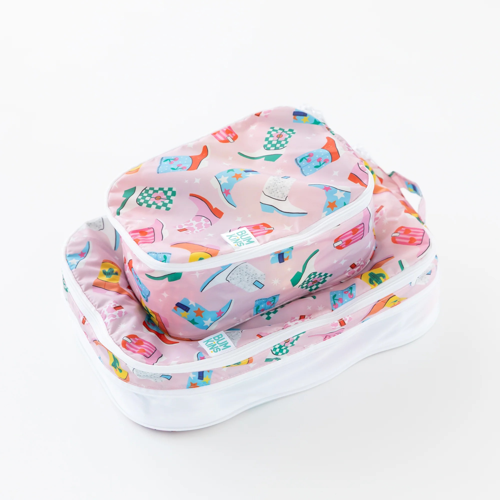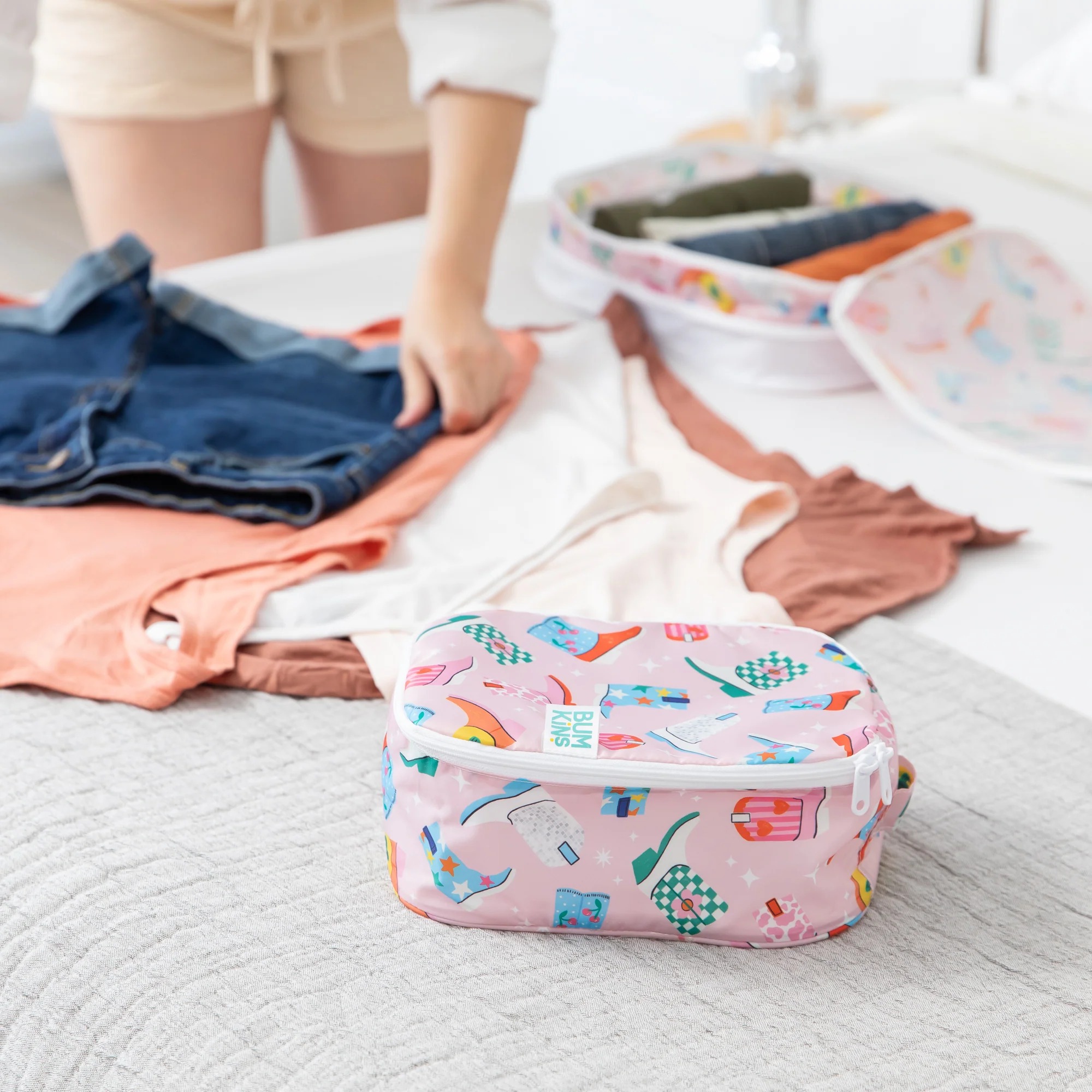 Emballez, emballez ! Voyagez avec style et restez organisé grâce aux cubes de rangement Bumkins. Fabriqués à partir de notre tissu imperméable, ces cubes de rangement sont durables, imperméables et résistants aux taches et aux odeurs. Quelle que soit la destination de votre prochaine aventure, nos cubes de rangement sont de formidables organisateurs pour les vêtements, les articles intimes, les articles de toilette, les appareils électroniques, les couches et bien plus encore. Fermeture éclair ou non ? Le plus grand cube d'emballage peut se comprimer ou s'étendre pour s'adapter à tous vos besoins de voyage.