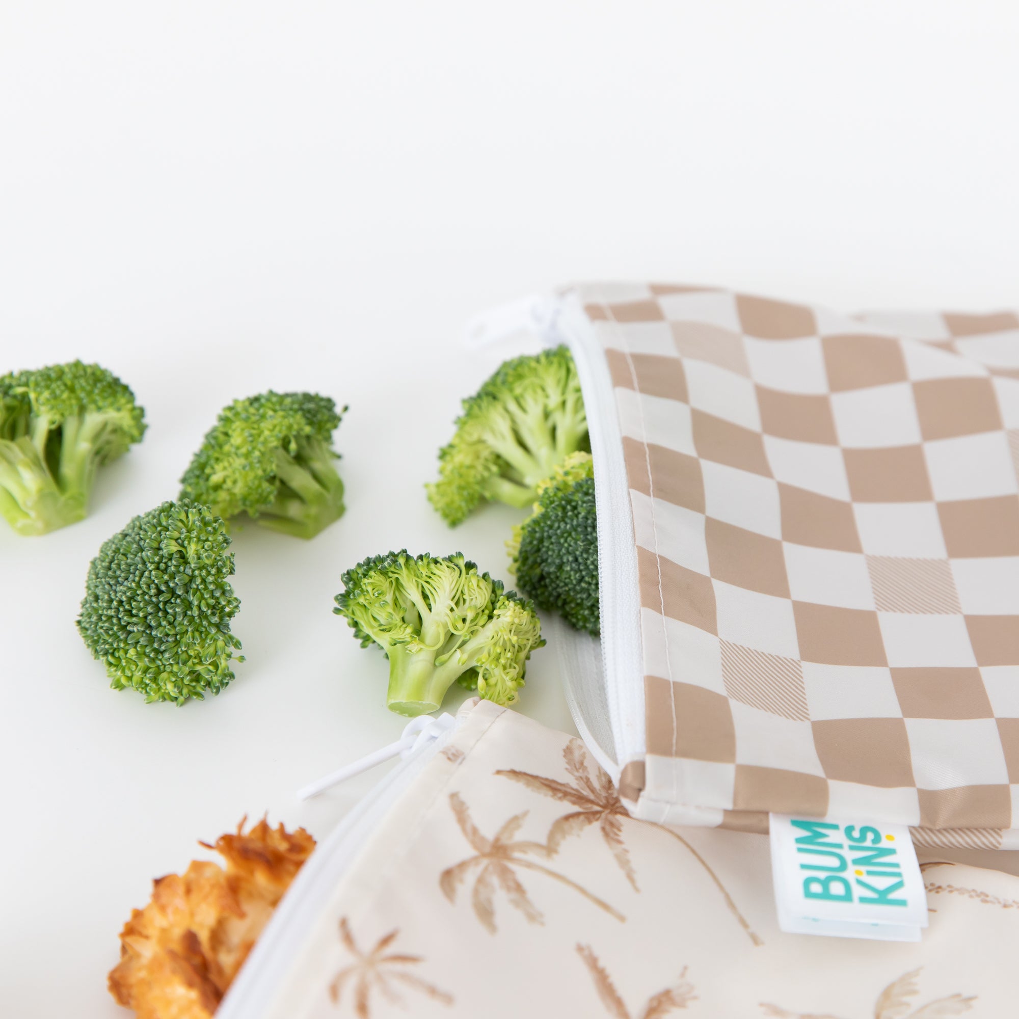 Aidez à sauver la Terre, un petit changement à la fois. Alternative aux sacs en plastique à usage unique, nos grands sacs à goûter/sandwichs réutilisables sont fabriqués dans le même tissu imperméable que notre SuperBib primé. Une fermeture à glissière douce retient les miettes, et la construction à un seul pli signifie qu'il n'y a pas d'inquiétude à avoir quant à la prolifération d'éléments dégoûtants entre les couches de tissu. Parfaits pour manger et s'amuser, les sacs à goûter permettent d'organiser les déjeuners, les jouets, les appareils électroniques et bien d'autres choses encore. Ils peuvent même contenir un bagel !