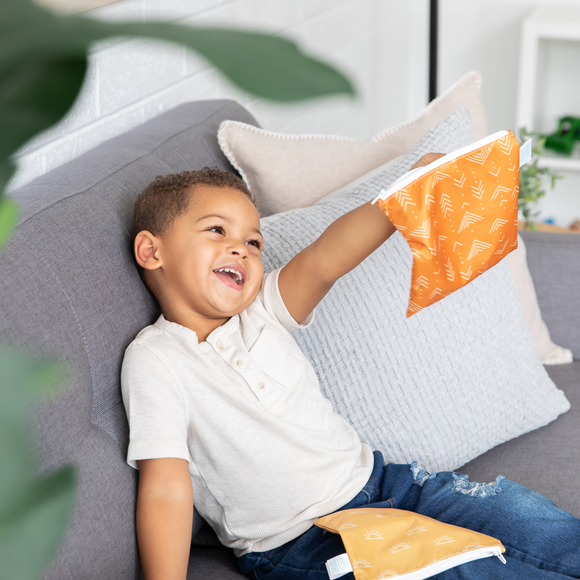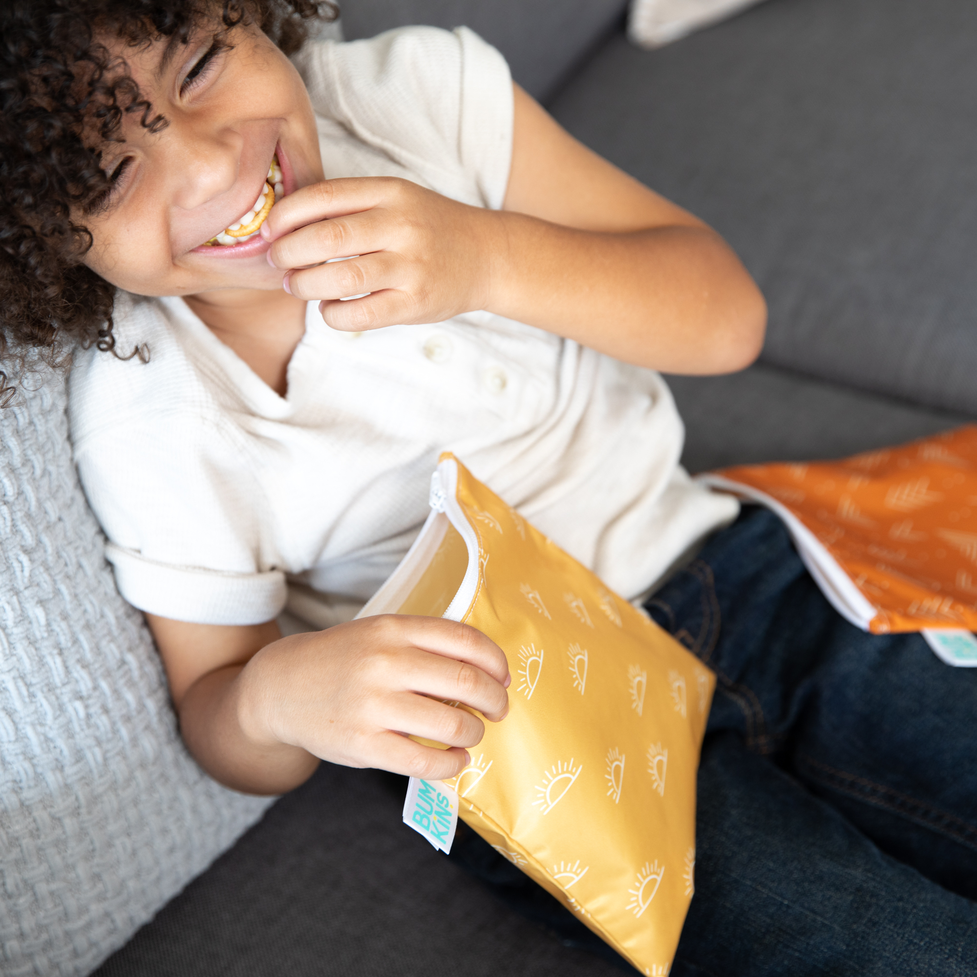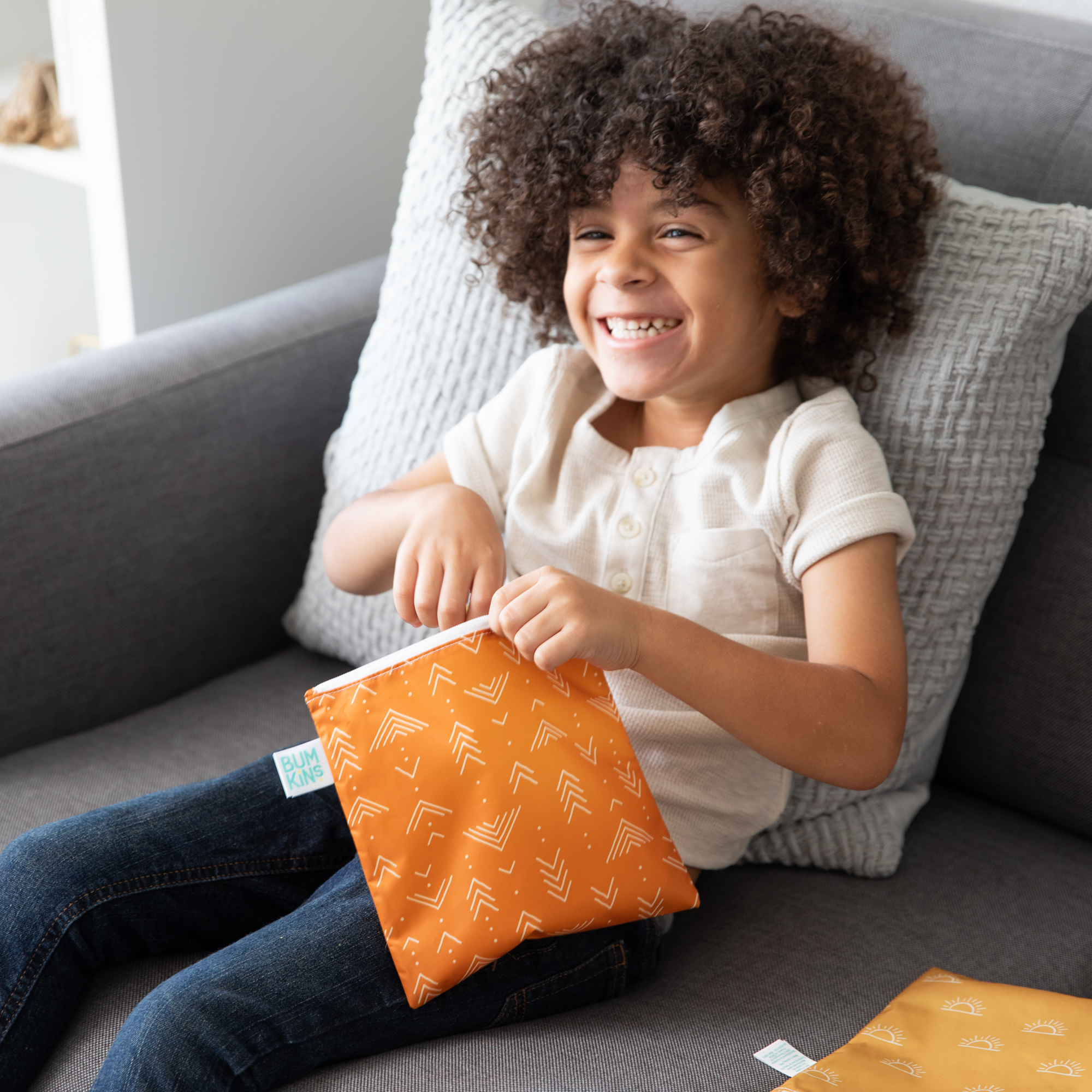 Aidez à sauver la Terre, un petit changement à la fois. Alternative aux sacs en plastique à usage unique, nos grands sacs à goûter/sandwichs réutilisables sont fabriqués dans le même tissu imperméable que notre SuperBib primé. Une fermeture à glissière douce retient les miettes, et la construction à un seul pli signifie qu'il n'y a pas d'inquiétude à avoir quant à la prolifération d'éléments dégoûtants entre les couches de tissu. Parfaits pour manger et s'amuser, les sacs à goûter permettent d'organiser les déjeuners, les jouets, les appareils électroniques et bien d'autres choses encore. Ils peuvent même contenir un bagel !