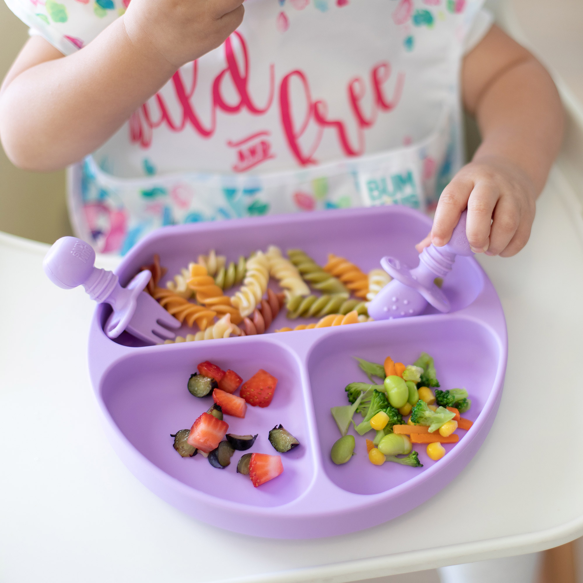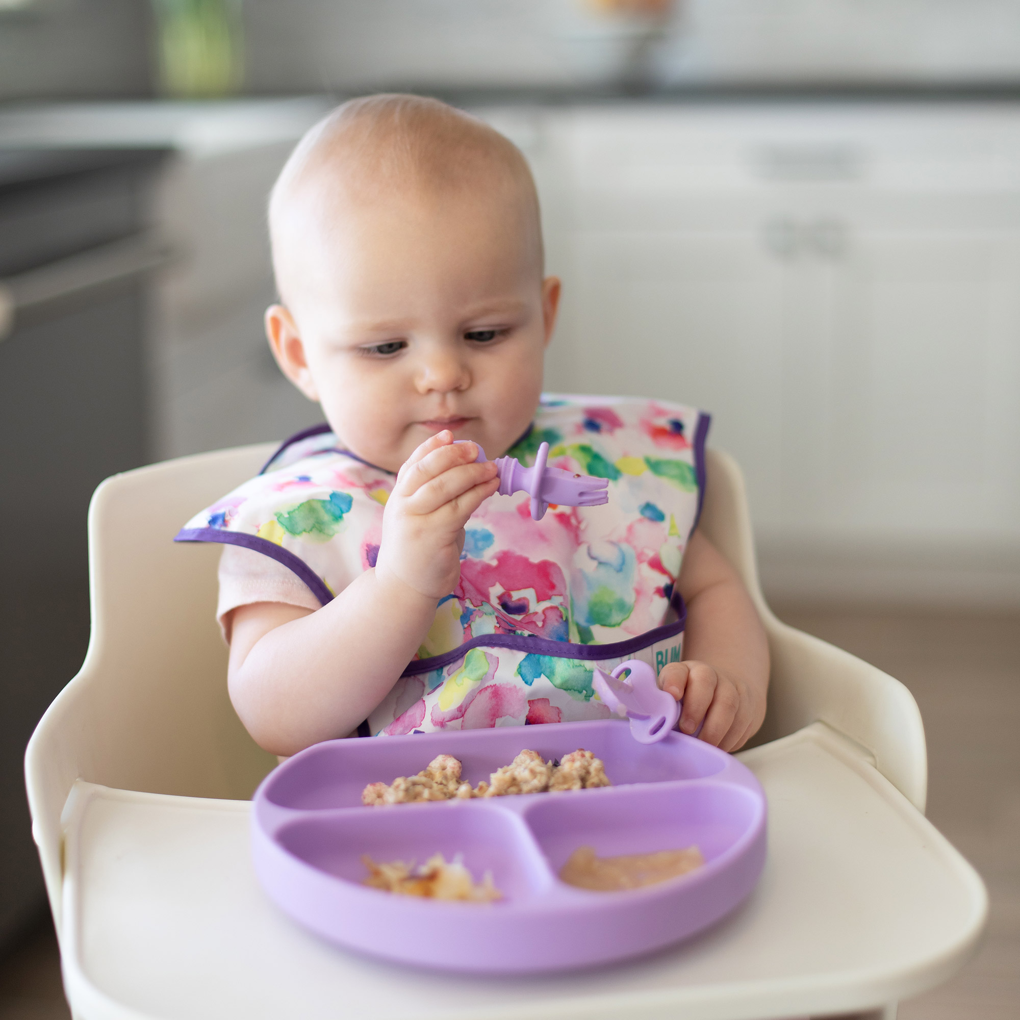 Nous avons conçu les Chewtensils pour l'étape 1 du sevrage dirigé par le bébé, qui consiste à initier les bébés au concept de tenir un ustensile et de se nourrir eux-mêmes. Fabriquées en silicone alimentaire souple et texturé, elles sont faciles à saisir et respectent les gencives sensibles. Les têtes sont pliables pour plus de sécurité. L'arrière de la tête de la cuillère présente des bosses sensorielles qui stimulent les gencives. Ils sont parfaits pour plonger dans les aliments en purée au début du sevrage dirigé par le bébé. Les ustensiles de mastication peuvent être mâchouillés par les jeunes bébés avant qu'ils ne soient prêts à passer à l'argenterie. Ils sont sûrs à utiliser - fabriqués en silicone 100 % alimentaire.