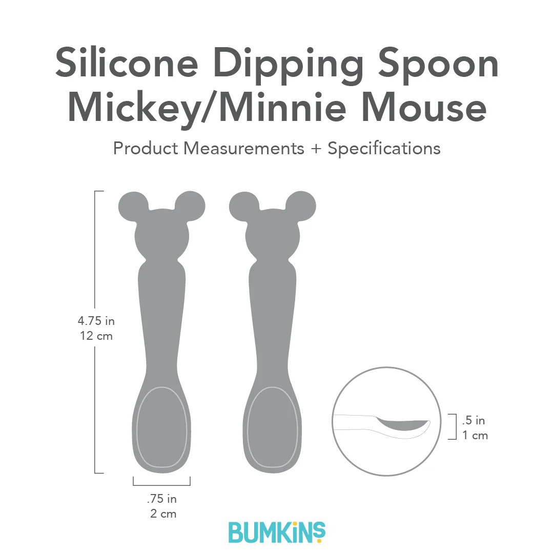 Introduce baby to the world of self-feeding and utensils with this set of starter spoons featuring the iconic shape of Mickey and Minnie Mouse’s ears. Made from 100% food-safe silicone that is gentle on gums, these spoons are the ideal size for a baby to begin the motions of self-feeding while under the supervision of an adult. With two in a set, there are enough spoons for both caregiver and baby to have one in hand and avoid any power struggles with independent eaters. Spoons can be used with the Bumkins Silicone First Feeding Set: Mickey Mouse or separately. Easy to clean by hand and dishwasher safe.