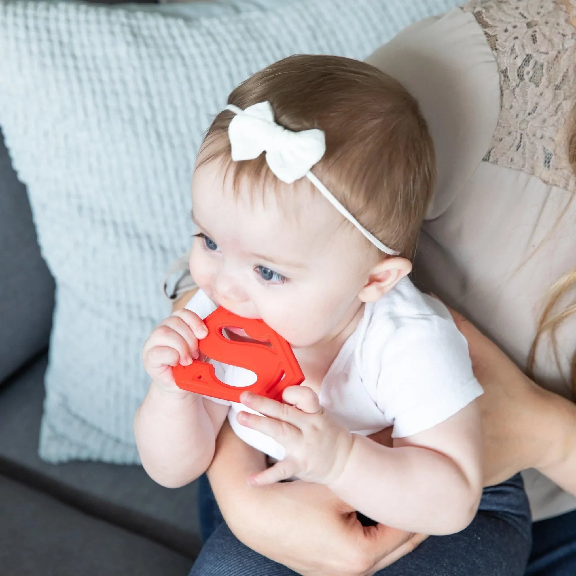 Soothe baby’s sore gums with our Superman Teether. Made from silicone that’s flexible and gentle enough when your baby wants soft pressure on their gums. Texture massages and provides relief to gums while allowing your baby to explore shapes. Chill for added relief. Silicone has a natural resistance to bacteria. It can be safely boiled to sterilize. Made from 100% food-safe silicone and does not contain any petroleum-based plastics or toxic chemicals.