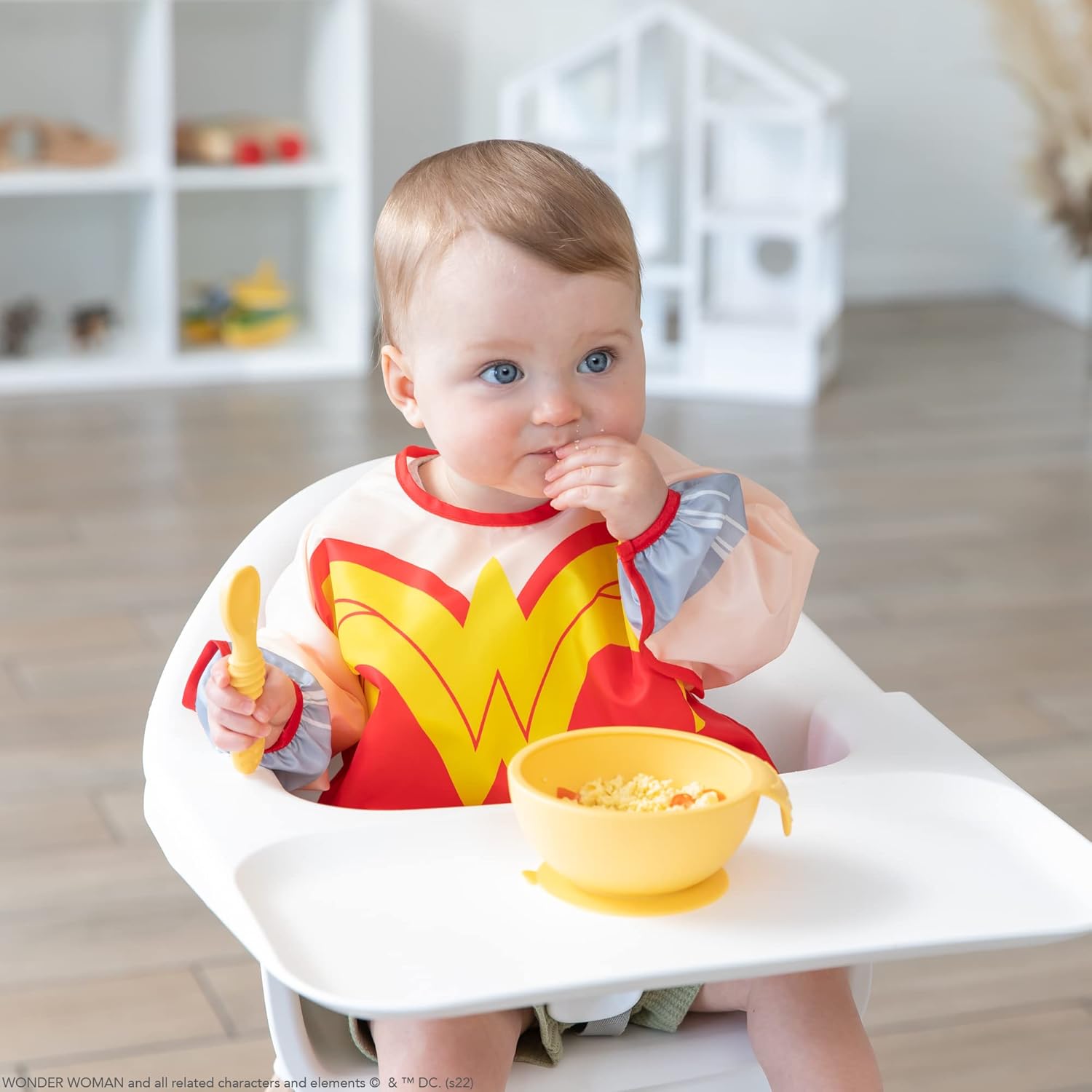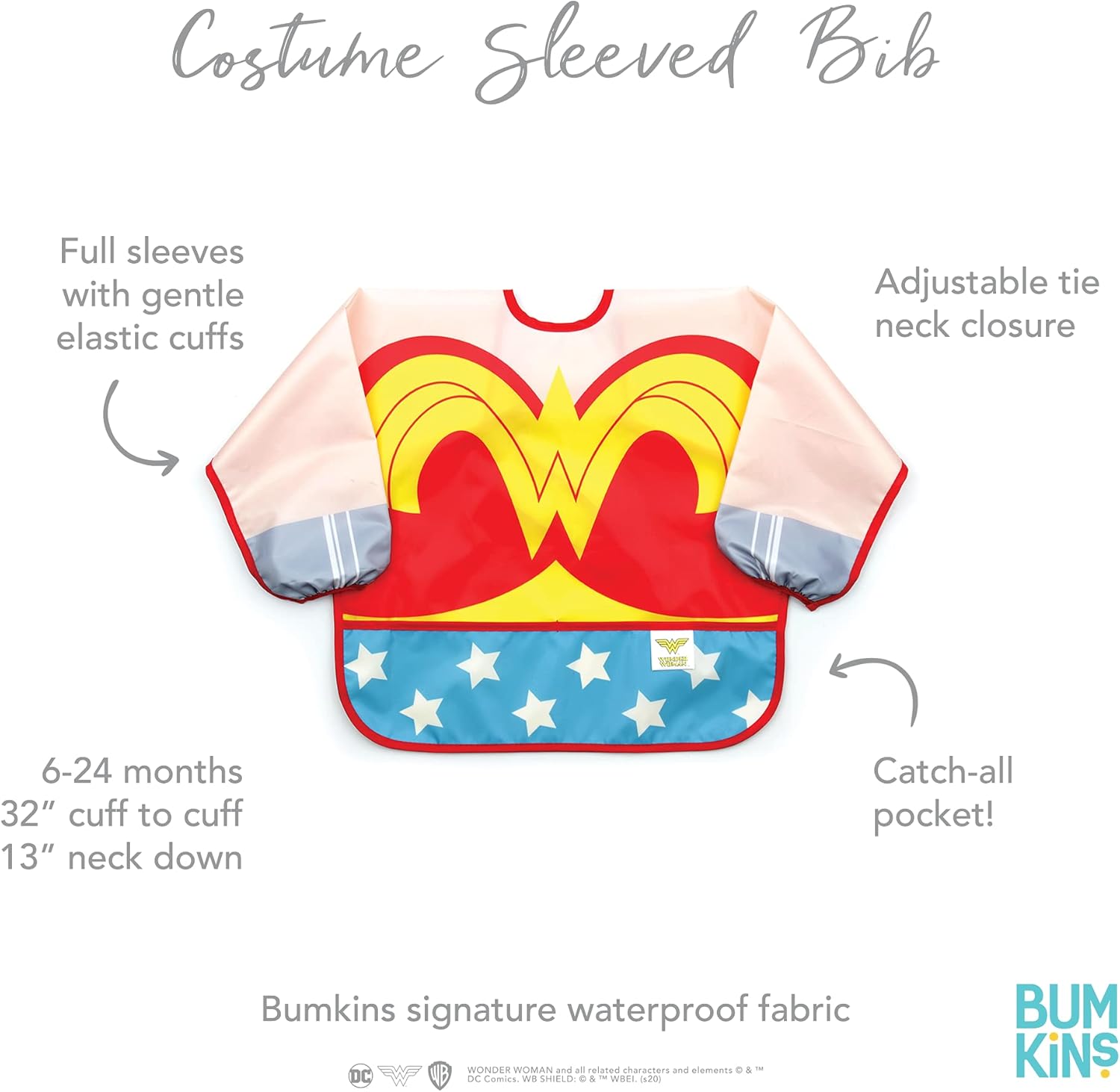 De taille généreuse et idéal pour nourrir le bébé, le bavoir à manches est fabriqué dans le tissu léger, durable et imperméable de Bumkins, qui résiste aux taches et aux odeurs. Avec une seule couche de tissu, vous n'avez pas à vous soucier de la prolifération de substances indésirables entre les couches. Ajustez la taille de votre enfant grâce à la fermeture à l'arrière et aux poignets élastiques. Une grande poche attrape-tout permet de contenir les éclaboussures, les miettes et bien plus encore. Essuyable et lavable en machine, elle se nettoie facilement pour que vous puissiez l'utiliser encore et encore !