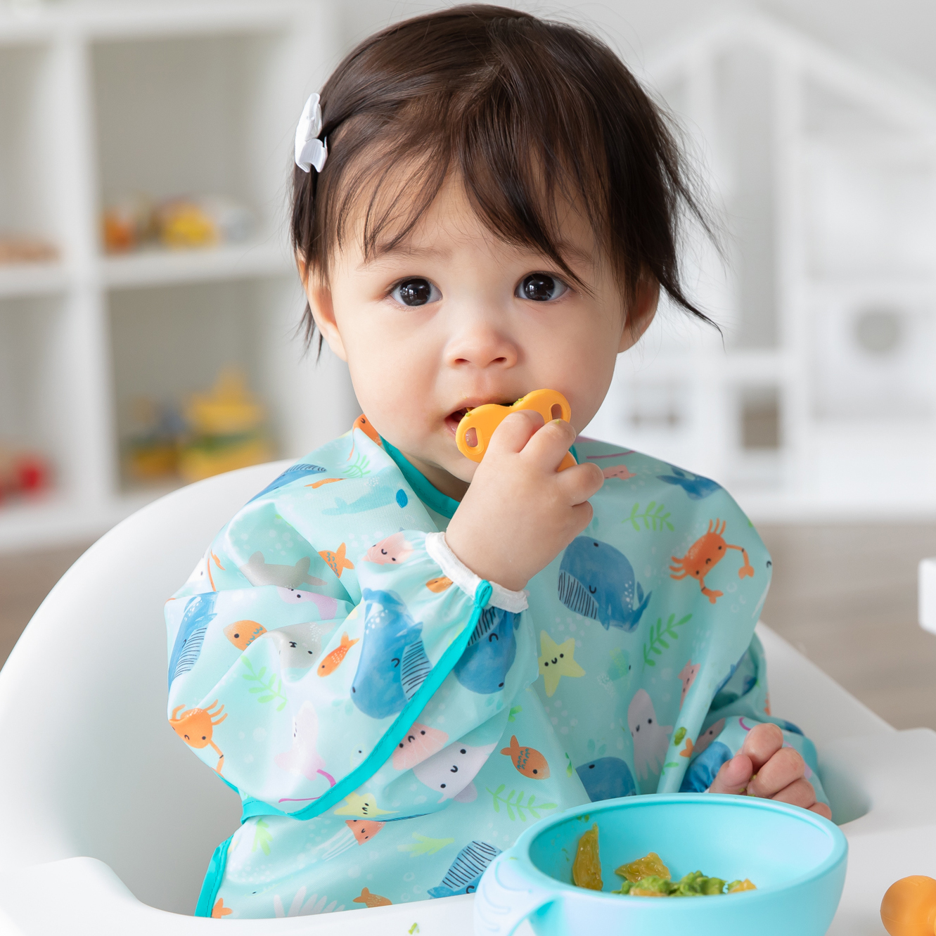 De taille généreuse et idéal pour nourrir le bébé, le bavoir à manches est fabriqué dans le tissu léger, durable et imperméable de Bumkins, qui résiste aux taches et aux odeurs. Avec une seule couche de tissu, vous n'avez pas à vous soucier de la prolifération de substances indésirables entre les couches. Ajustez la taille de votre enfant grâce à la fermeture à l'arrière et aux poignets élastiques. Une grande poche attrape-tout permet de contenir les éclaboussures, les miettes et bien plus encore. Essuyable et lavable en machine, elle se nettoie facilement pour que vous puissiez l'utiliser encore et encore !